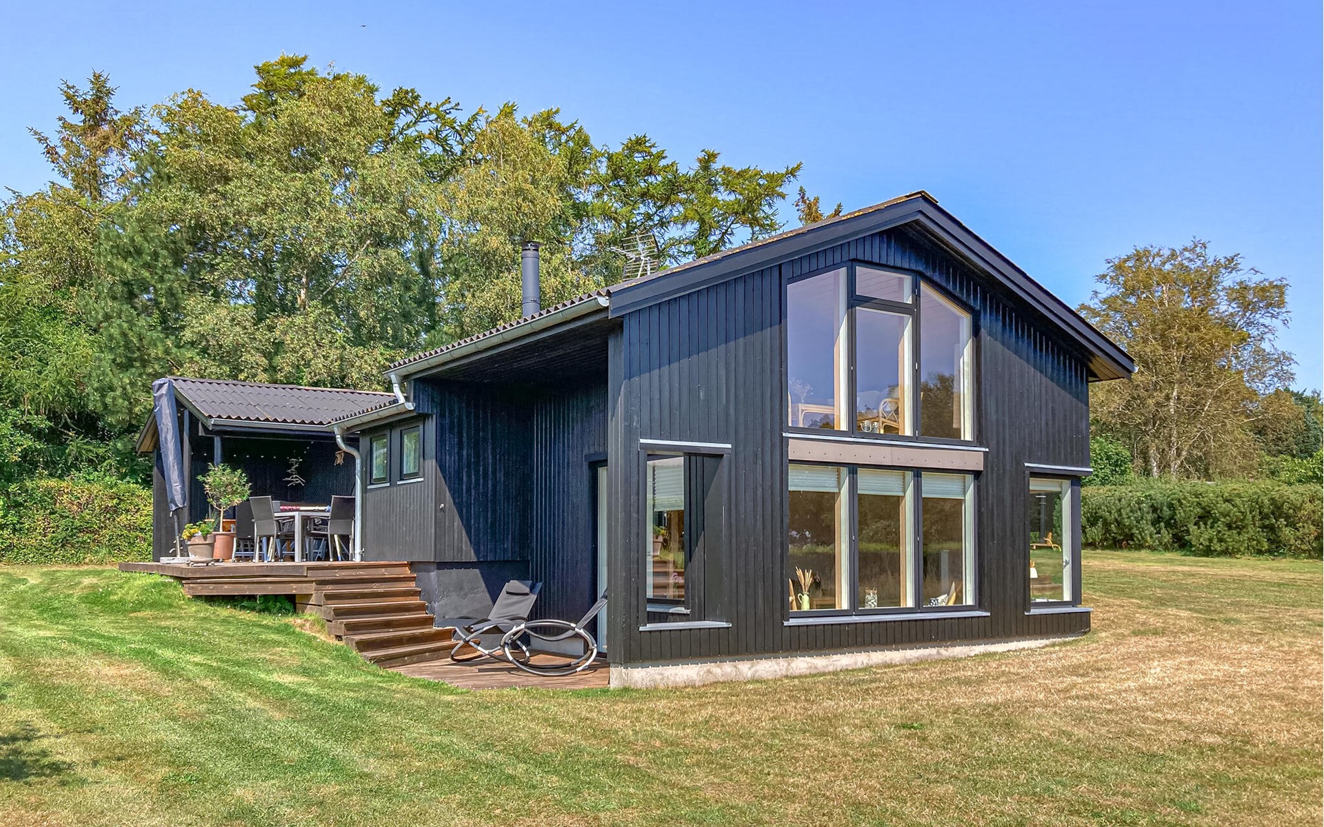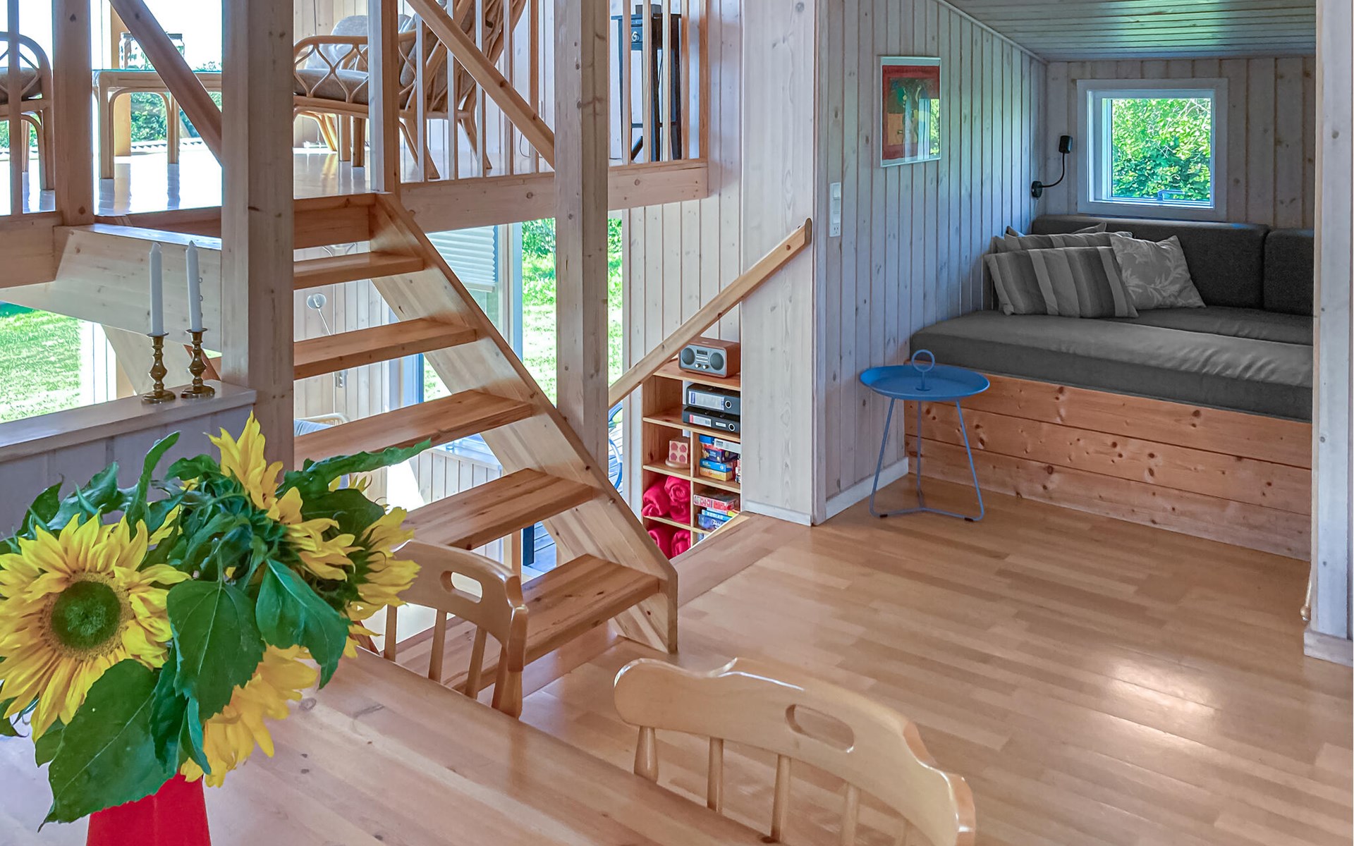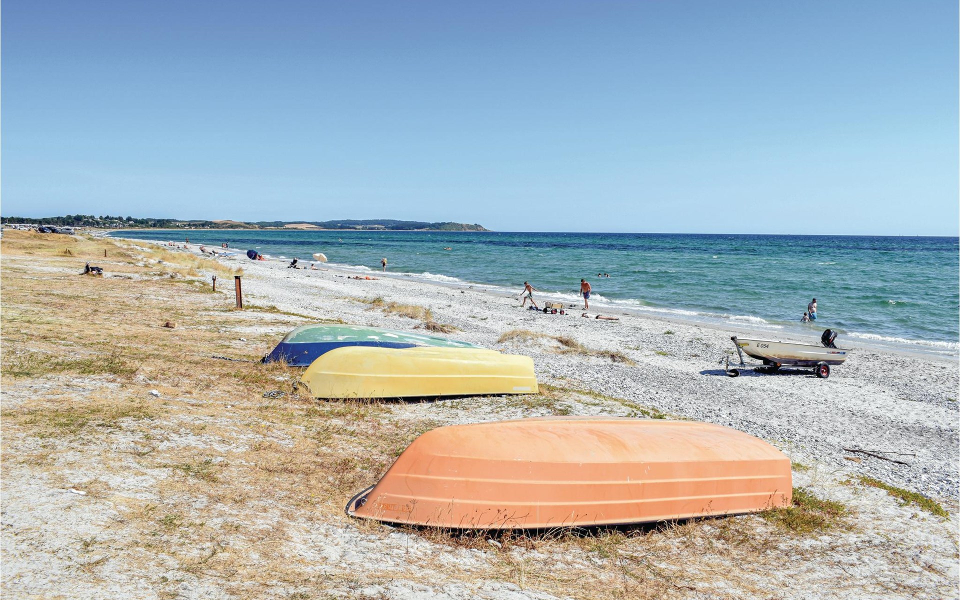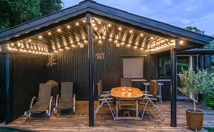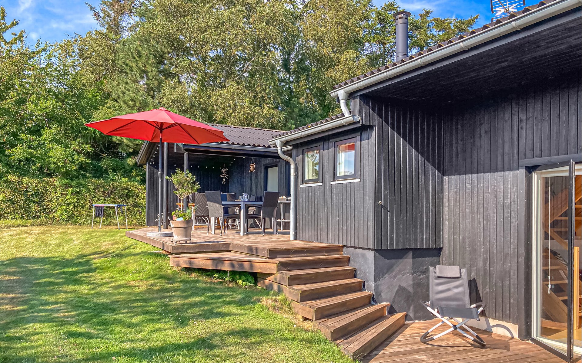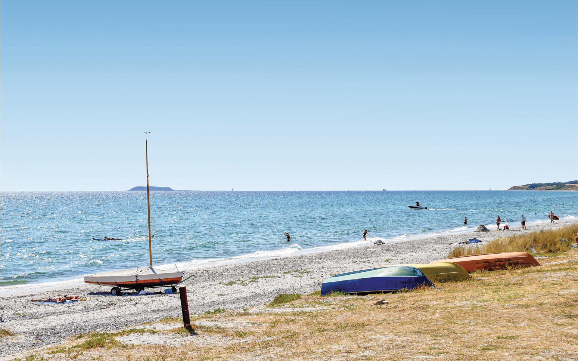 Completely renovated cottage with a view of the island of Hjelm. The beautiful property is located only 300 m from the beautiful swimming and fishing beach. There is also a good slip for your own boat. At the cottage there is a fish cleaning place. Living room is laid out on 2 levels and therefore you can easily spend your free time here. You will always find a quiet corner or a place for a board game. You can also enjoy the outdoor life on the large wooden terraces around the whole house. There is a hammock on the terrace. The property is large and is also suitable for playing soccer. There is a German TV channel. In the garden you have views from several tranquil corners.
