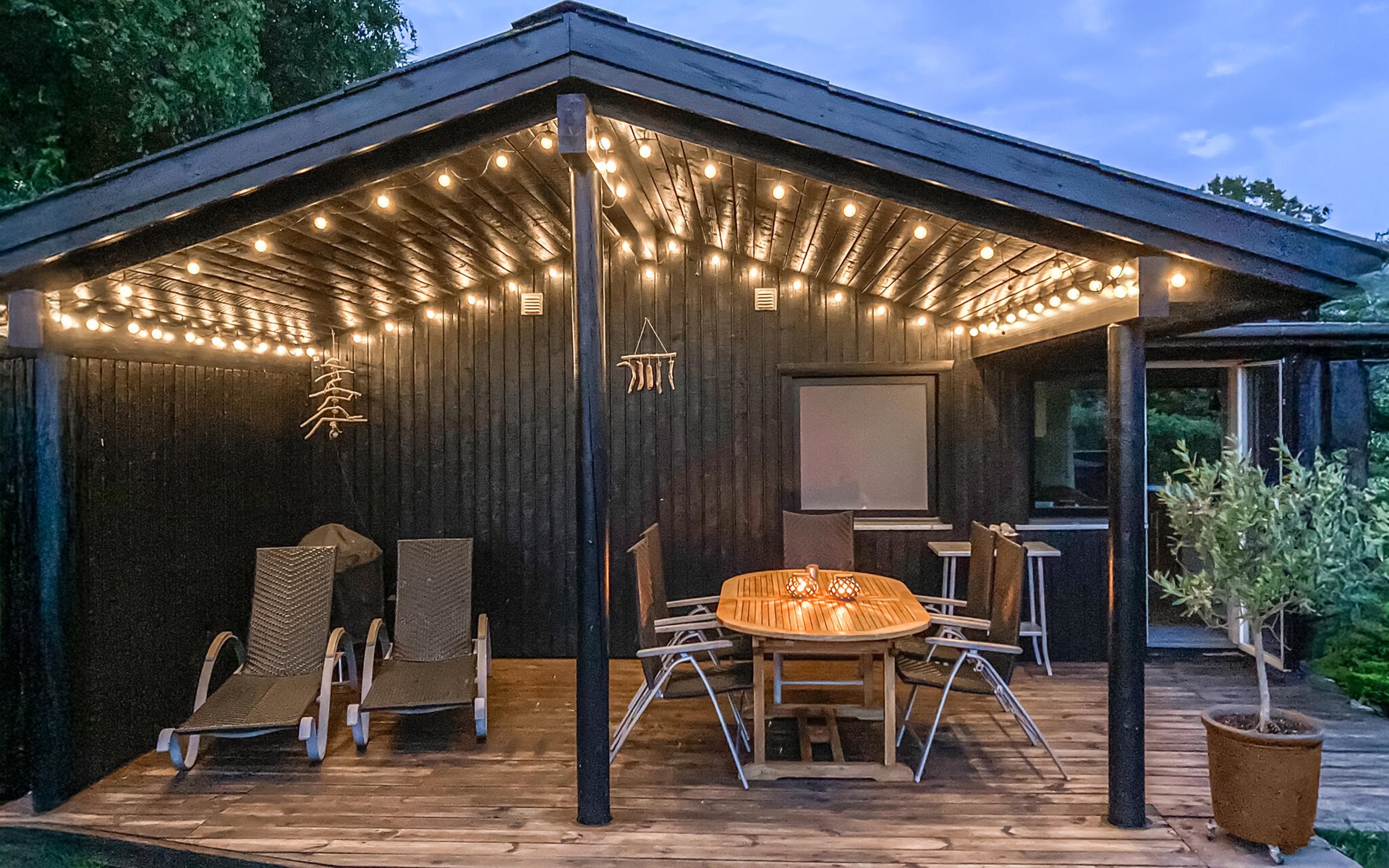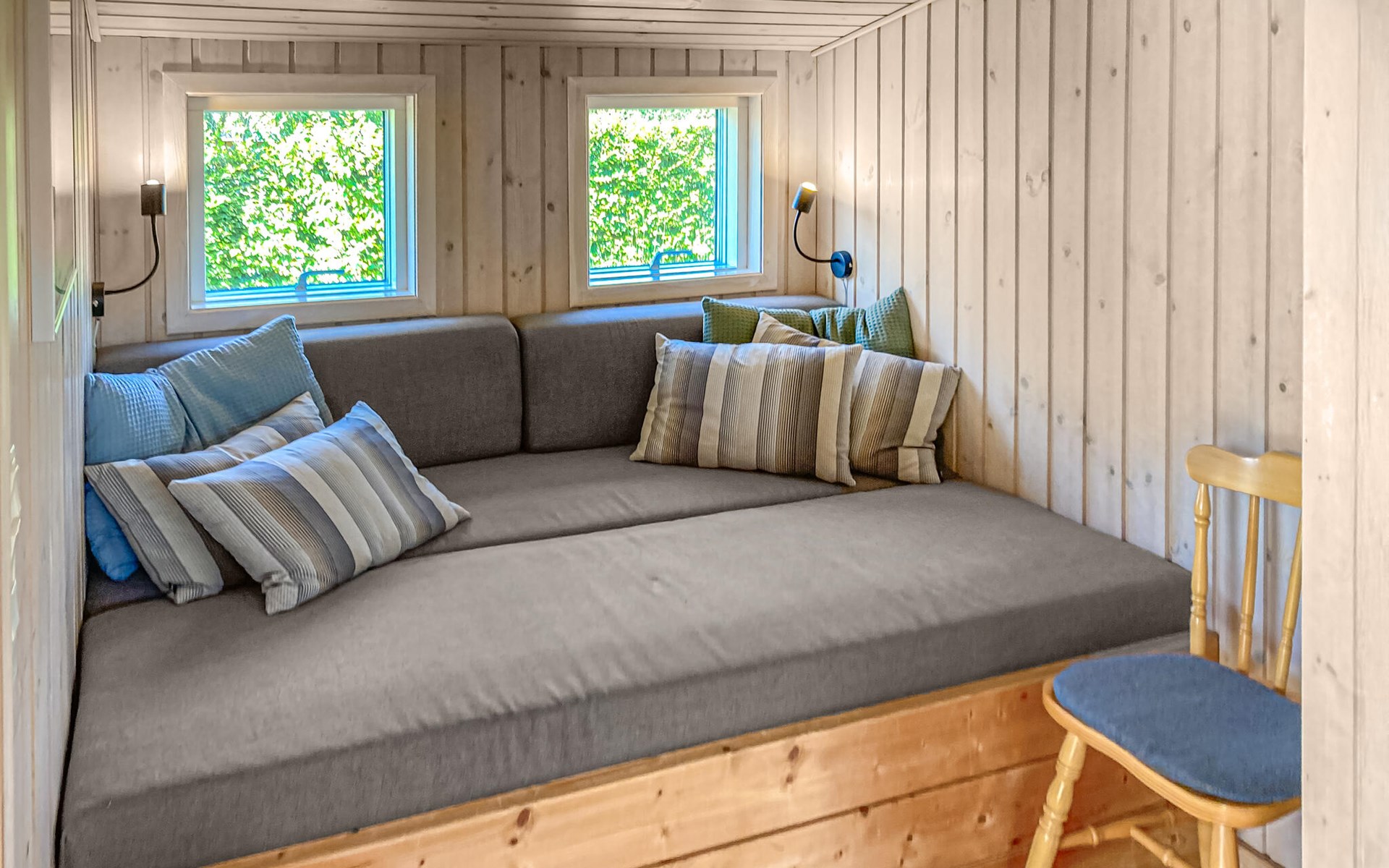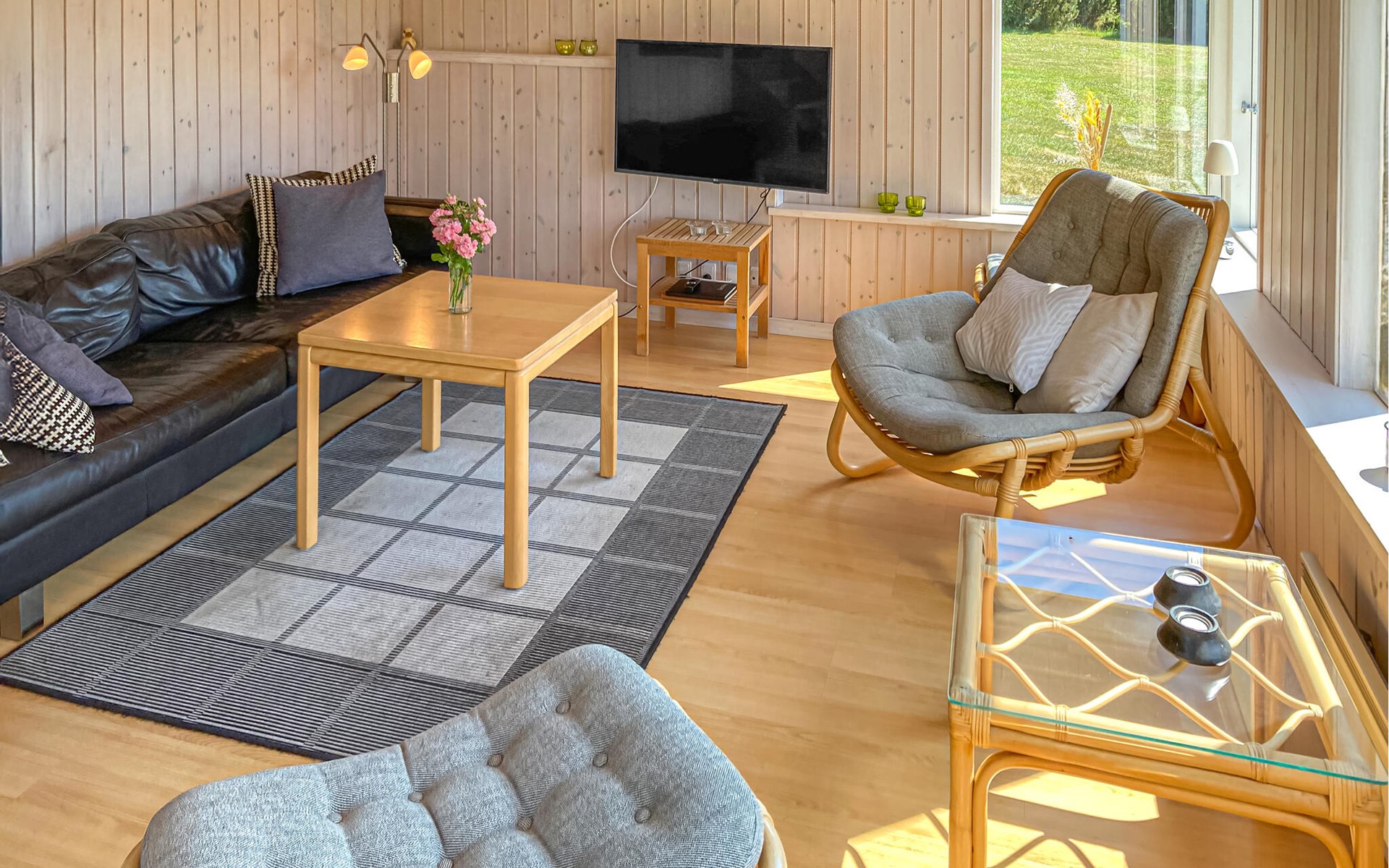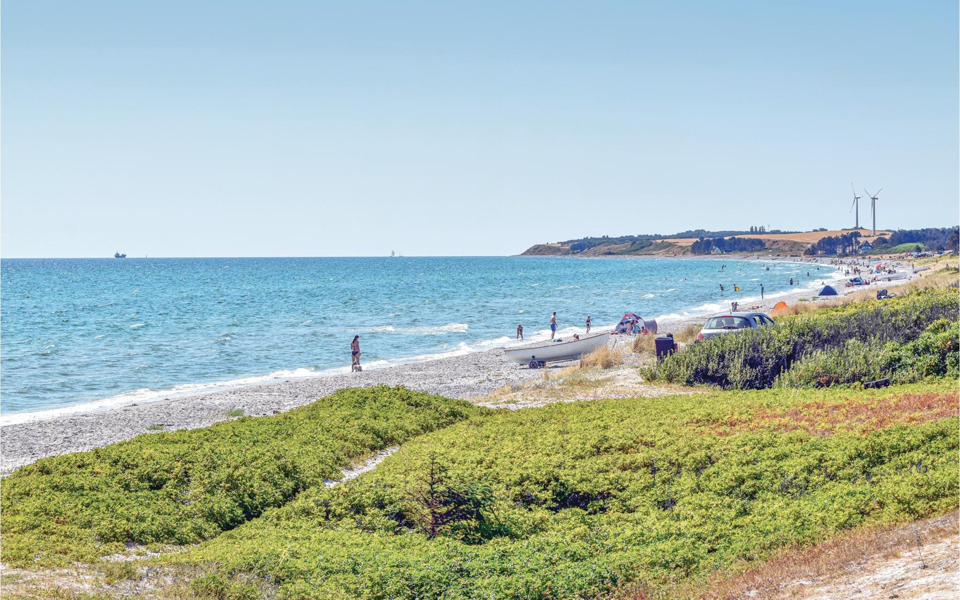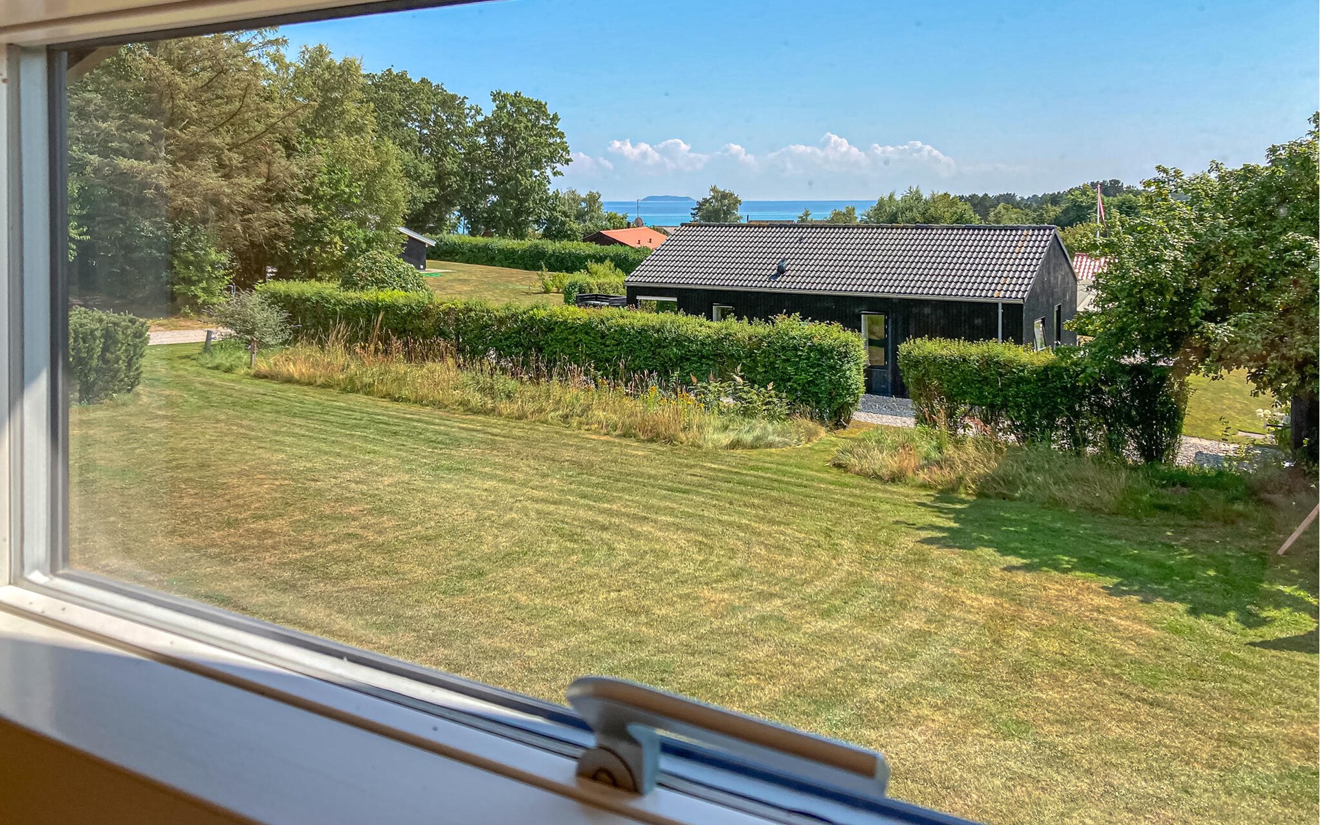 Completely renovated cottage with a view of the island of Hjelm. The beautiful property is located only 300 m from the beautiful swimming and fishing beach. There is also a good slip for your own boat. At the cottage there is a fish cleaning place. Living room is laid out on 2 levels and therefore you can easily spend your free time here. You will always find a quiet corner or a place for a board game. You can also enjoy the outdoor life on the large wooden terraces around the whole house. There is a hammock on the terrace. The property is large and is also suitable for playing soccer. There is a German TV channel. In the garden you have views from several tranquil corners.