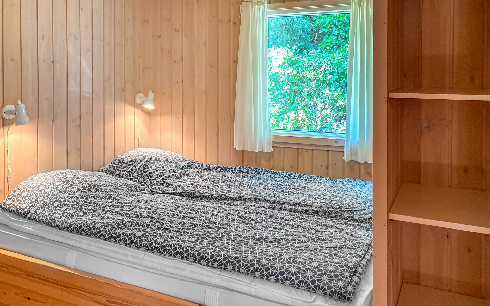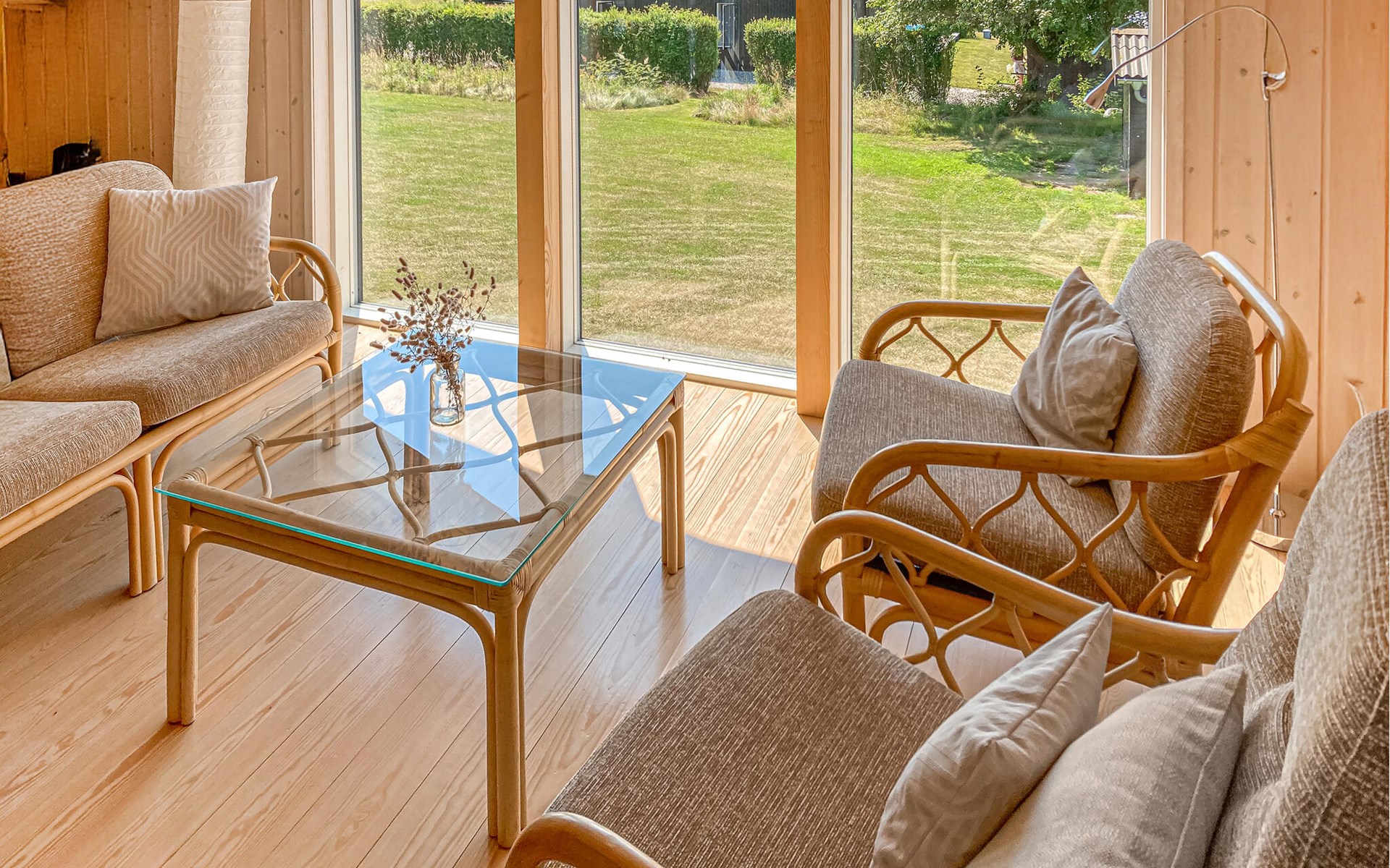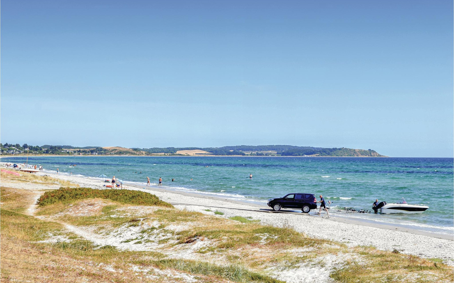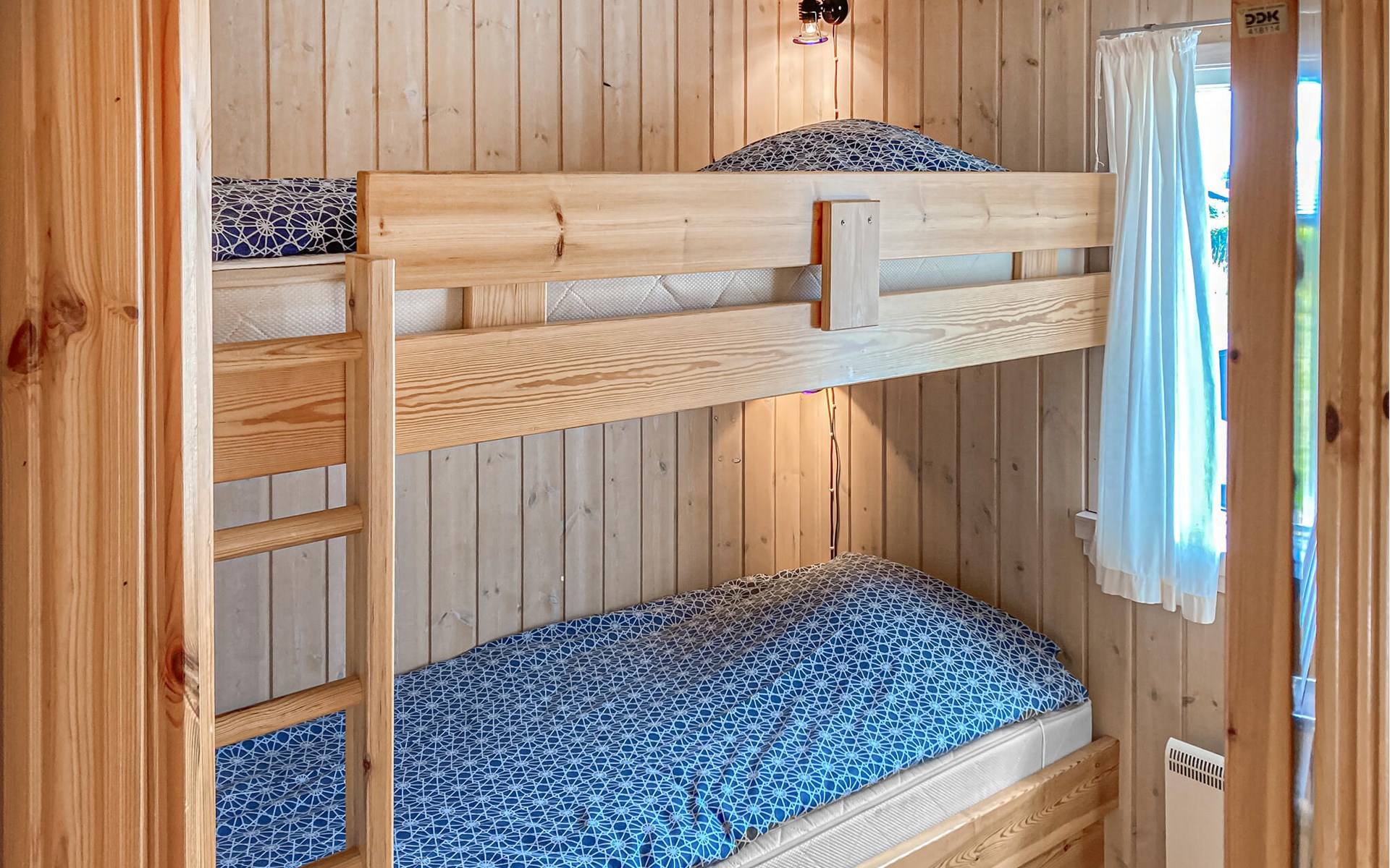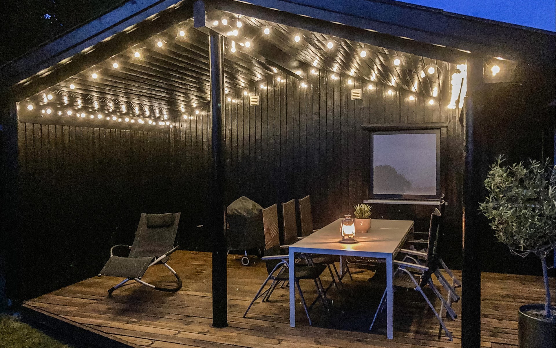 Completely renovated cottage with a view of the island of Hjelm. The beautiful property is located only 300 m from the beautiful swimming and fishing beach. There is also a good slip for your own boat. At the cottage there is a fish cleaning place. Living room is laid out on 2 levels and therefore you can easily spend your free time here. You will always find a quiet corner or a place for a board game. You can also enjoy the outdoor life on the large wooden terraces around the whole house. There is a hammock on the terrace. The property is large and is also suitable for playing soccer. There is a German TV channel. In the garden you have views from several tranquil corners.