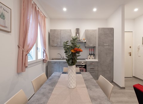 This apartment is characterised by its modern style, bright colours and loving attention to detail. The living area with comfortable sofa is a wonderful place to relax, perhaps with a glass of Italian wine or an interesting film in the evening. The practical kitchen has everything you need to prepare meals together.