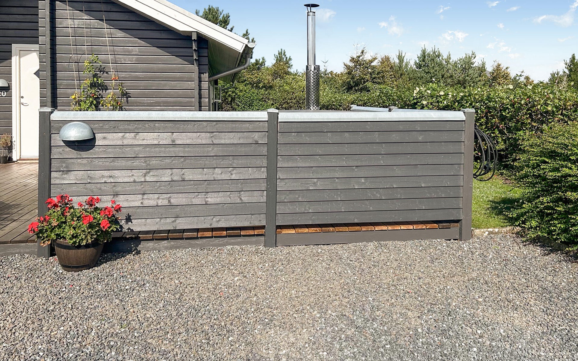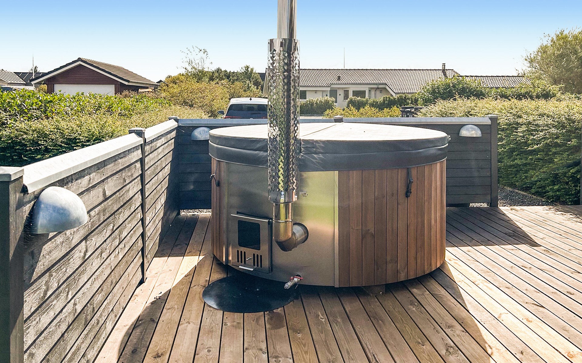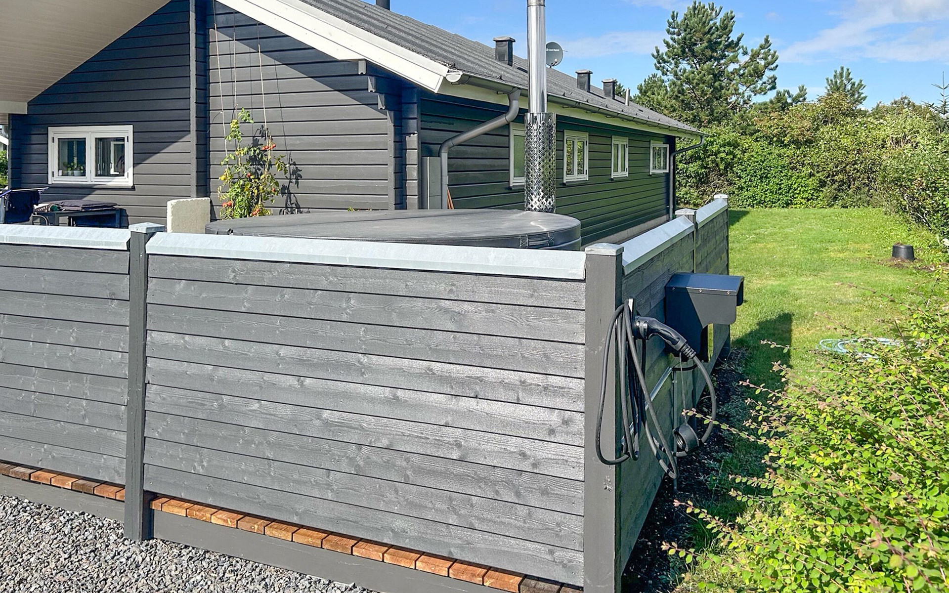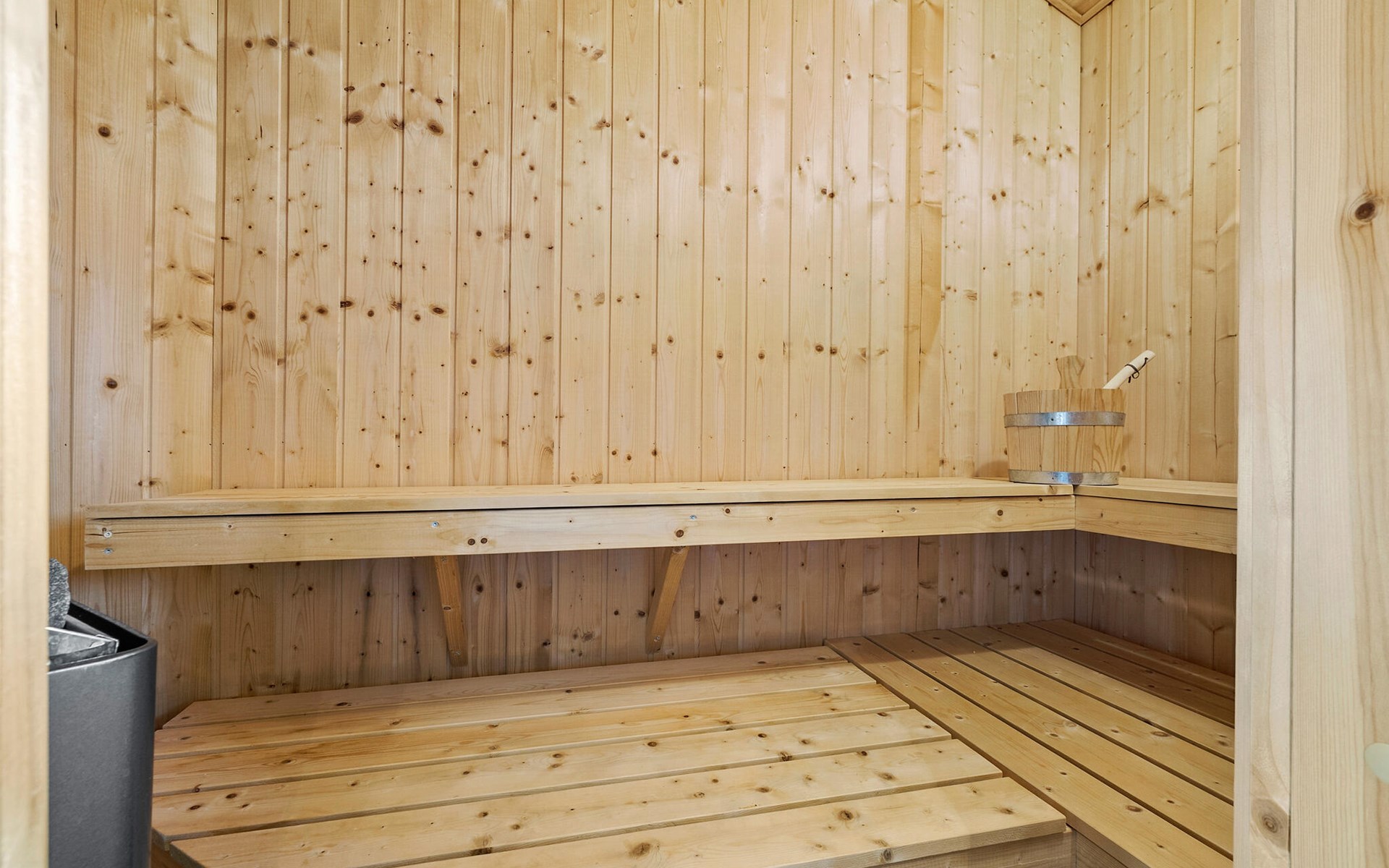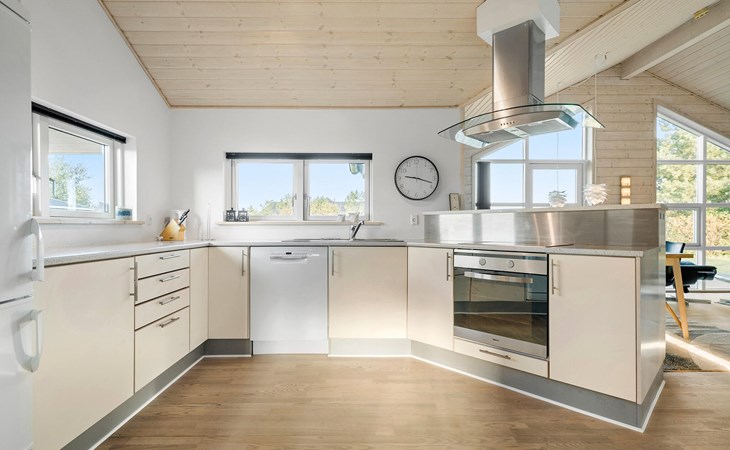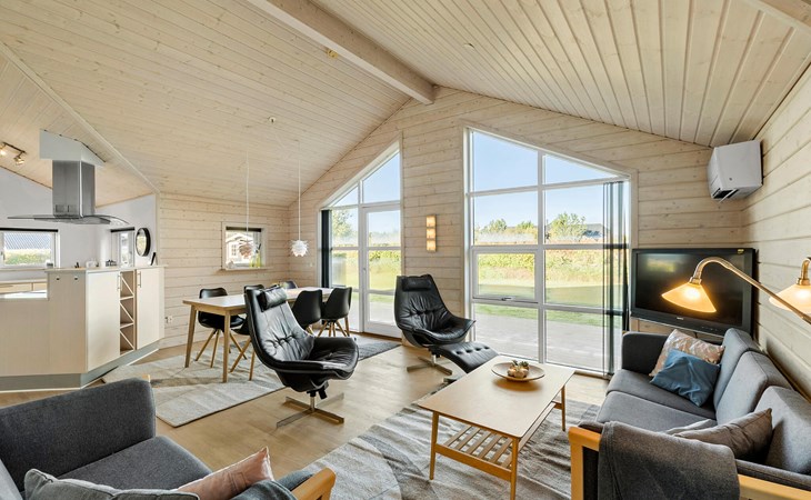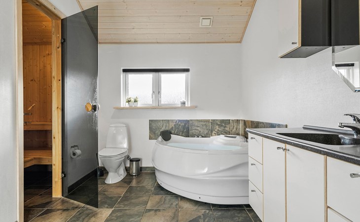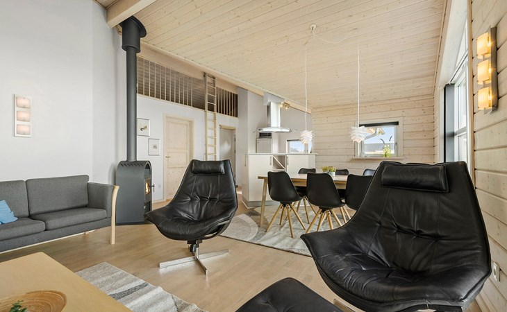 Start the day with breakfast in the bright and open-plan living area, which lets in plenty of natural light through the large windows. Make yourself comfortable on the cosy armchairs or sofa and enjoy the view of the garden or the tranquillity of the open fire. The open-plan kitchen invites you to enjoy cosy cooking evenings with the family. You can also relax in the whirlpool and enjoy the cosy warmth of the private sauna.