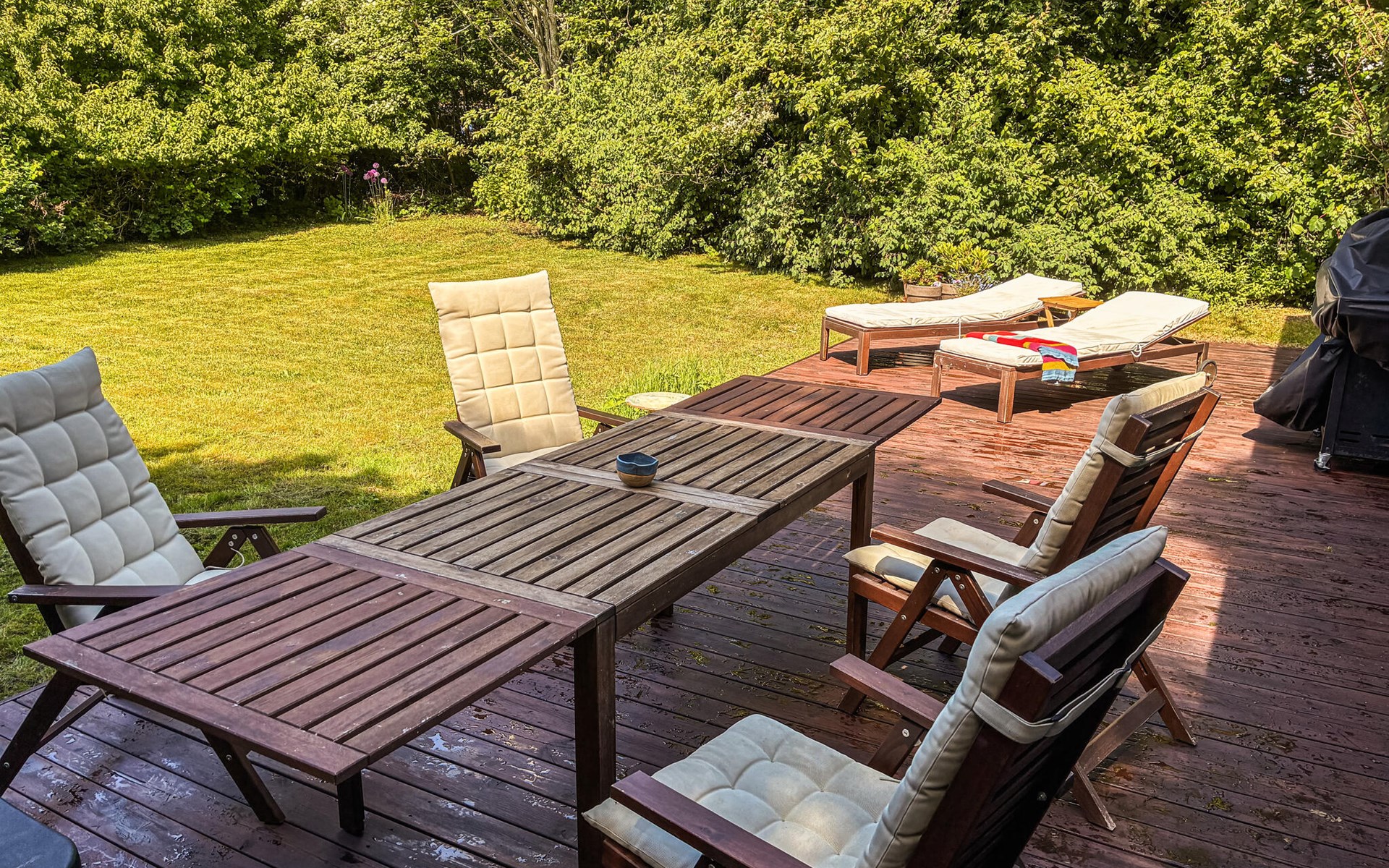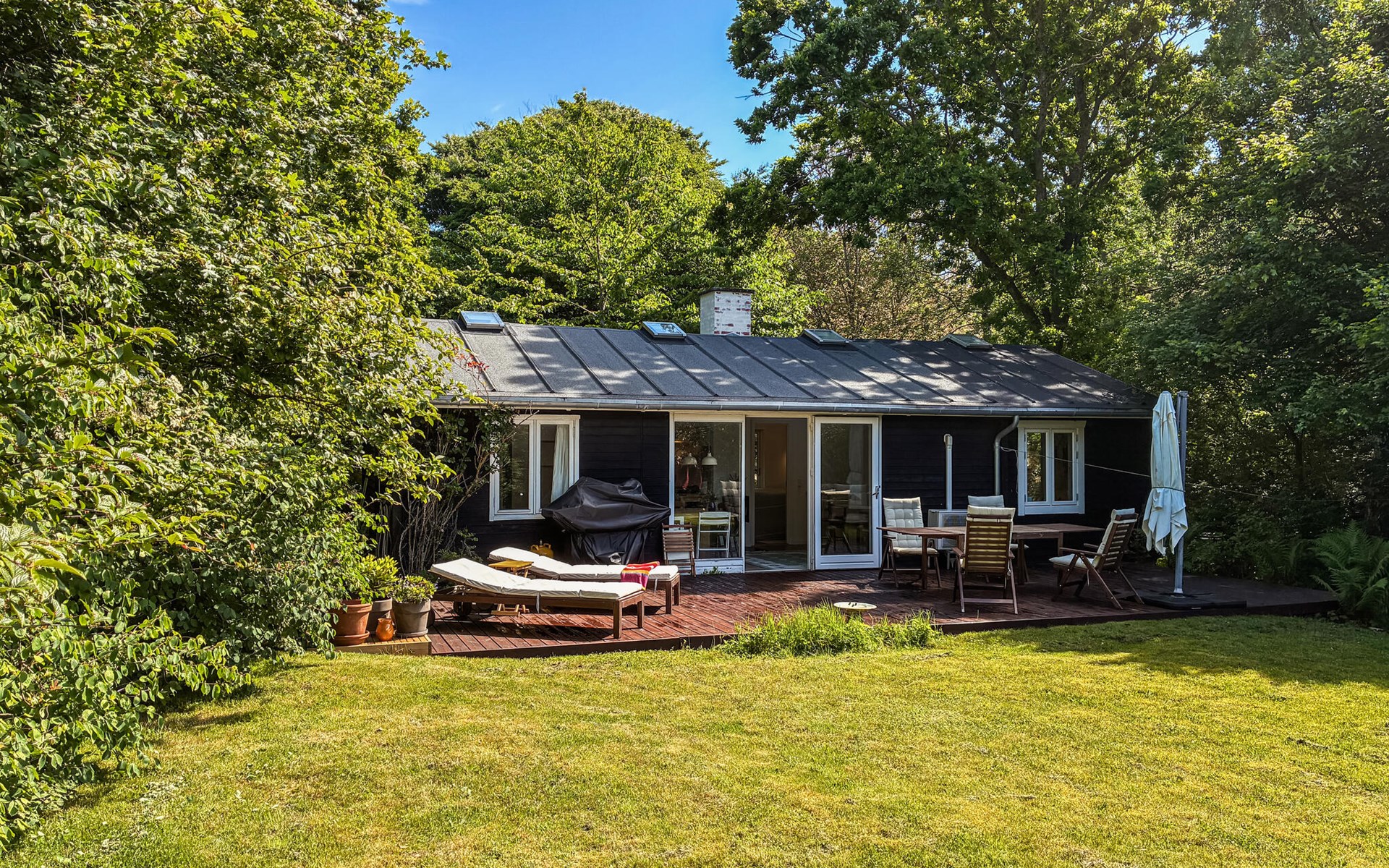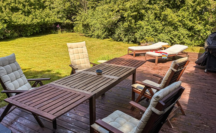 Spend your time in the large garden, which offers plenty of space to relax with trees, lawn and several terrace areas. Lie down on the sun loungers or enjoy your meals outdoors. End the day with a glass of wine in the shade or read a book in one of the sheltered corners of the property.