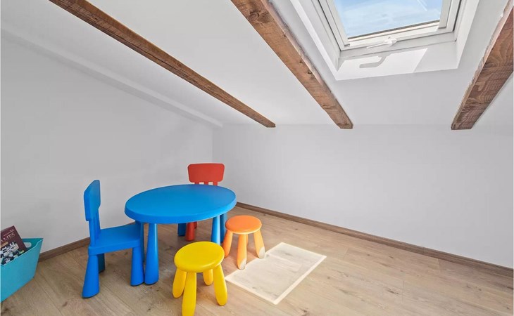 On the elegantly furnished first floor of Villa Penelope there are 2 bedrooms, 2 bathrooms, a guest toilet and a spacious open plan living area with a fully equipped kitchen and dining area. The living area offers direct access to the terrace with an outdoor dining area. The remaining 3 bedrooms and 2 bathrooms are located on the second floor as well as a smaller living area and a kitchen with breakfast bar. Another room has been converted into a playroom for smaller children with a table and chairs.
