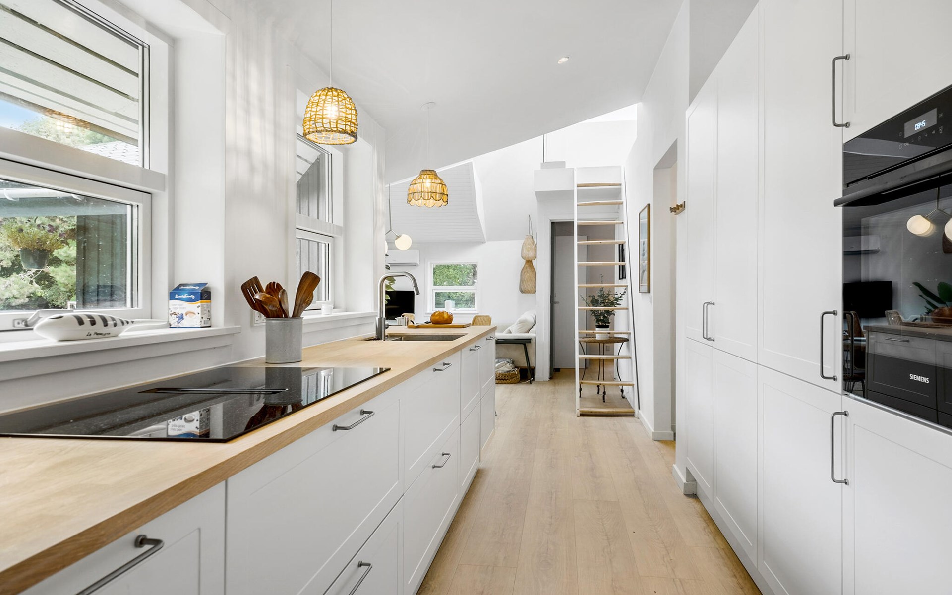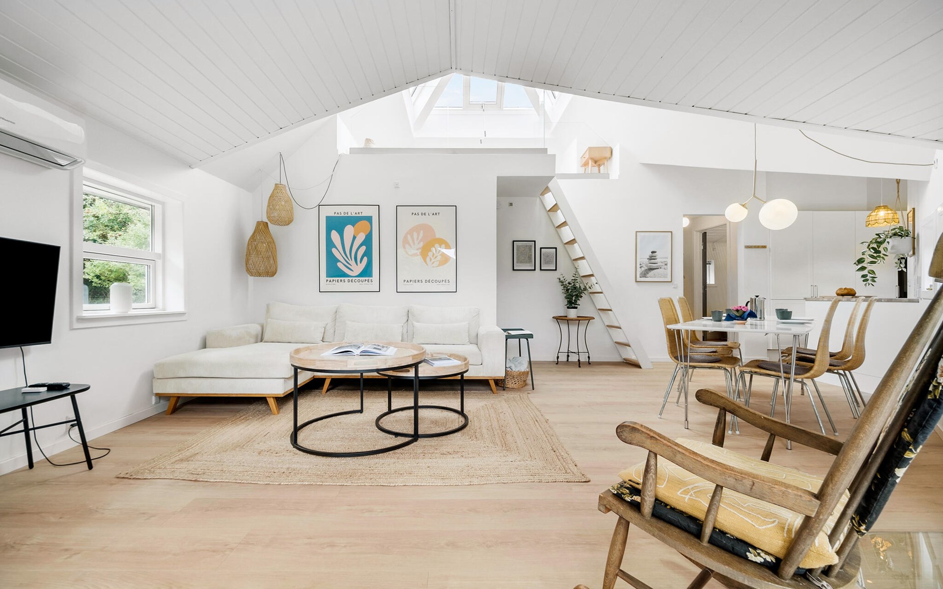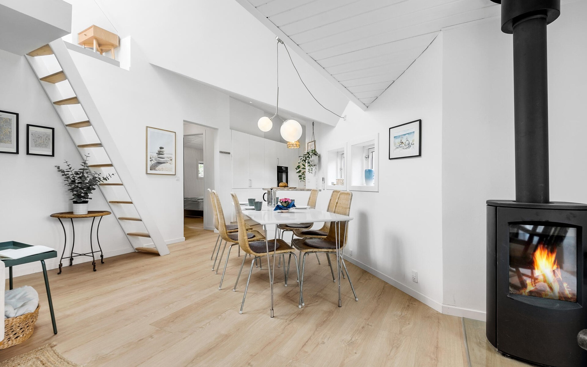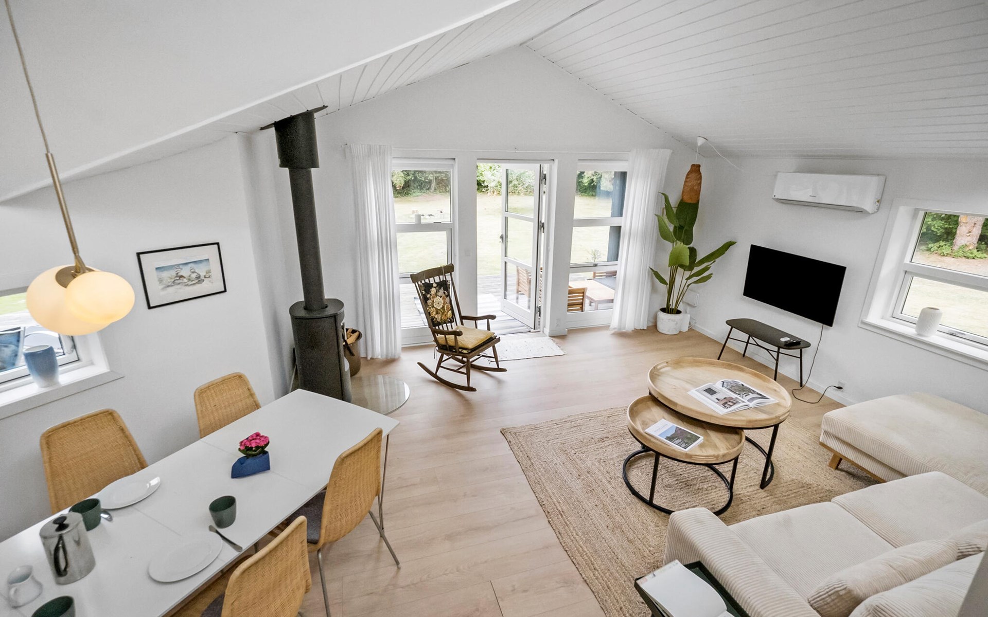 This pretty vacation home awaits you in peaceful, natural surroundings. It has an original design and offers stylish, high-quality furnished rooms throughout. The heart of the house is the spacious living room with open kitchen. Spend sociable evenings here at mealtimes, entertain yourself with board games and make yourself comfortable in the armchair in front of the wood-burning stove with your favorite book in the cold season. In the open sleeping loft you will find a peaceful oasis for relaxing hours of reading and enjoy a wonderful view of the starry sky on a clear day.