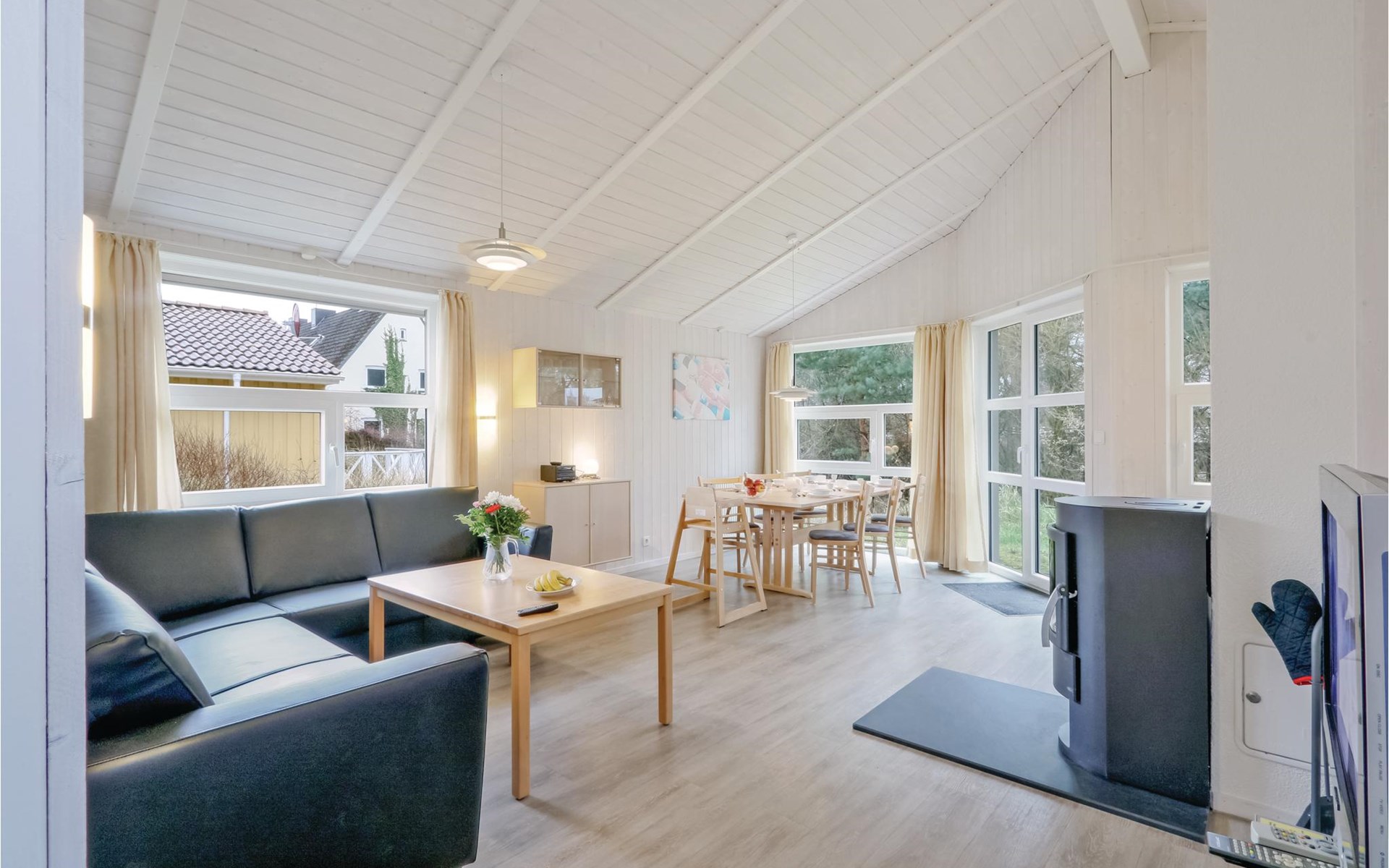 In the living room, a wood-burning stove ensures that a very special atmosphere is conjured up by the crackling fire, especially in the cold season - and everyday life soon seems far away.