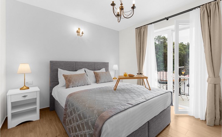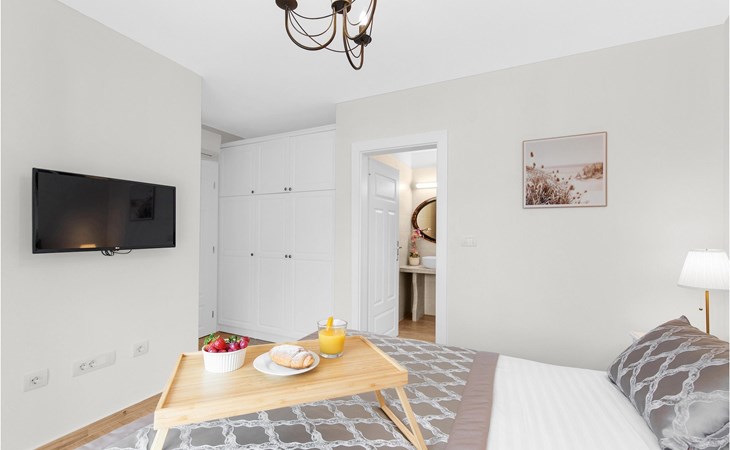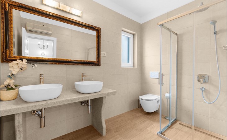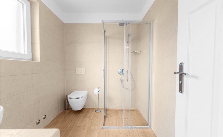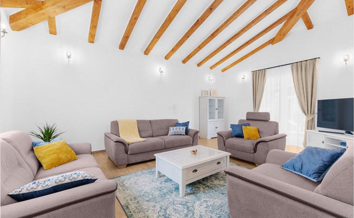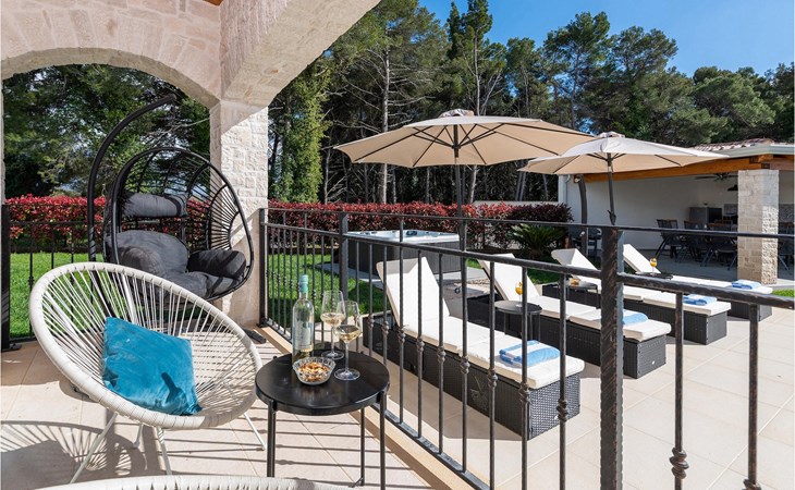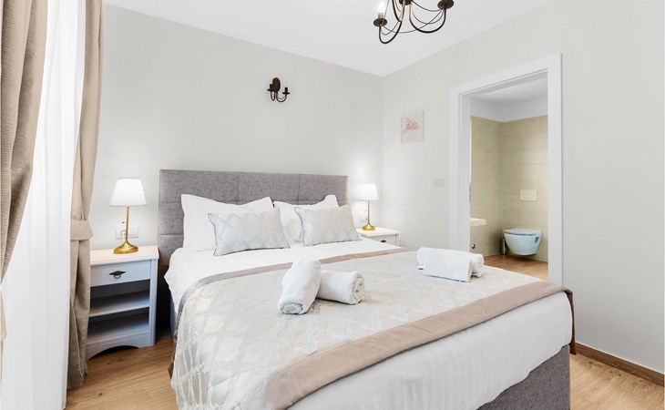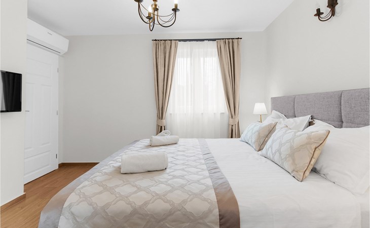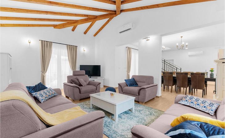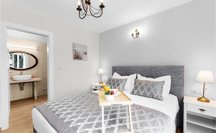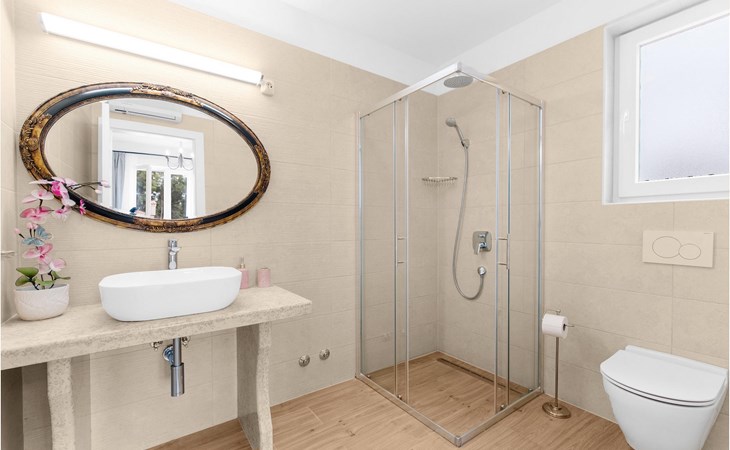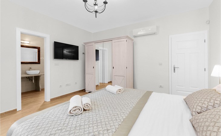 Enter the living area of Villa LaDora from the terrace and feel at home in the bright, open-plan living room with dining area and fully equipped kitchen. Two chic bedrooms with double beds, each with an extra bed and en-suite bathroom as well as a separate toilet complete the first floor. The upper floor consists of two further bedrooms with comfortable double beds and en-suite bathrooms. All rooms are air-conditioned and equipped with TV.