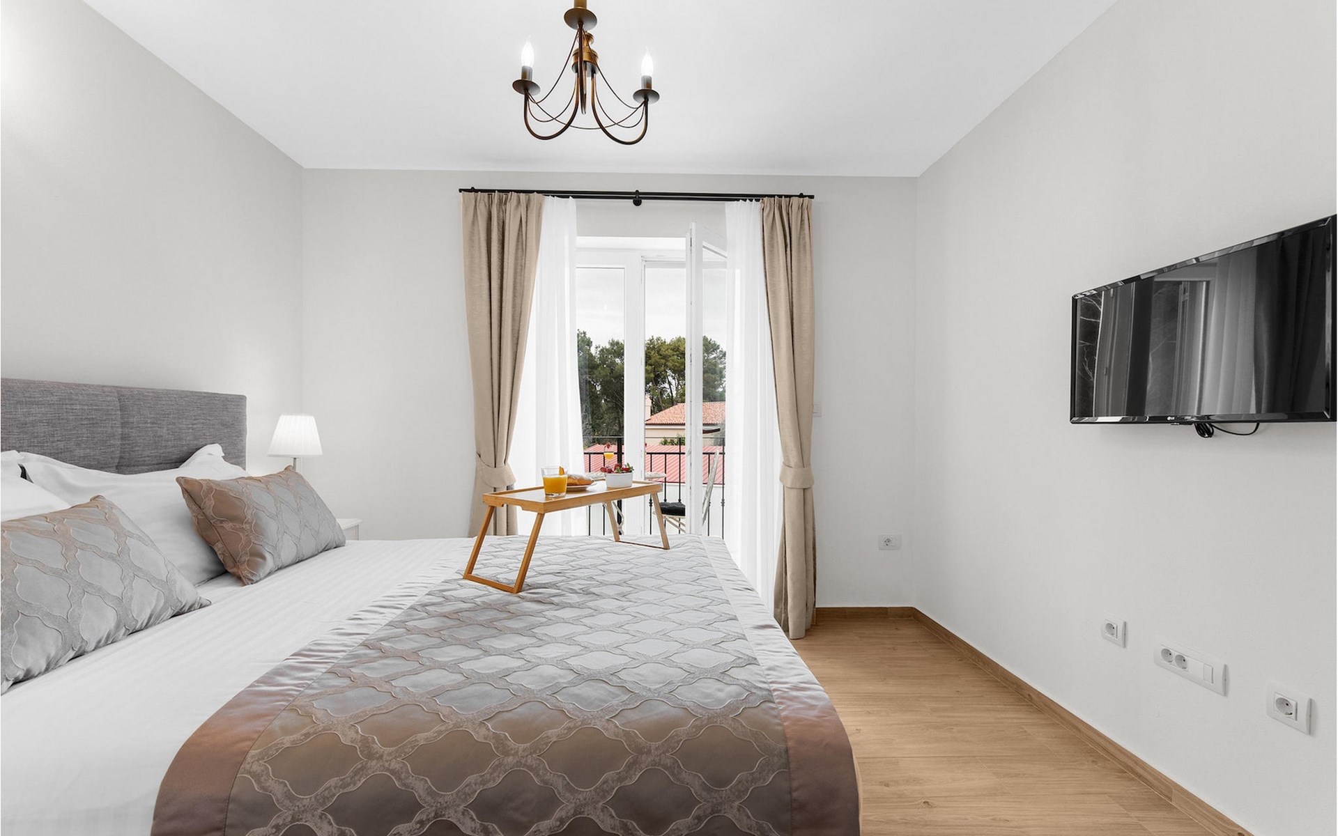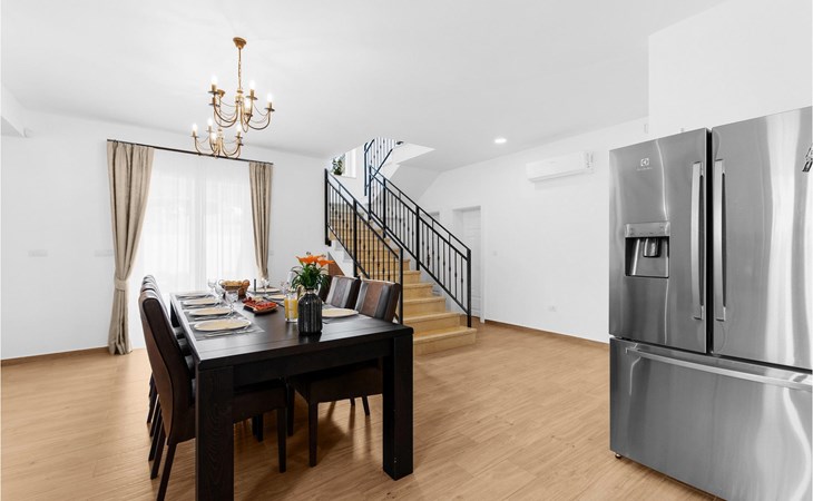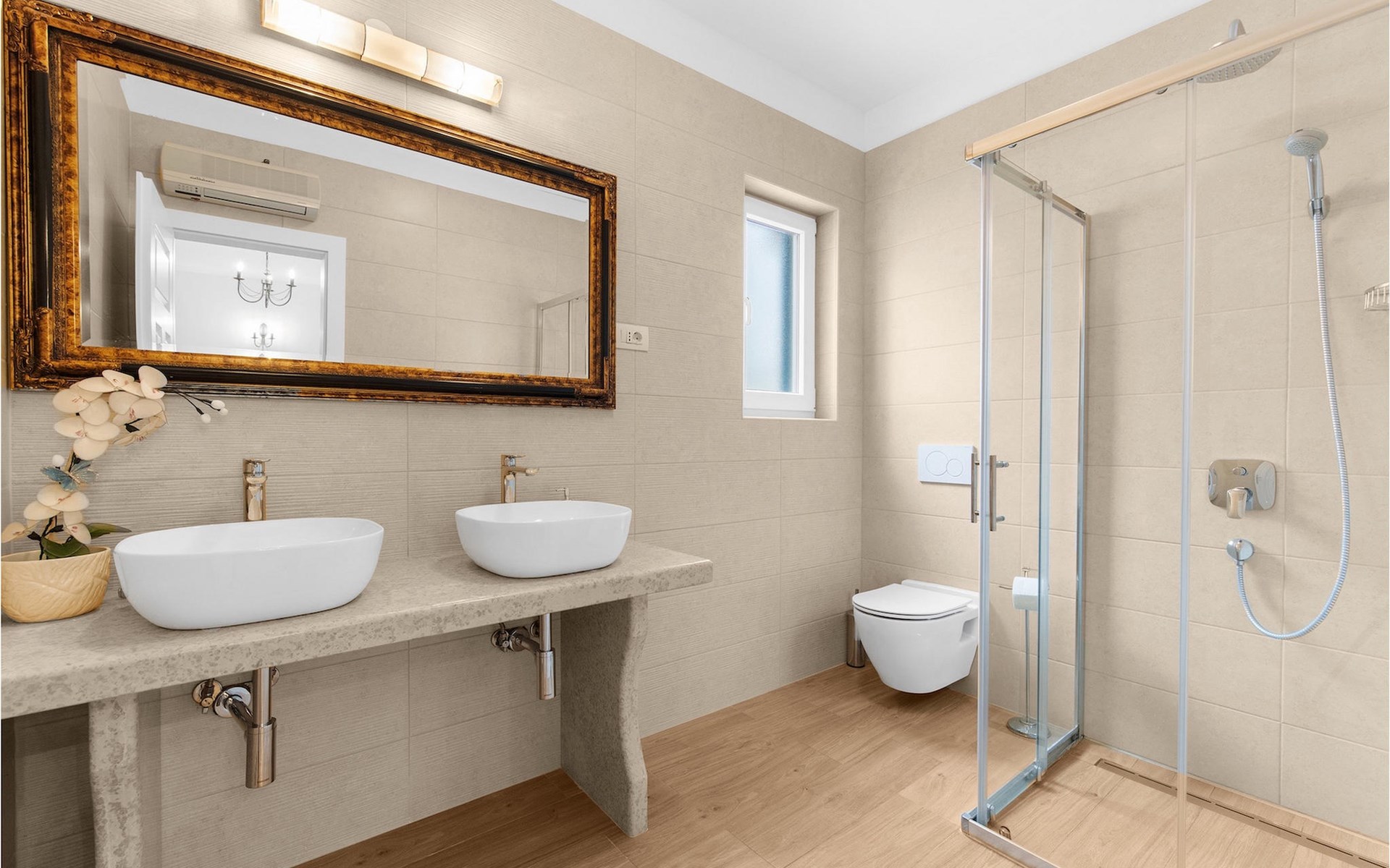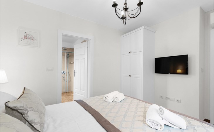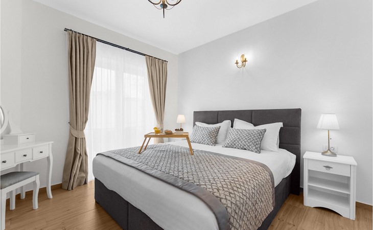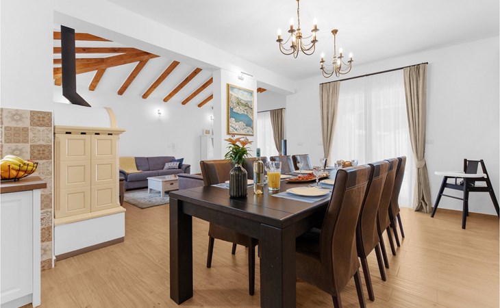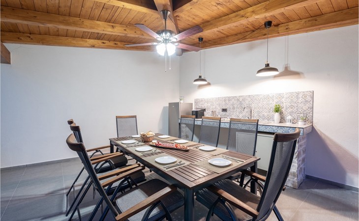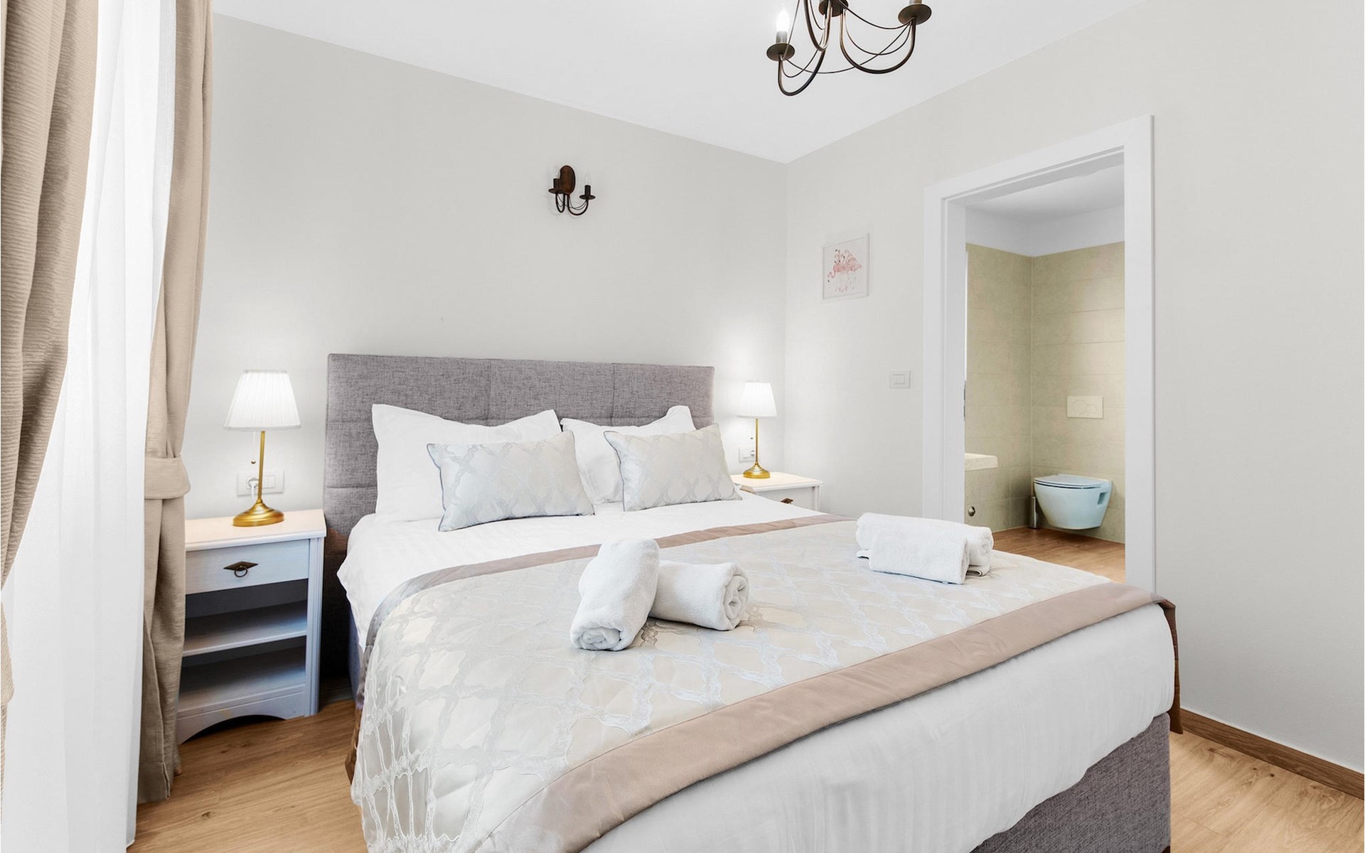 Enter the living area of Villa LaDora from the terrace and feel at home in the bright, open-plan living room with dining area and fully equipped kitchen. Two chic bedrooms with double beds, each with an extra bed and en-suite bathroom as well as a separate toilet complete the first floor. The upper floor consists of two further bedrooms with comfortable double beds and en-suite bathrooms. All rooms are air-conditioned and equipped with TV.