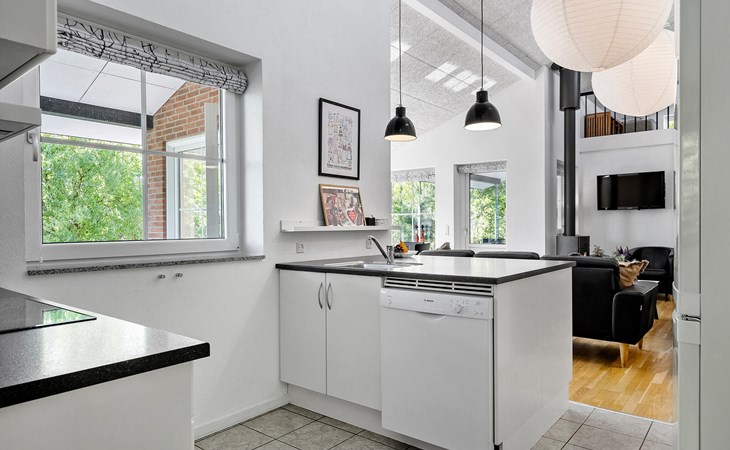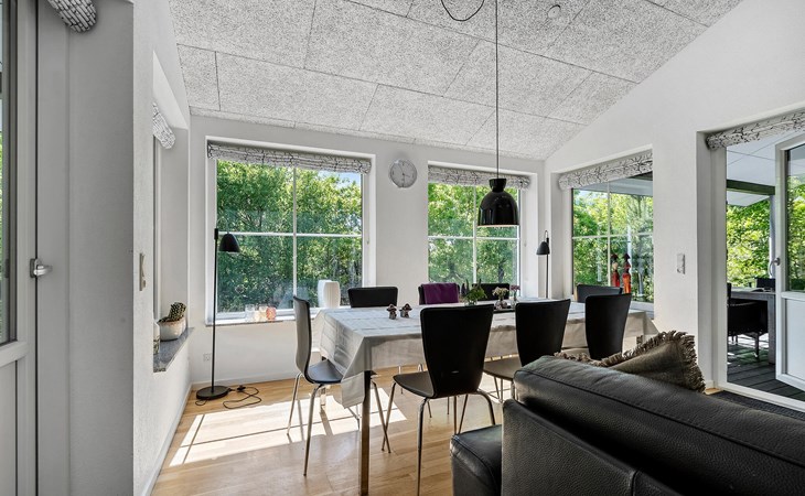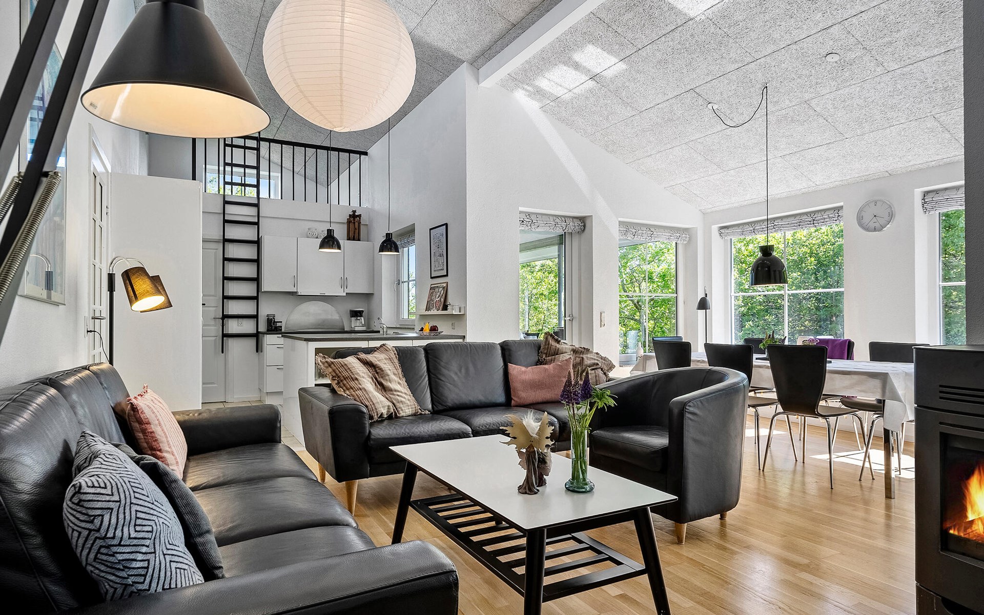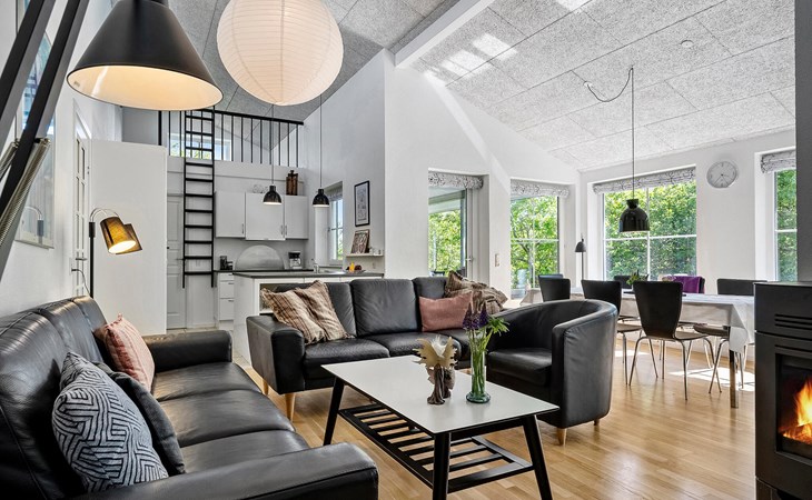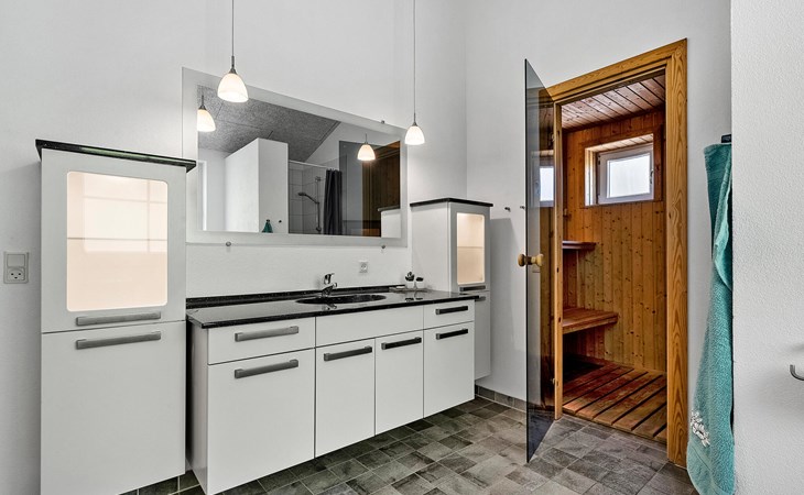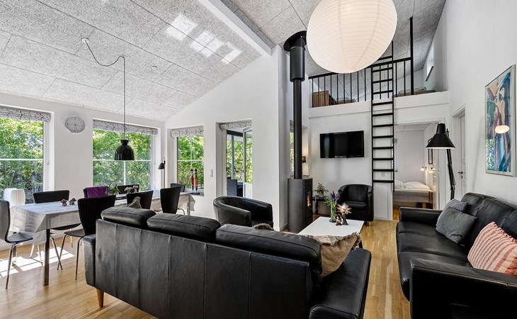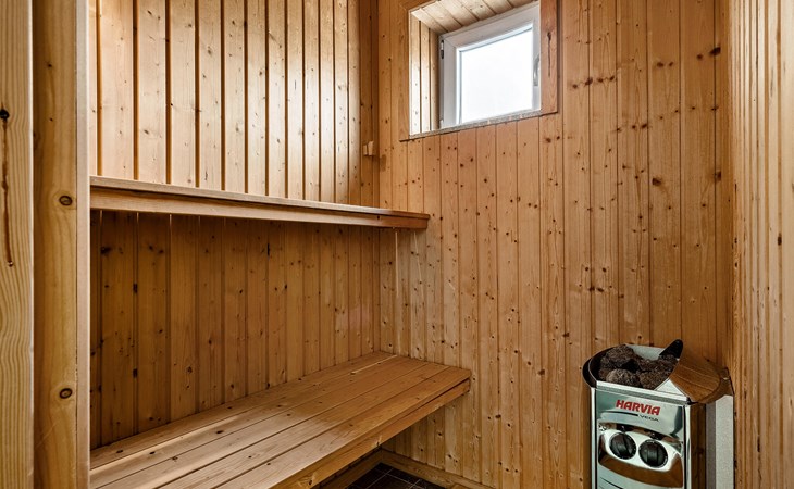 Nestled in a cosy natural setting, you will enjoy plenty of privacy and numerous extras for the whole family to enjoy in this comfortable home. Chat with your loved ones while cooking in the open-plan kitchen and enjoy the elegant ambience in the bright living area while the wood-burning stove crackles softly. Treat yourself to soothing moments in the sauna or whirlpool and gather together for cosy film evenings on the inviting sofa area.