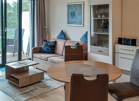 A small highlight is the bathroom, your personal small wellness area with steam bath and integrated rain shower, which can also be accessed with a wheelchair. The feel-good programme continues in the living area, as the flickering flames of the bioethanol fireplace bathe the room in a particularly cosy light. In the kitchen, coffee lovers will find a Nespresso machine (please bring your own capsules), as well as a thermos flask and hand filter for brewing your own coffee if you prefer the classic filter coffee.