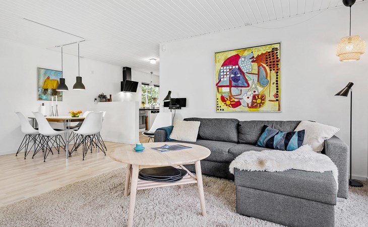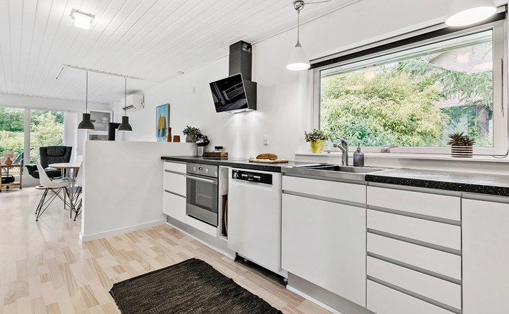 On Skæring Strand, this charming holiday home welcomes you to a relaxing holiday with lots of great excursion options. Enjoy your breakfast at the stylish dining table and let your gaze wander over the well-tended garden. The interior is both comfortable and elegant. In the light-flooded living room, you can cosy up on the sofa or relax in the comfortable armchairs. A fireplace provides cosy warmth on cooler evenings.