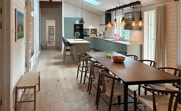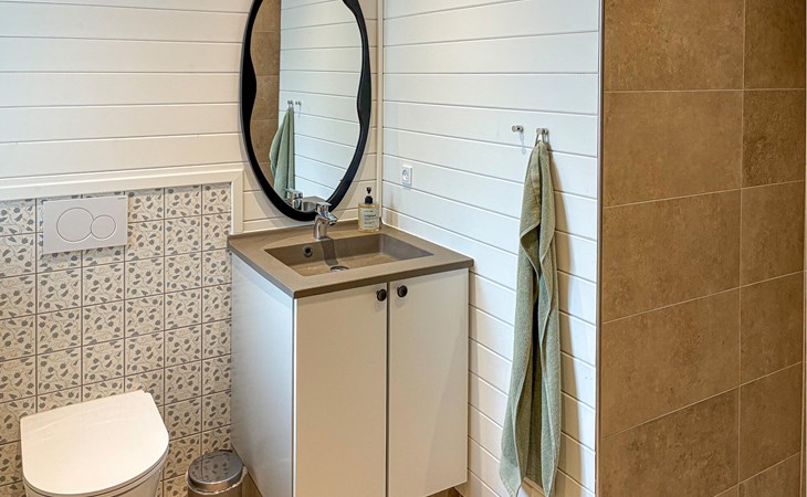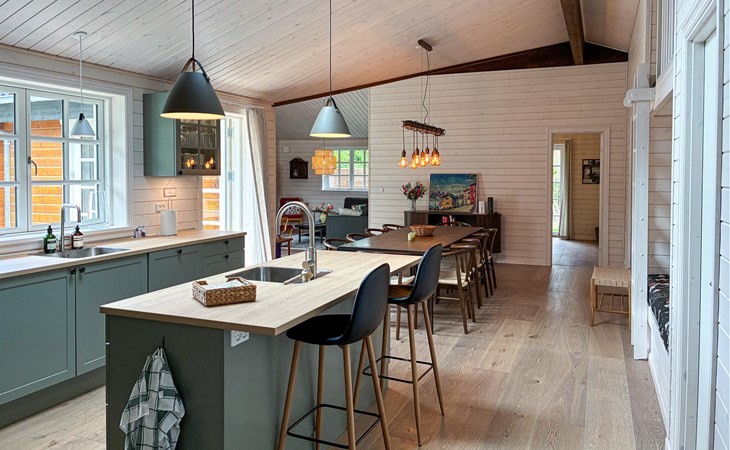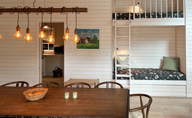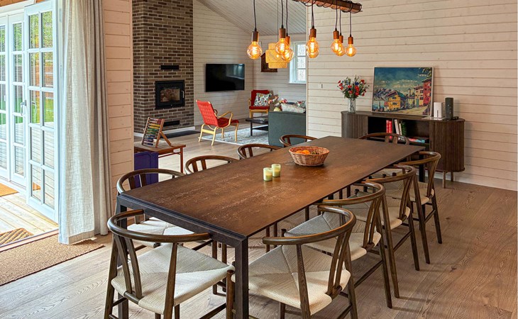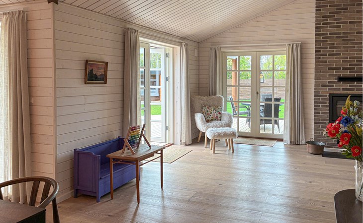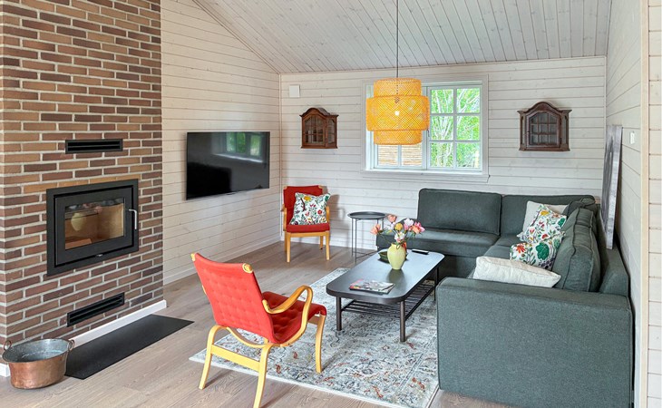This house combines Nordic charm and modern cosiness to create a harmonious whole. Wood-panelled walls, natural colours and lovely details create a warm, homely atmosphere. Make yourself comfortable in the cosy living area by the fireplace, read a good book or enjoy a cup of coffee. Prepare delicious meals together in the modern, open-plan kitchen and then round off the day in a relaxed atmosphere.
