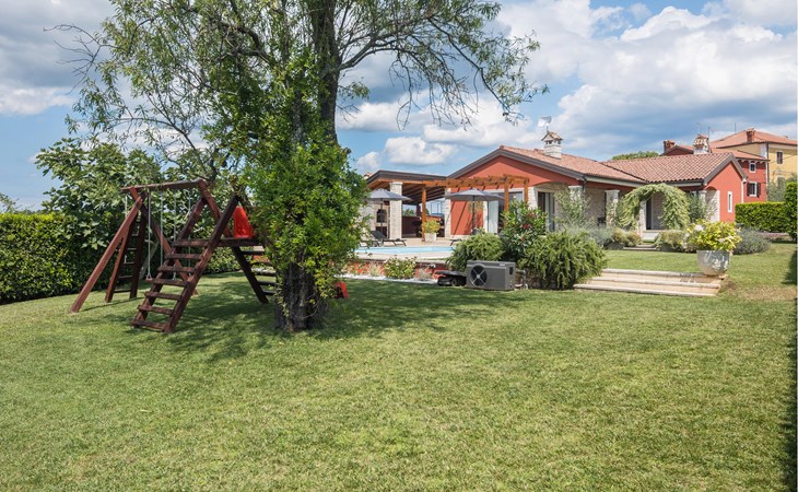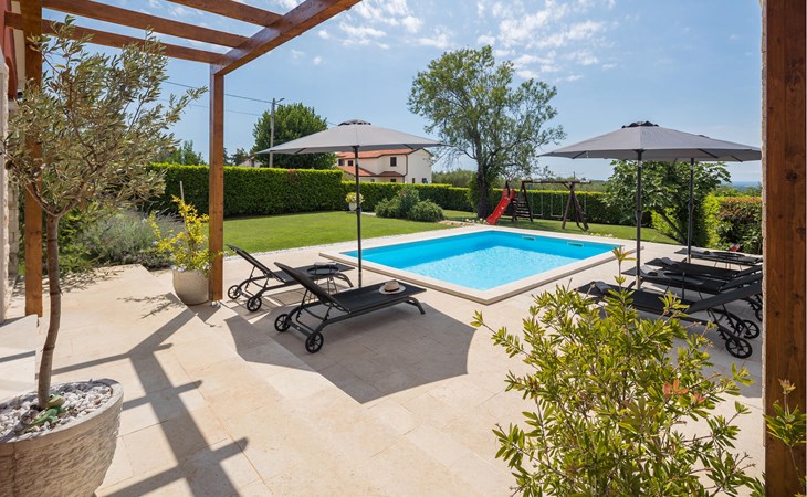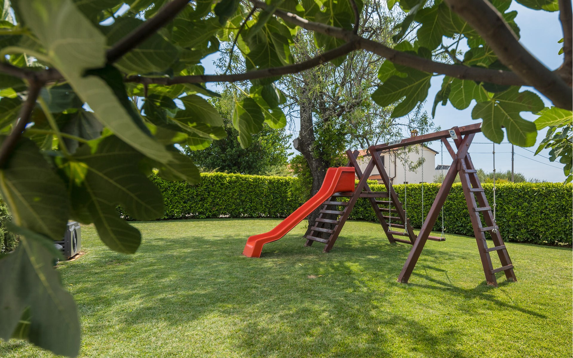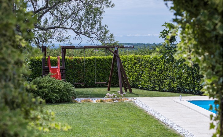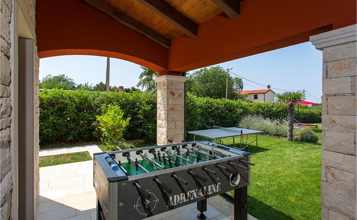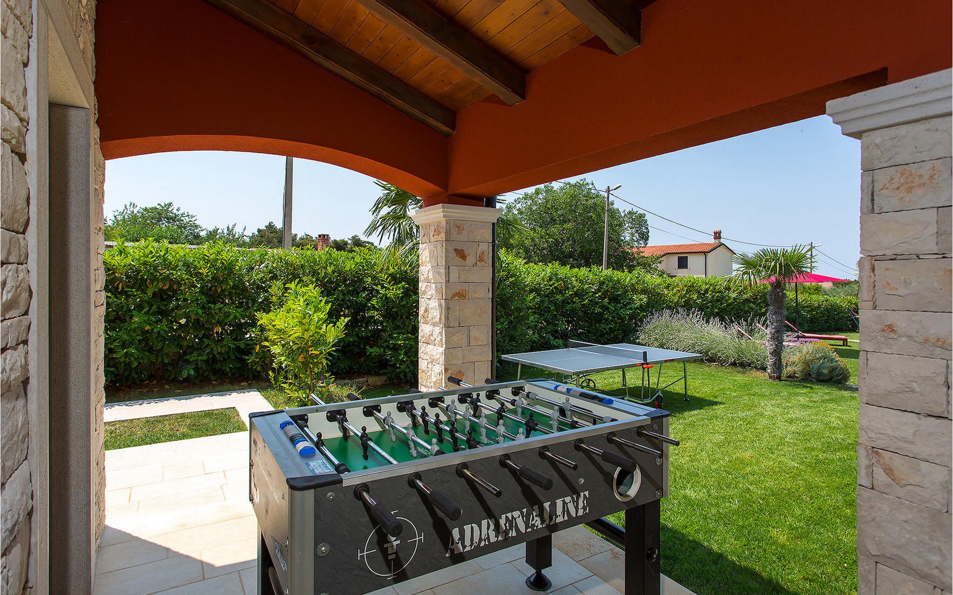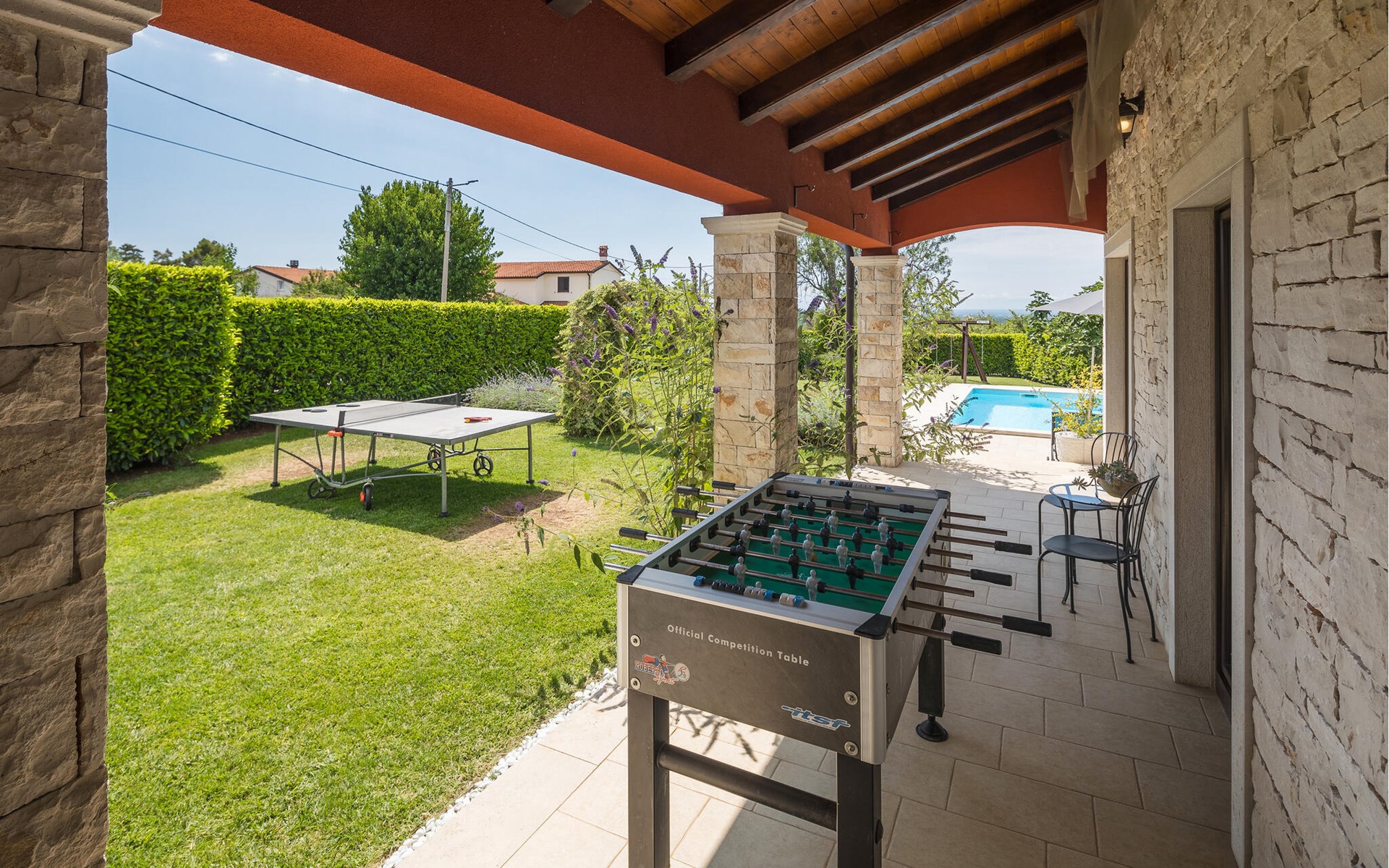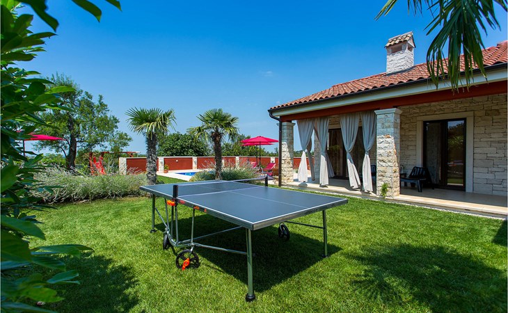 Spend your holiday at Villa Marula, which guarantees lots of fun for every generation. While the children have fun in the playground, you can choose between table tennis and table football. Of course, you can also relax in the private pool. The villa is a charming country house with an open-plan layout, which makes it even more cosy and comfortable. The villa has 4 bedrooms and 3 bathrooms. As Villa Marula is designed for families, the villa can accommodate up to 8 people. Directly from the living room you have access to two terraces, which are covered and ideal for relaxing in the shade. One of the terraces is also equipped with a stone barbecue and solid wood garden furniture. Visit Istria, one of the most beautiful regions in Croatia, and enjoy the sunny weather while the air smells of lavender and you hear nothing but birdsong.
