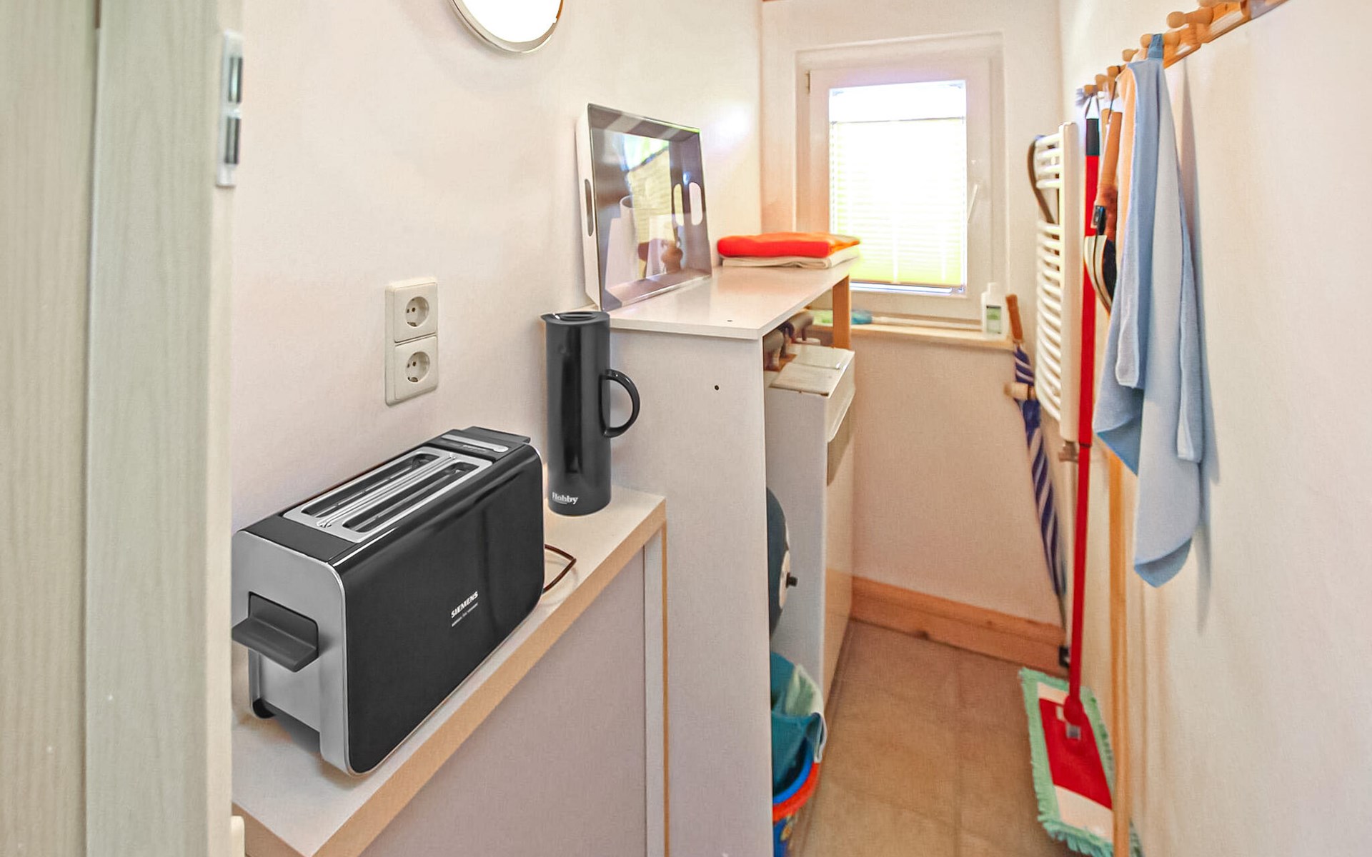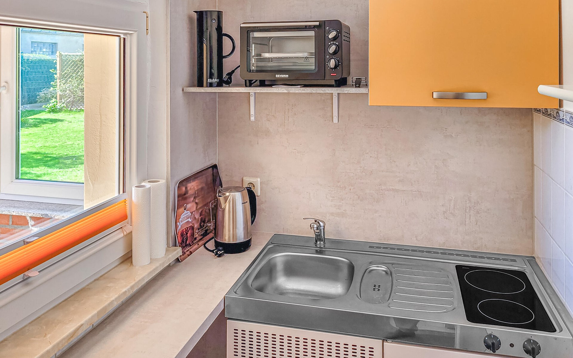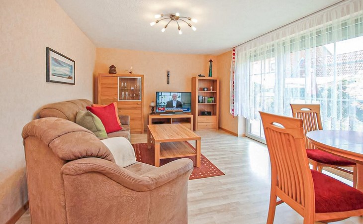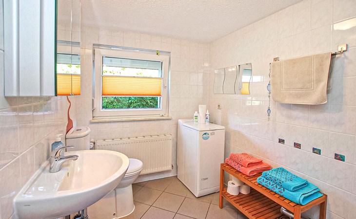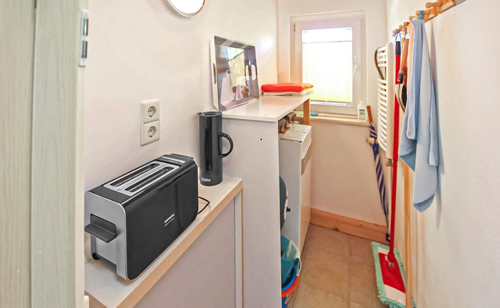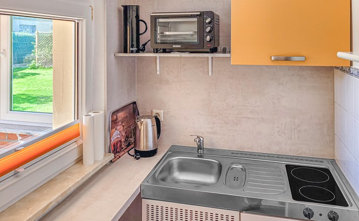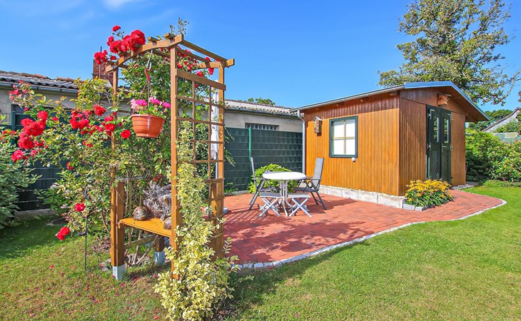The tastefully furnished, centrally heated non-smoking house is equipped with a living room (sofa bed - extra bed for one person, dining table, flat screen TV, radio), a bedroom (double bed, large wardrobe), a mini-kitchen (ceramic hob, fridge with freezer, microwave with grill, various small kitchen appliances), a storage room, a hallway and a bathroom (walk-in shower, WC, washing machine, hairdryer). There is also a furnished seating area in the garden, bicycle storage facilities, a car park in front of the house and WiFi.