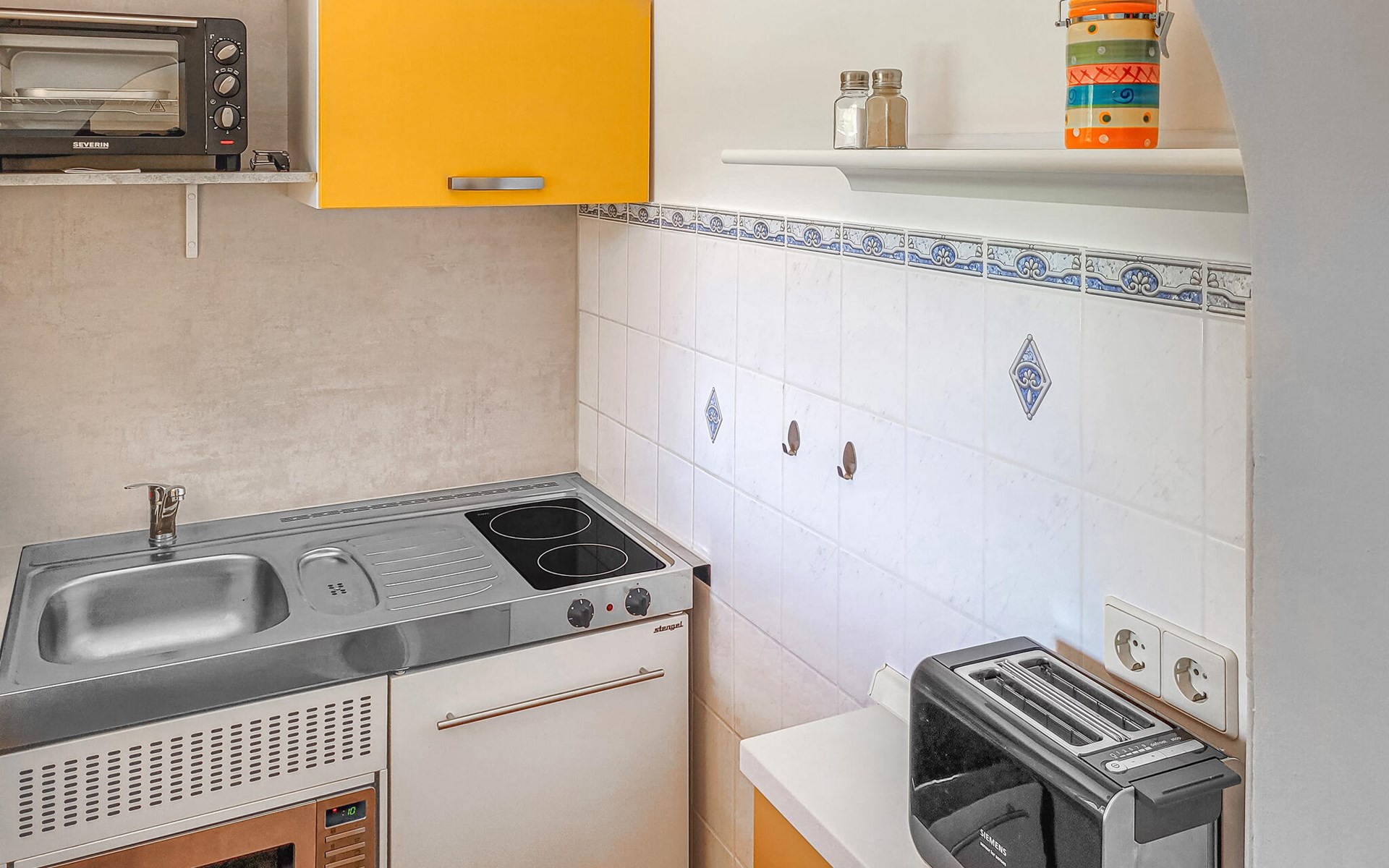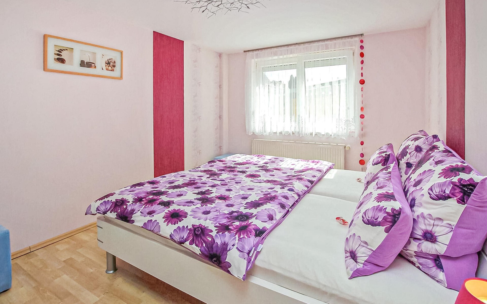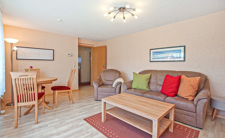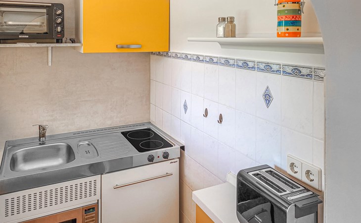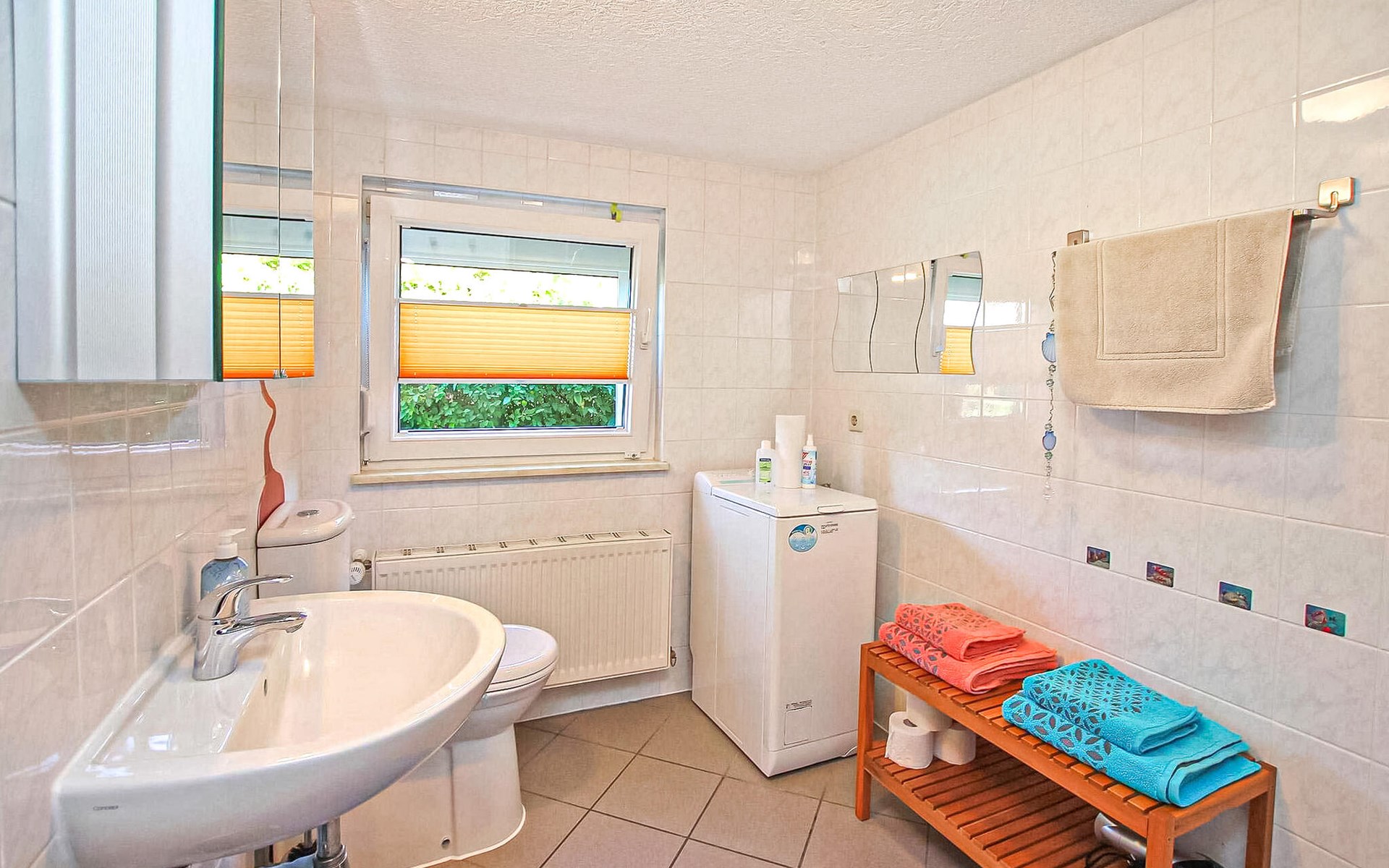 The tastefully furnished, centrally heated non-smoking house is equipped with a living room (sofa bed - extra bed for one person, dining table, flat screen TV, radio), a bedroom (double bed, large wardrobe), a mini-kitchen (ceramic hob, fridge with freezer, microwave with grill, various small kitchen appliances), a storage room, a hallway and a bathroom (walk-in shower, WC, washing machine, hairdryer). There is also a furnished seating area in the garden, bicycle storage facilities, a car park in front of the house and WiFi.