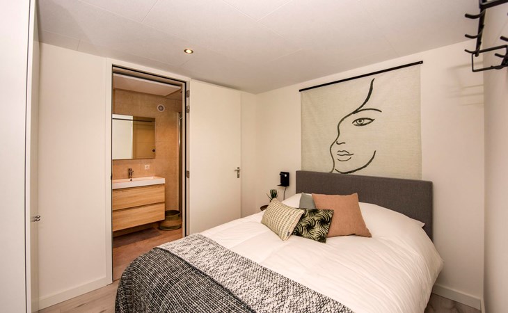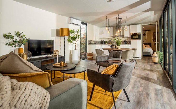 The open living space features air conditioning, a flat-screen TV and a comfortable seating area for two. The fully equipped kitchen includes an induction hob, combi microwave, dishwasher, fridge with freezer, boiling water tap and a Lavazza Blue coffee machine or Dolce Gusto – ideal for a relaxed breakfast or home-cooked dinner. The bedroom offers a cozy bed with quality linen included, while the en-suite bathroom has a walk-in shower and a sleek finish. With clever storage and natural materials, the Forest Cube makes a compact space feel light, warm and spacious.
