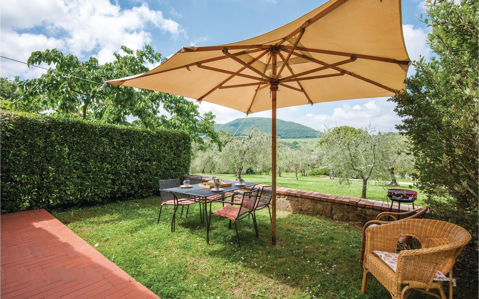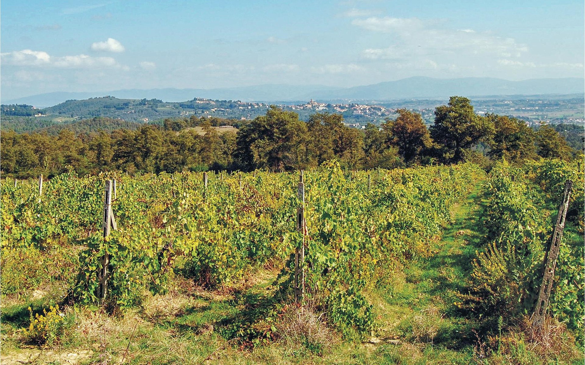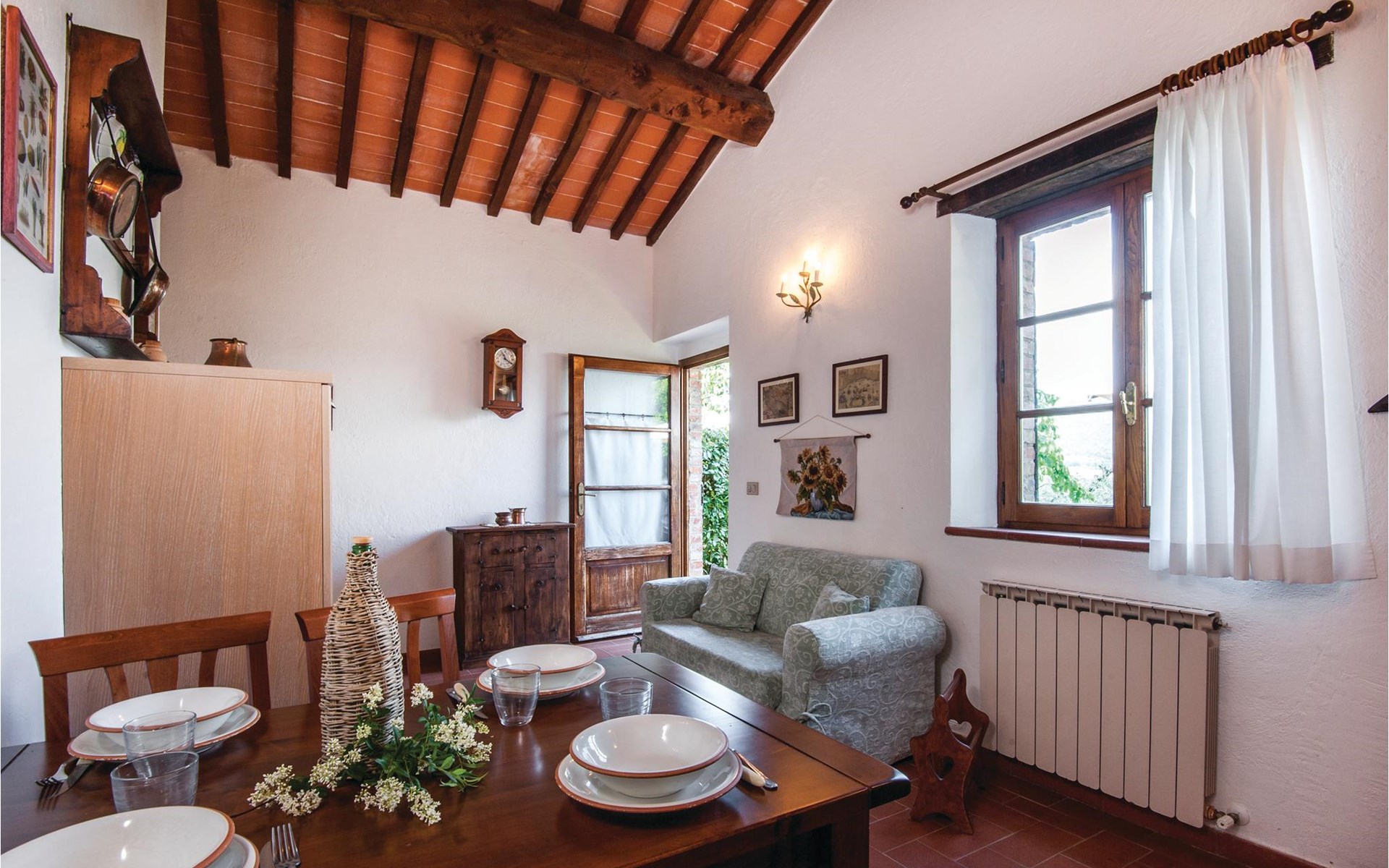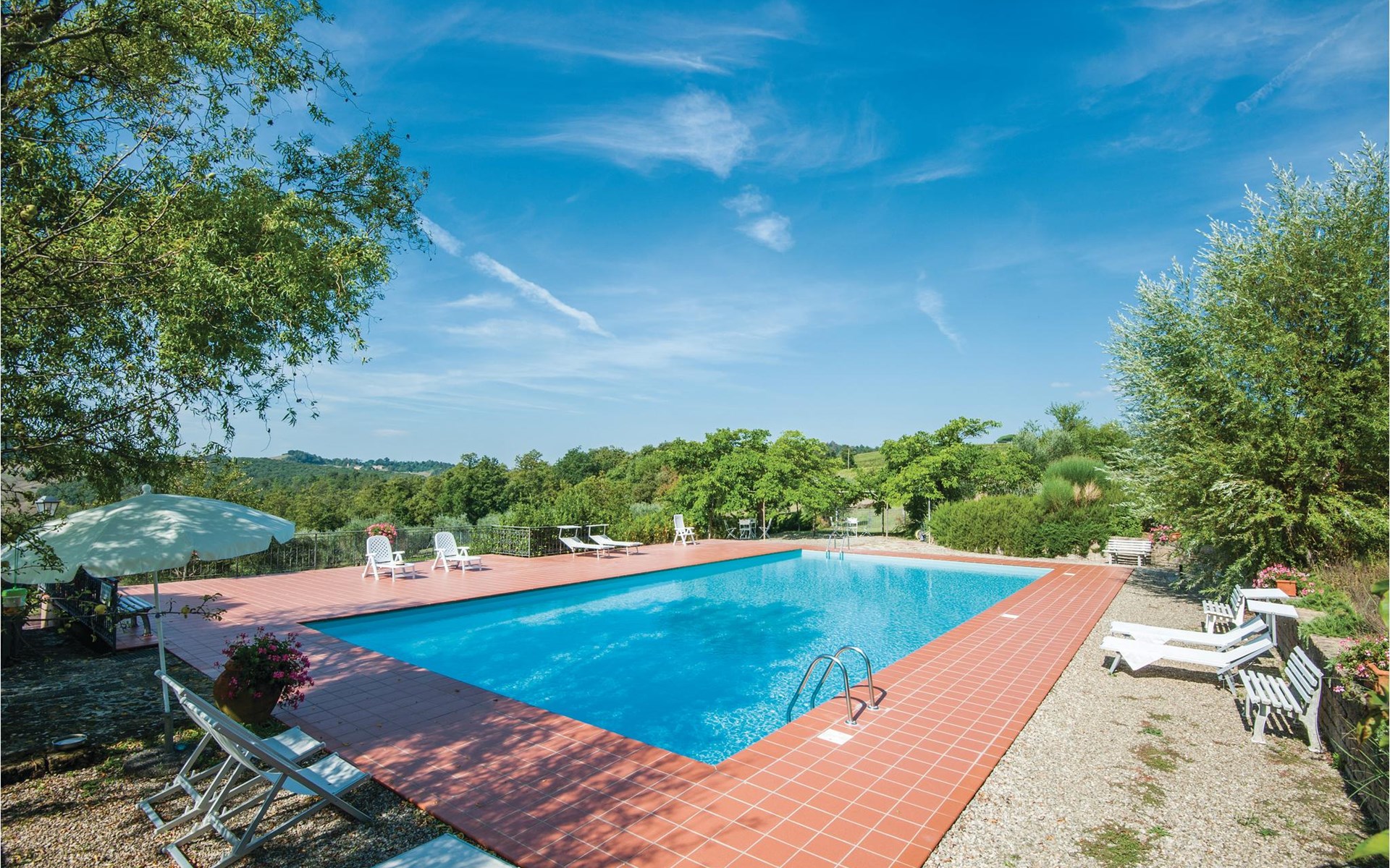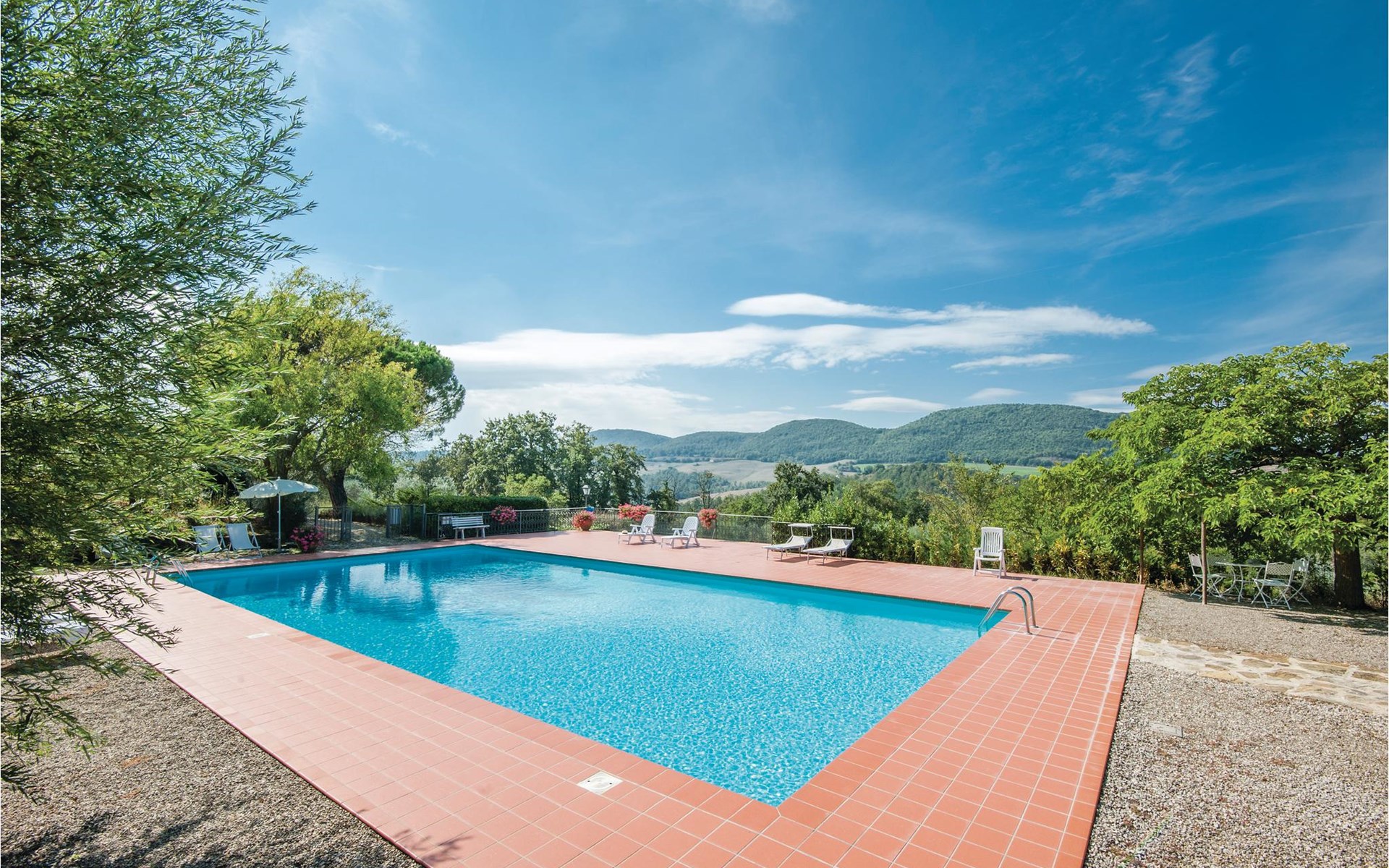 About 4 km from Trequanda lies this friendly vacation home in the vineyards. It belongs to an old estate, where today there are various summer residences of Italian families. The house is on the ground floor, with small private garden and sitting area in front of the kitchen-living room. The furnishings are simple and tasteful. The spacious outdoor area is very well maintained and very picturesquely surrounded by olive groves and vineyards. The large pool with its sun terraces and the tennis court are shared by all residents. The sunset, which you can watch from the terrace, will remain in your memory! Nearby destinations include Montepulciano and Pienza (25 km each), Arezzo and Siena (45-50 km) and Lake Trasimeno (35 km). But the nearby towns of Sinalunga (4 km) and Torrita di Siena (10 km) are also worth visiting. Unpaved access road.