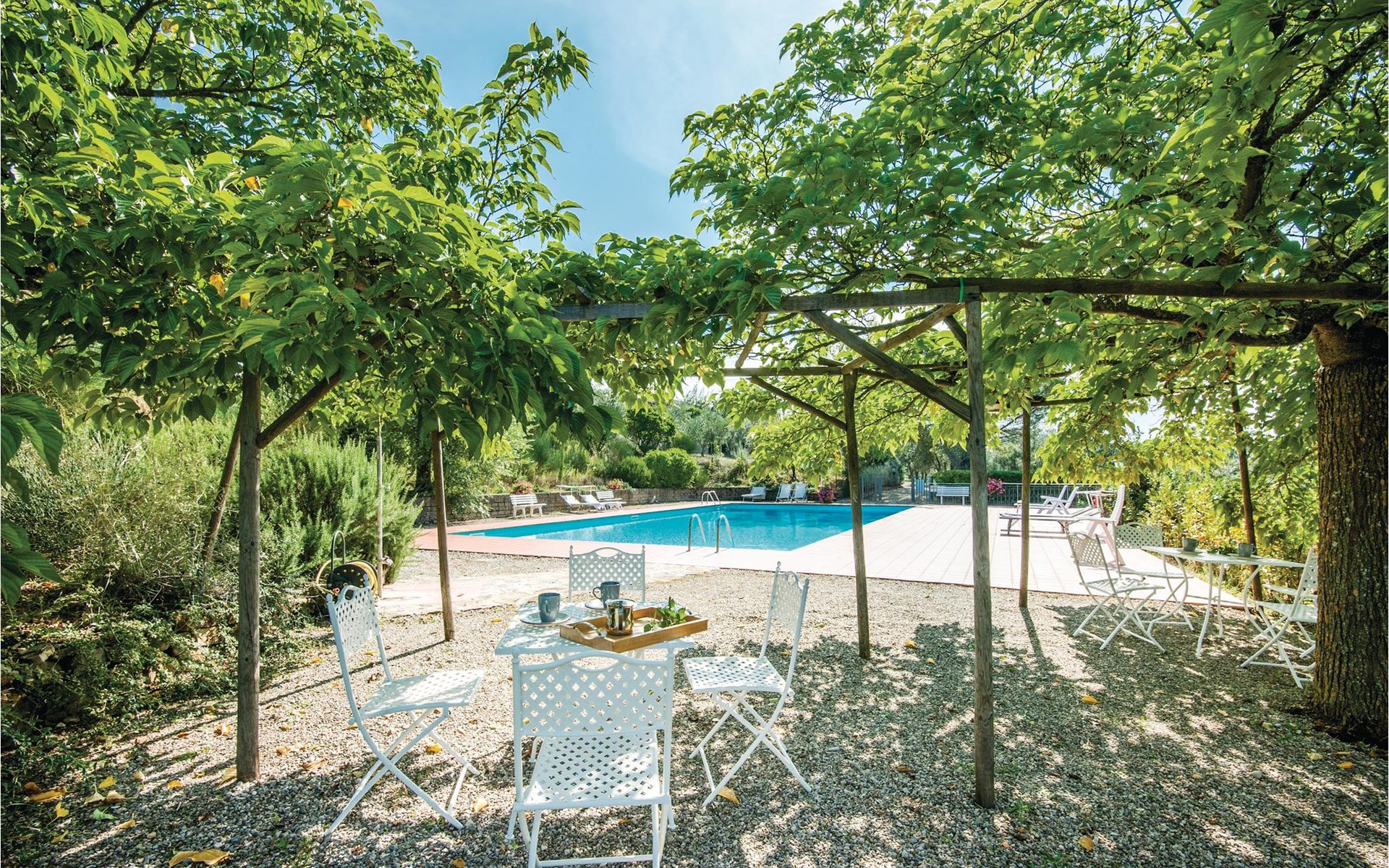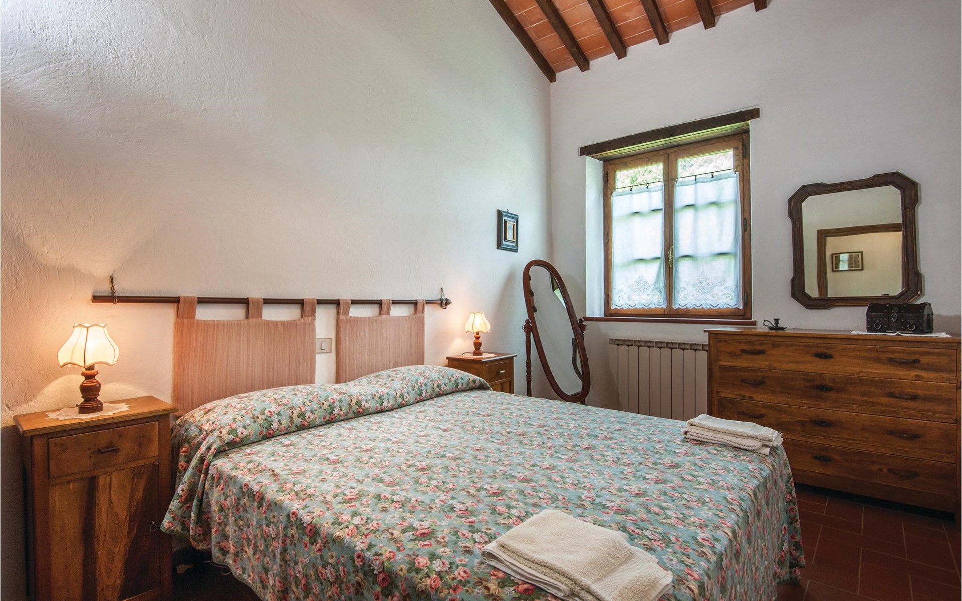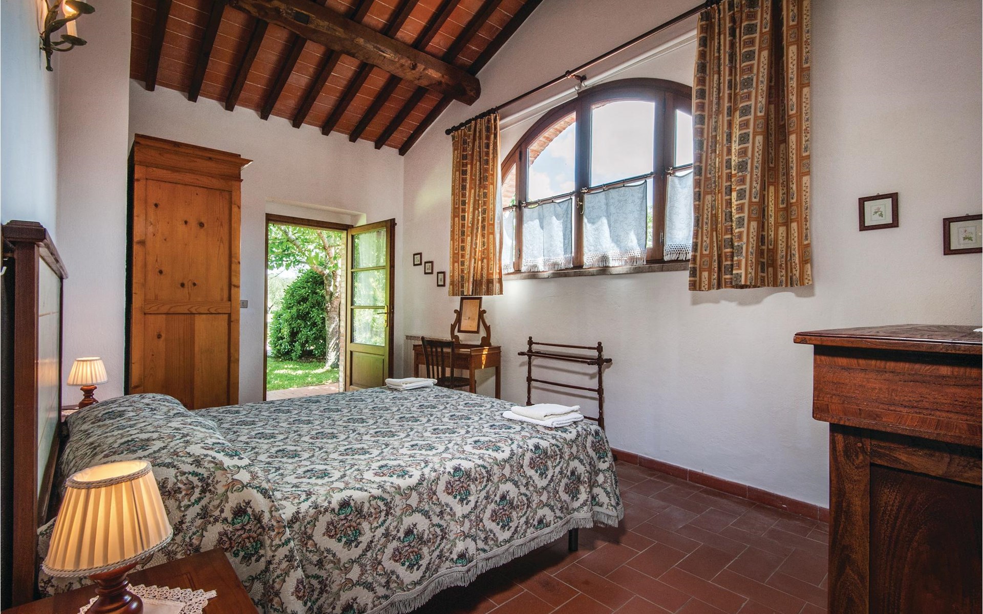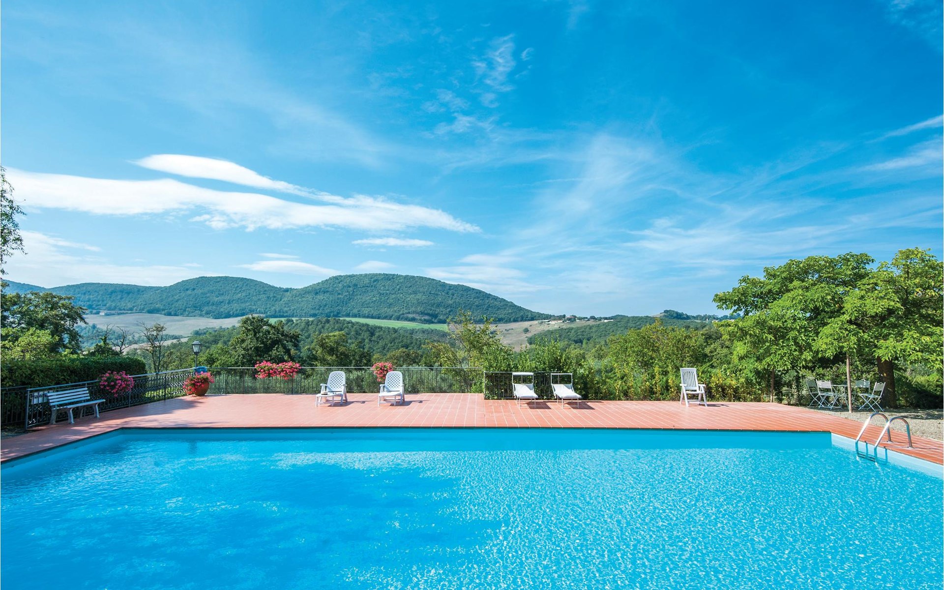 About 4 km from Trequanda lies this friendly vacation home in the vineyards. It belongs to an old estate, where today there are various summer residences of Italian families. The house is on the ground floor, with small private garden and sitting area in front of the kitchen-living room. The furnishings are simple and tasteful. The spacious outdoor area is very well maintained and very picturesquely surrounded by olive groves and vineyards. The large pool with its sun terraces and the tennis court are shared by all residents. The sunset, which you can watch from the terrace, will remain in your memory! Nearby destinations include Montepulciano and Pienza (25 km each), Arezzo and Siena (45-50 km) and Lake Trasimeno (35 km). But the nearby towns of Sinalunga (4 km) and Torrita di Siena (10 km) are also worth visiting. Unpaved access road.