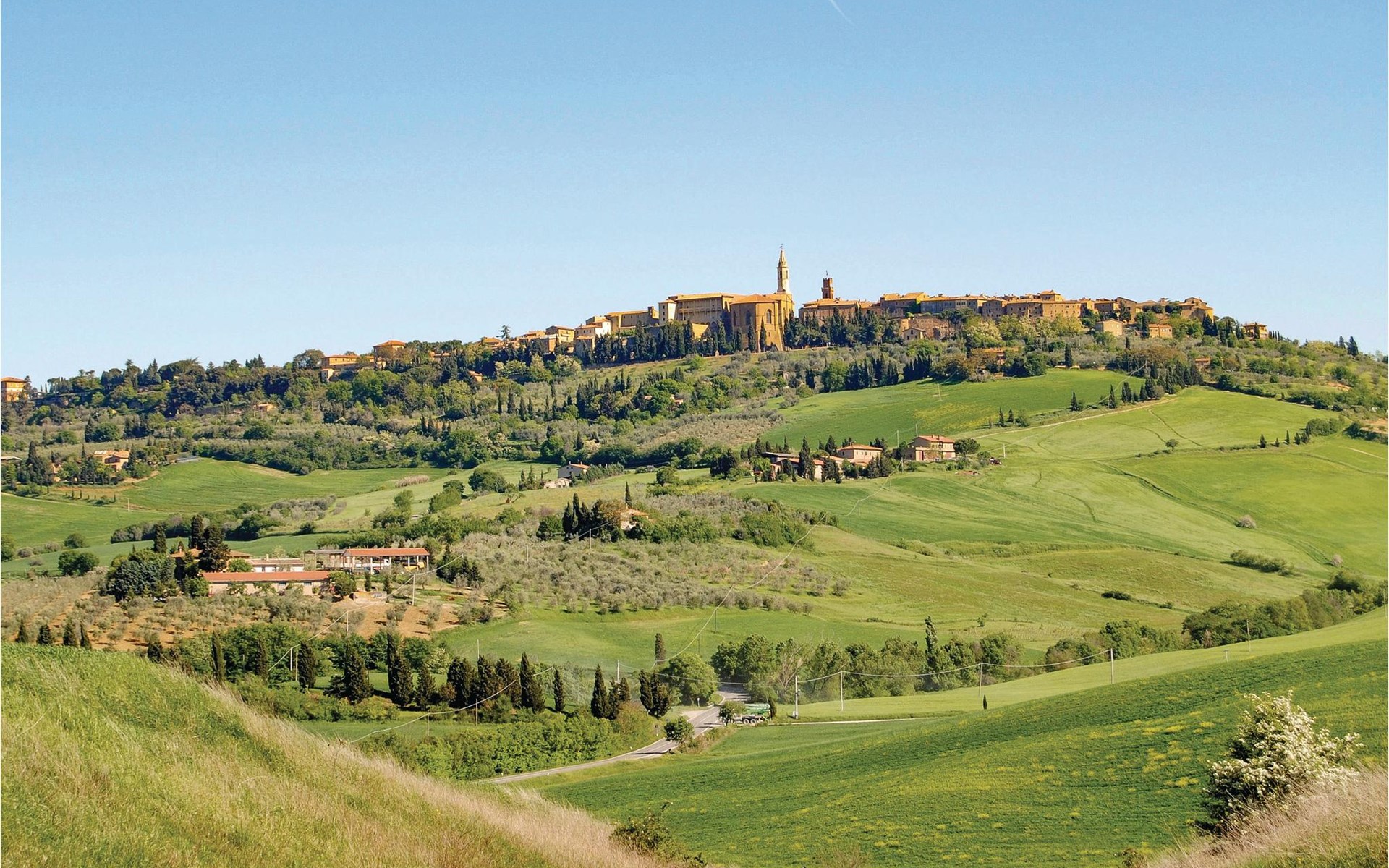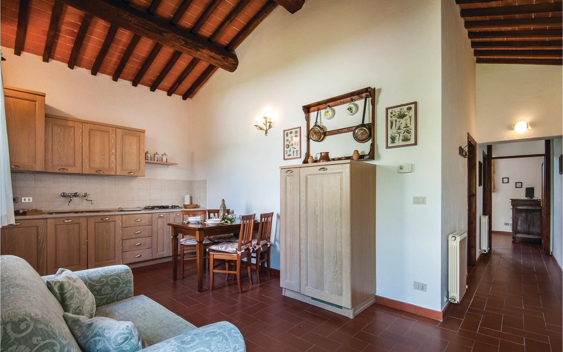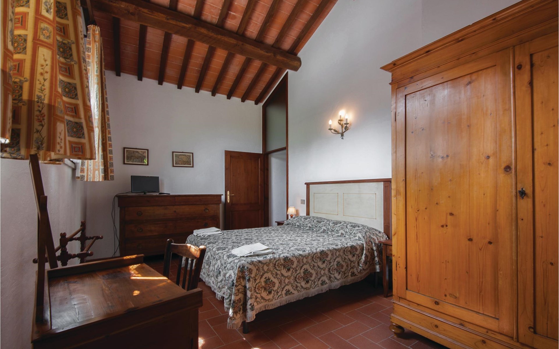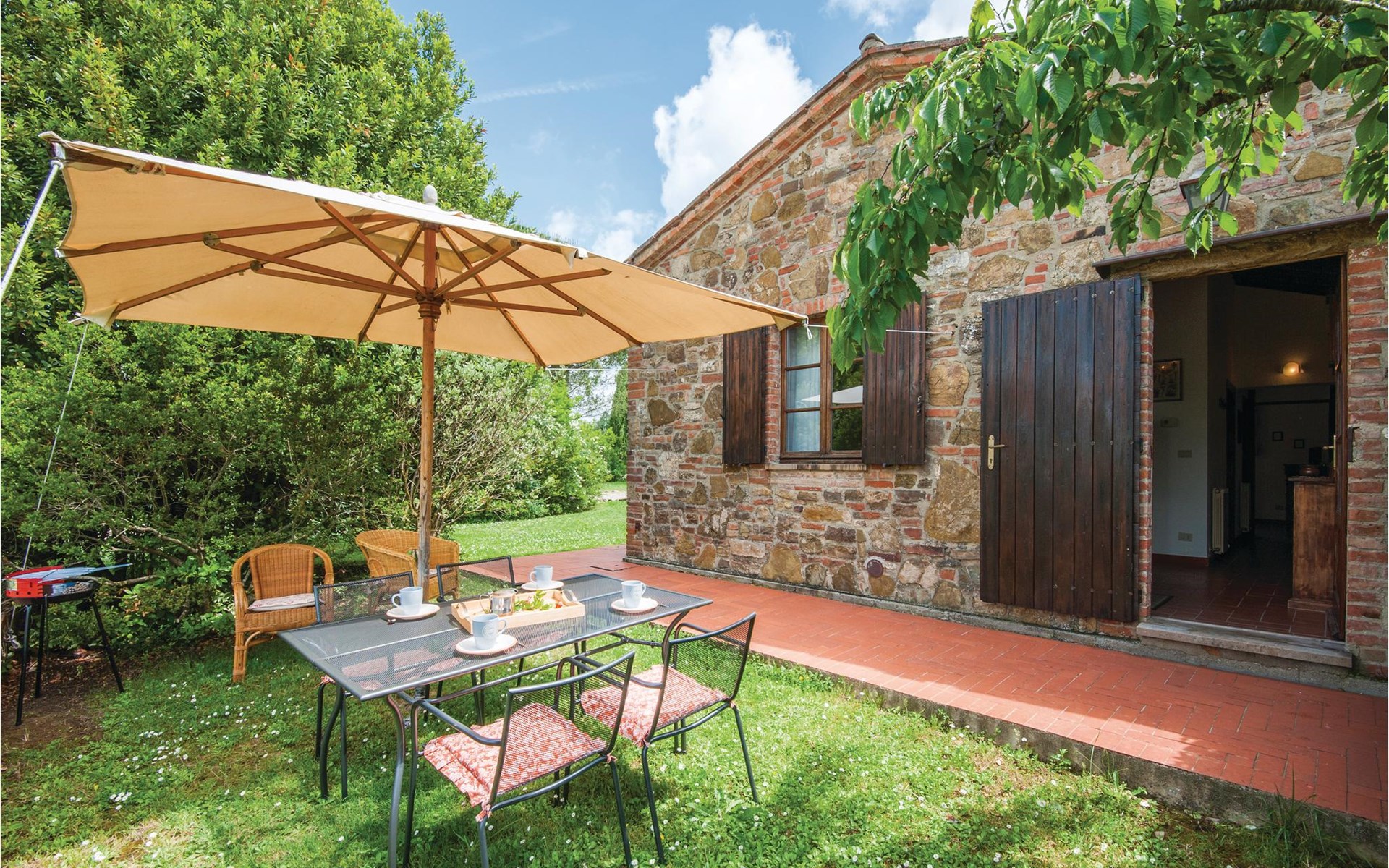 About 4 km from Trequanda lies this friendly vacation home in the vineyards. It belongs to an old estate, where today there are various summer residences of Italian families. The house is on the ground floor, with small private garden and sitting area in front of the kitchen-living room. The furnishings are simple and tasteful. The spacious outdoor area is very well maintained and very picturesquely surrounded by olive groves and vineyards. The large pool with its sun terraces and the tennis court are shared by all residents. The sunset, which you can watch from the terrace, will remain in your memory! Nearby destinations include Montepulciano and Pienza (25 km each), Arezzo and Siena (45-50 km) and Lake Trasimeno (35 km). But the nearby towns of Sinalunga (4 km) and Torrita di Siena (10 km) are also worth visiting. Unpaved access road.
