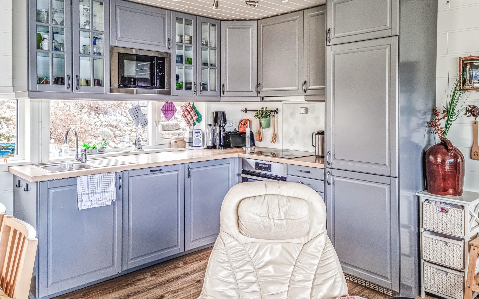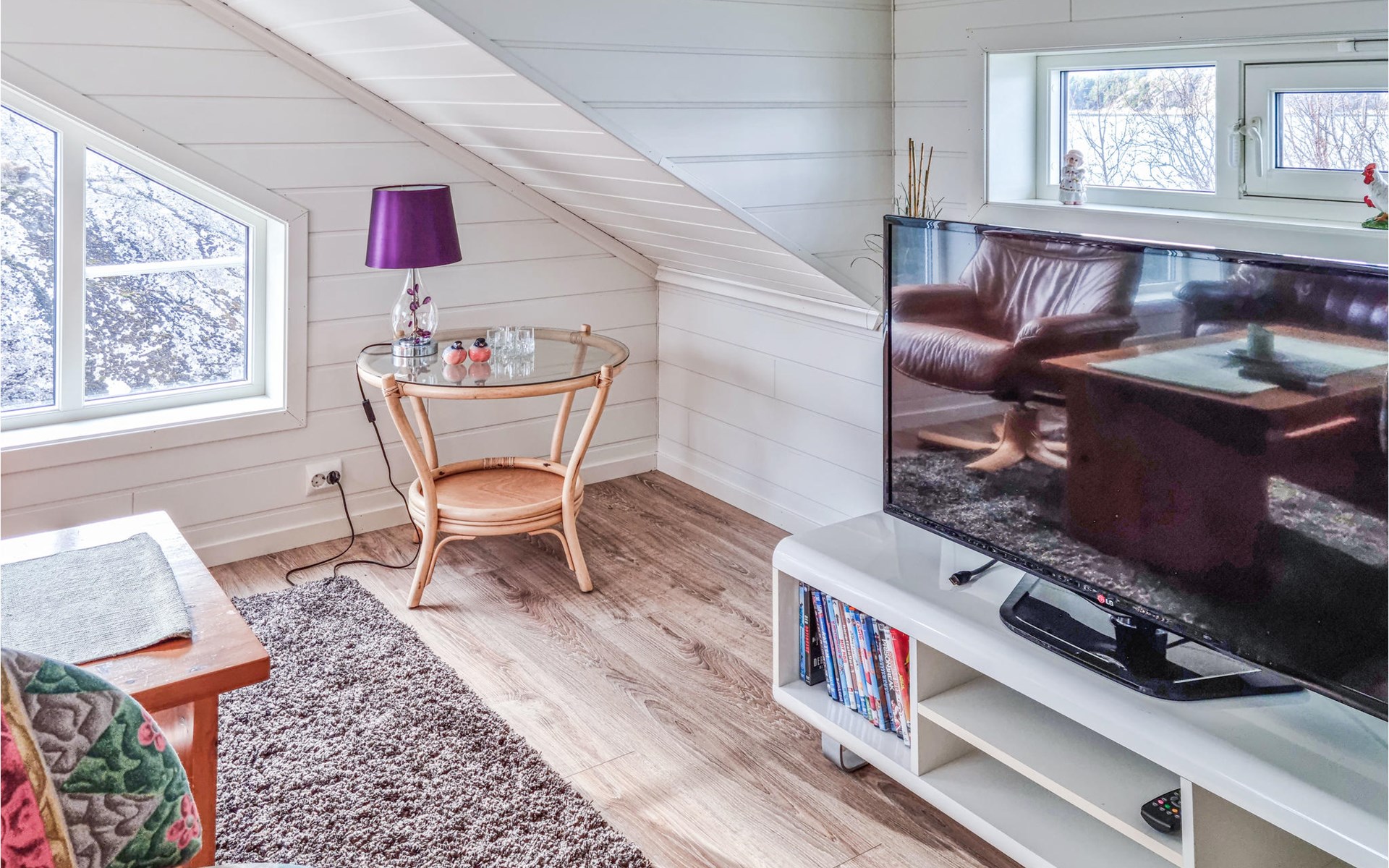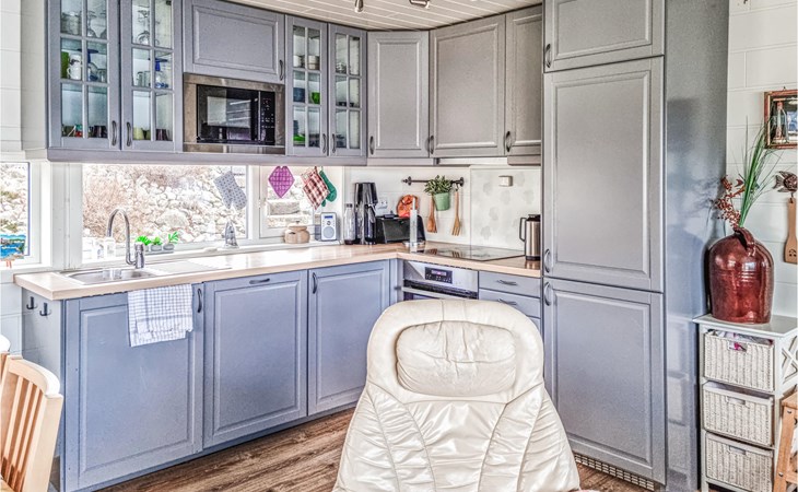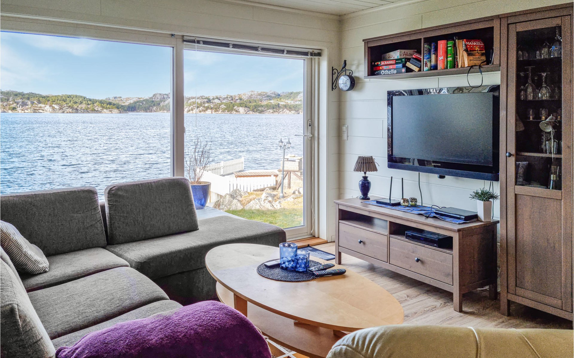 The bright and inviting house welcomes you with a homely interior. Cleverly placed windows ensure that you can optimally enjoy the fantastic view of the archipelago everywhere in the house. After an active day of swimming in the fjord or fishing adventures, there is nothing better than relaxing together on the comfortable sofa with a wonderful panoramic view, firing up the fireplace and already making plans for the next day of vacation while the flames crackle.