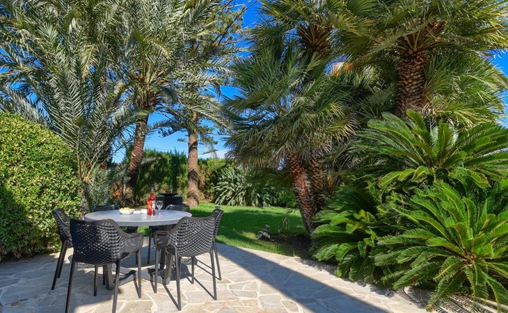 - beautiful lawned garden with gravel, trees and garden furniture with sunbeds