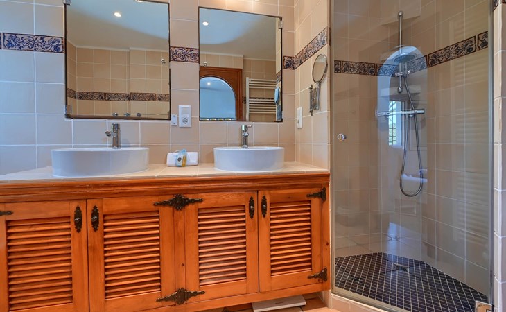 - en-suite bathroom with double washbasin, bath, shower and toilet
