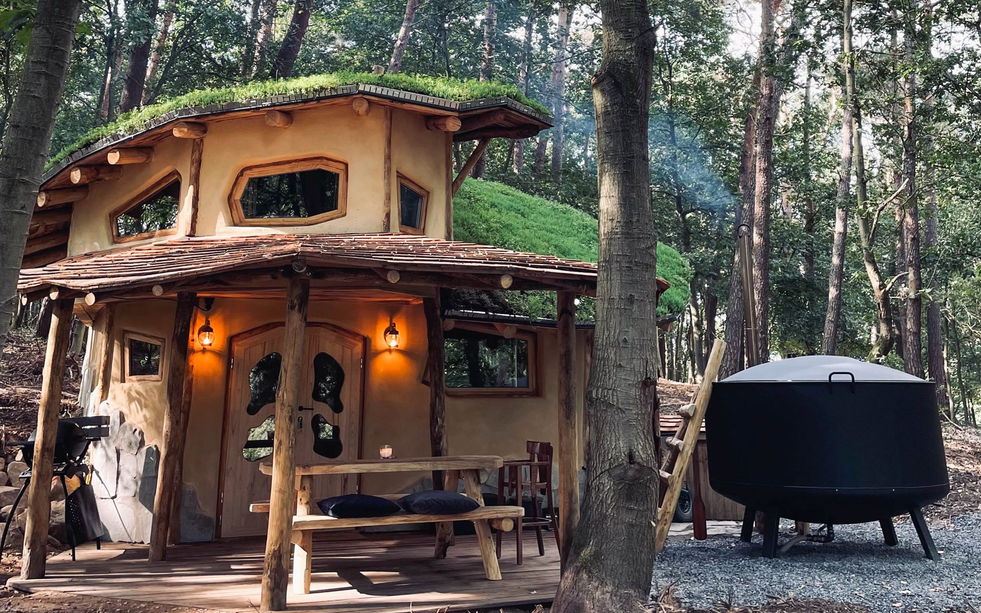 The hobbit house is equipped with a covered terrace and a gas barbecue. Sit cosily at the table under the atmospheric lighting and enjoy the beautiful nature.