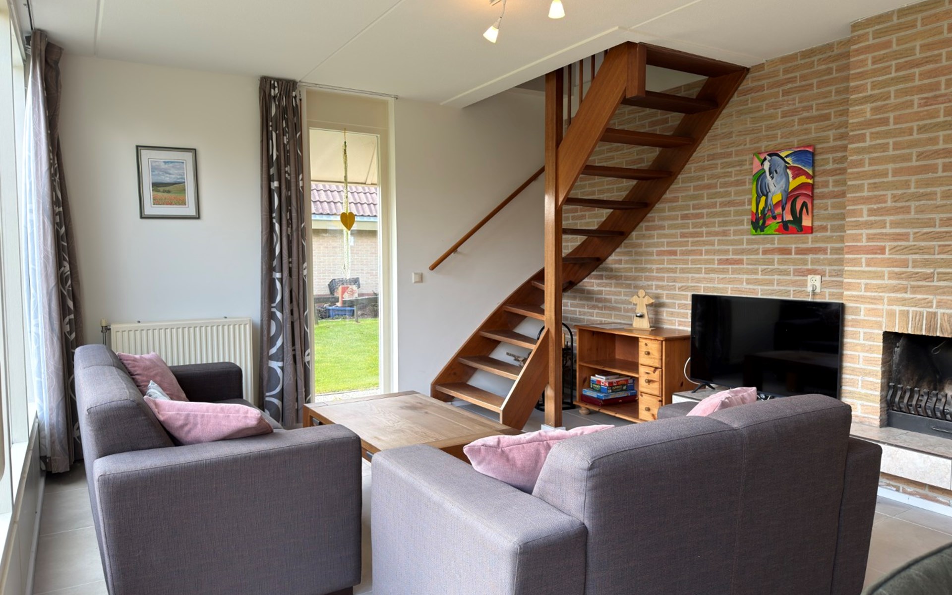 The ground floor of 50 m² has a cozy living room with fireplace and comfortable sofa, a fully equipped open kitchen, a bathroom, a hall and a storage room. On the upper floor there are three bedrooms and an extra guest toilet.