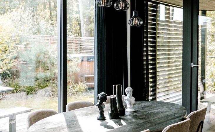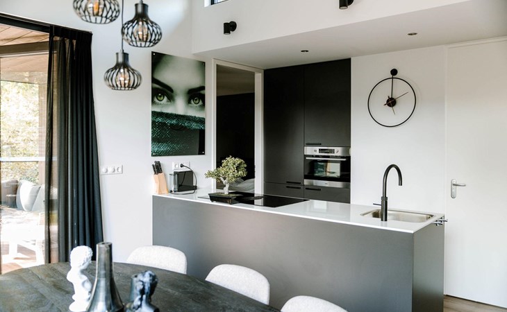 This beautiful Eco-Lodge designed by an architect is highly luxuriously and completely furnished for four persons. This Eco-Lodge has the perfect location for enjoying a weekend way or for experiencing a holiday with ultimate comfort. The Lodge is equipped with two bedrooms, of which one master bedroom with two single beds and a washbasin, one double bedroom with a double bed (two separate mattresses). The Lodge has a spacious bathroom with a toilet and a separate toilet. The spacious living area has a modern open kitchen with a beautiful view outside. The kitchen has the following appliances: Nespresso coffee machine, kettle, combination oven, refrigerator/freezer compartment, induction cooker, extractor hood built into the cooking island with various cookware and a pan set.