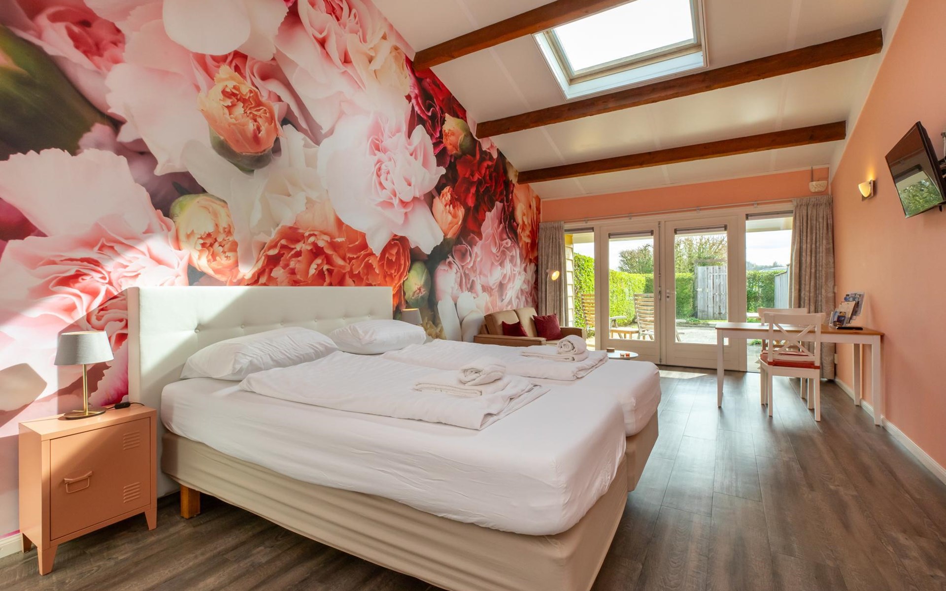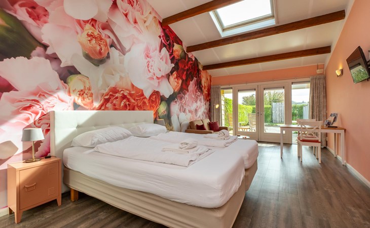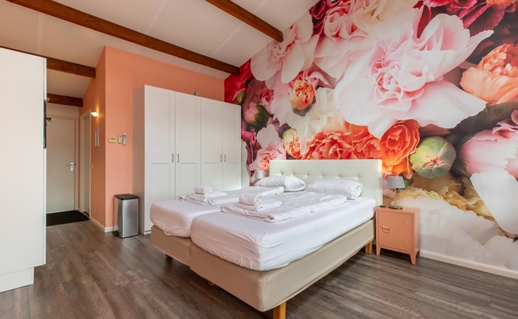 Upon entering this studio, the high sloping roof immediately stands out, which provides a wonderful spacious feeling. The large windows provide a pleasant incidence of light and give you the feeling of being one with the outside world. The impressive photo wallpaper of flowers is a nice nod to the picking garden that you can visit in the summer.