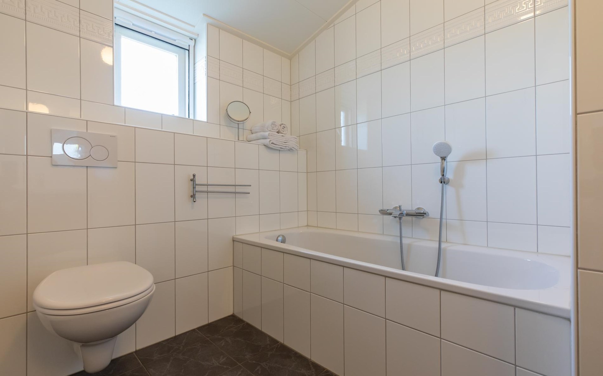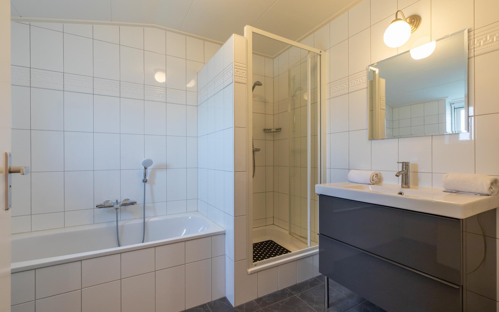 The bathroom is equipped with a sink with storage space, a shower, a separate bathtub and the toilet. A nice place to freshen up after a long holiday day.