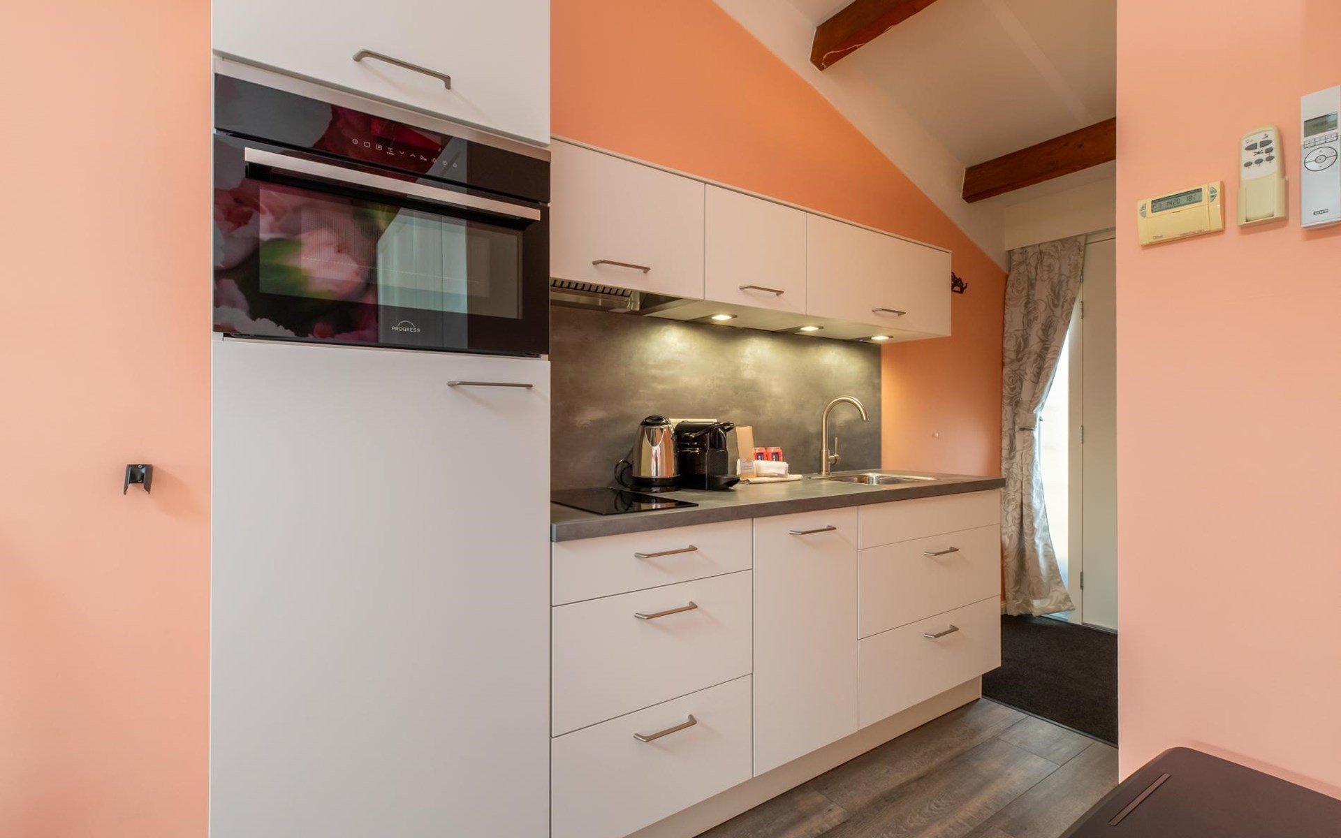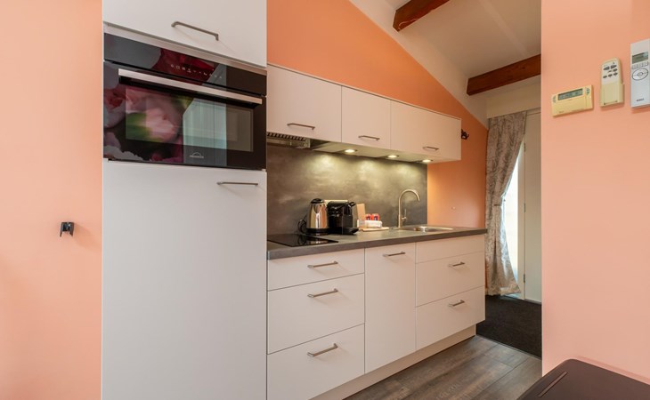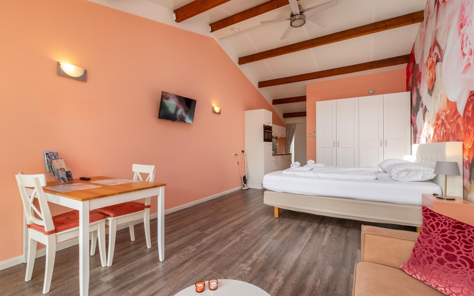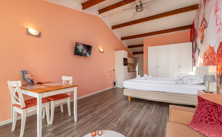 The studio is practically arranged and offers everything you need on the ground floor level. At the rear of the studio you will find a cozy living area with a sofa, coffee table and television and a view of the private garden.