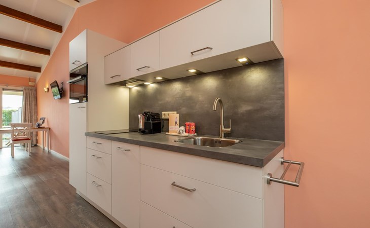 The kitchen may be small, but it is fully equipped. From a hob, combi microwave, fridge with freezer compartment to a dishwasher, Nespresso machine and a kettle, you have everything at hand to prepare a delicious meal. And with the table and chairs opposite the sofa, you can enjoy cozy dinners together.