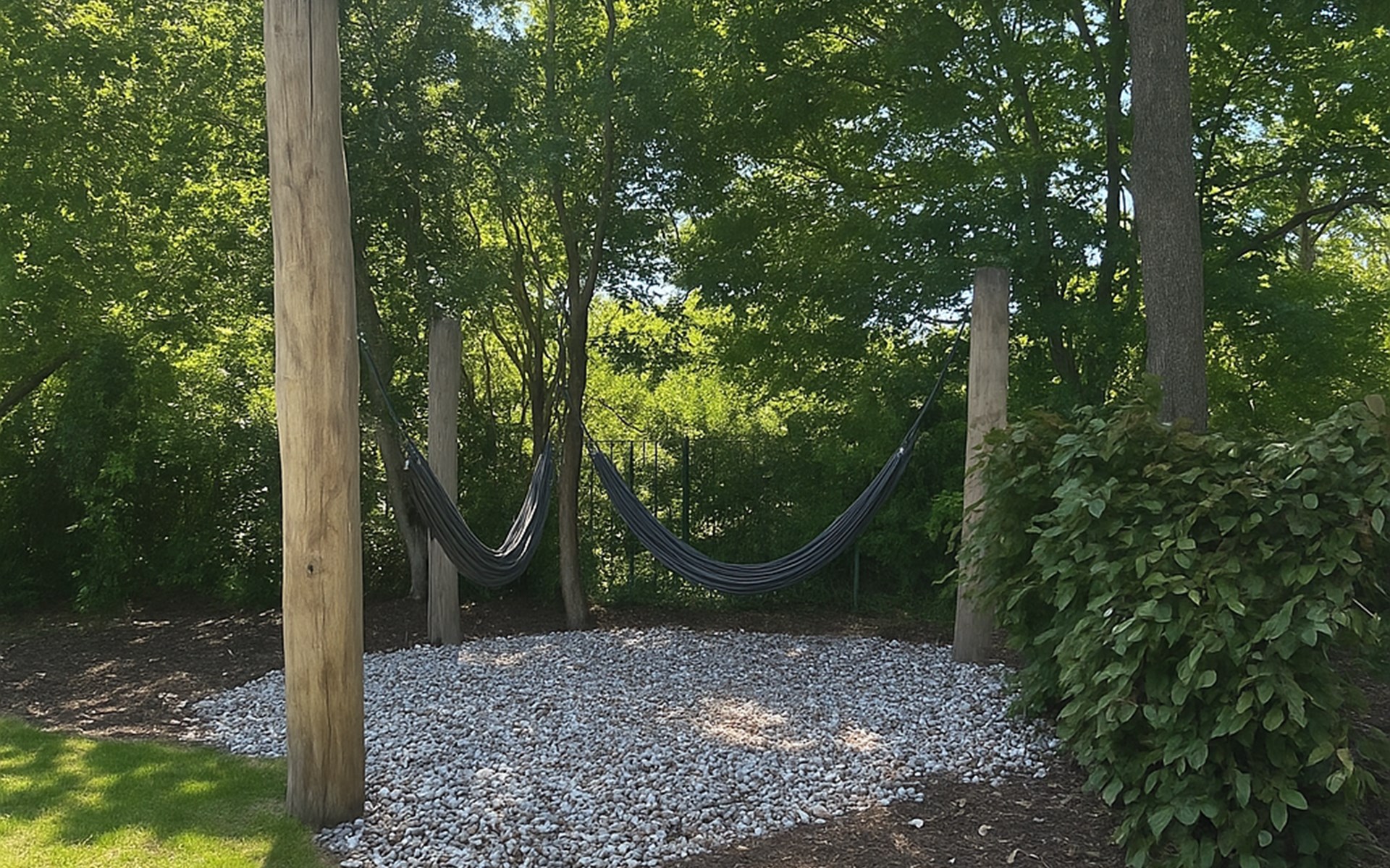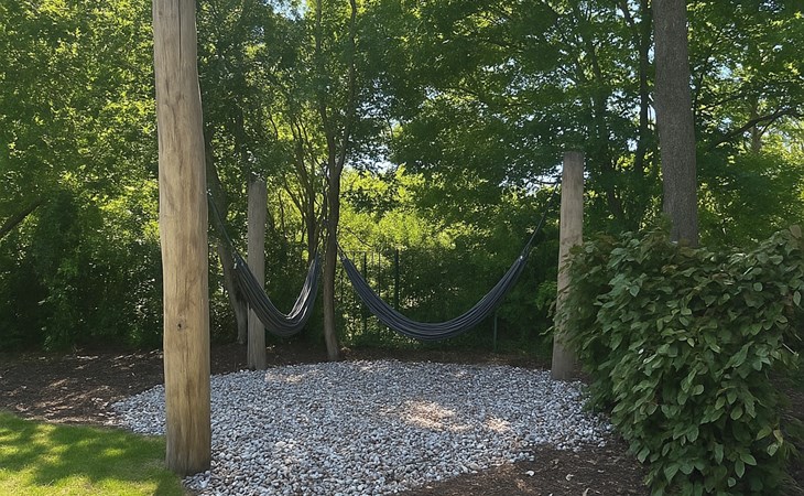 There is a large terrace with garden furniture, lounge sofa, outdoor shower and hammock. The garden is surrounded by greenery.
