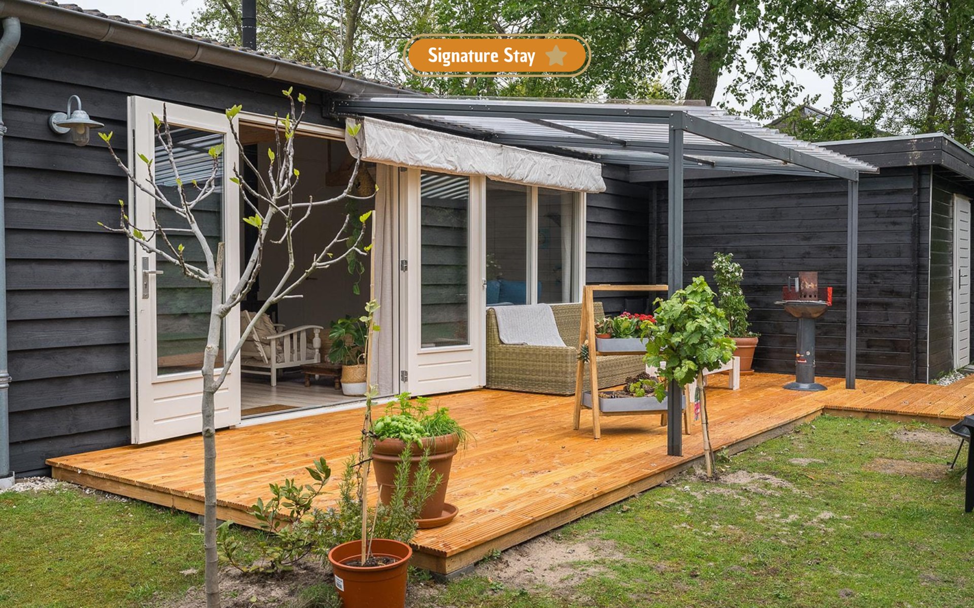 Outside, you can enjoy the garden. On the beautifully landscaped deck terrace, you can sit in the sun or the shade thanks to the retractable sunshade. There is also a charcoal barbecue and an outdoor fireplace, perfect for cozy evenings with friends or family. Parking is not a problem; there is space for two cars.