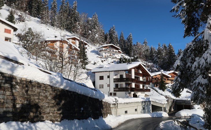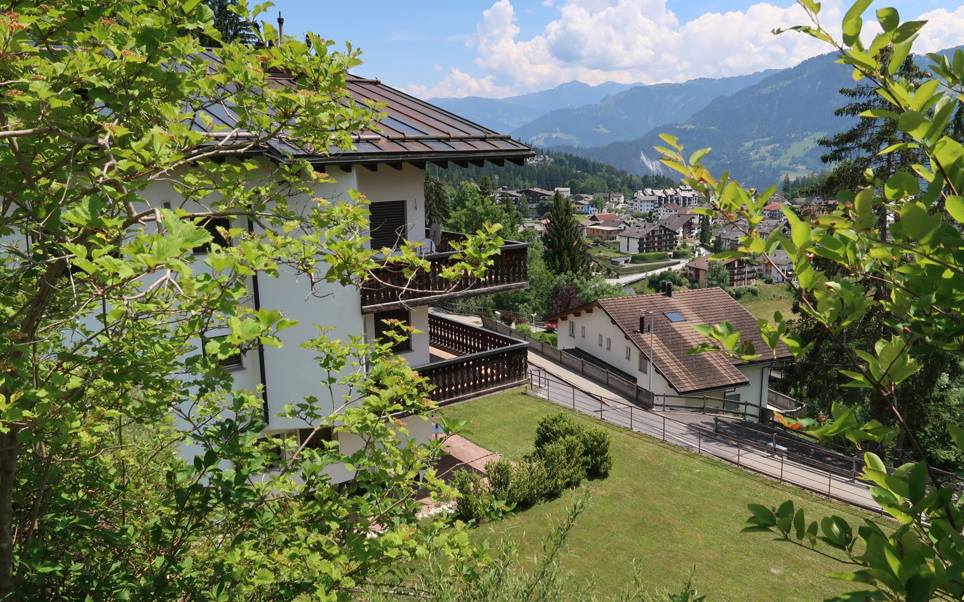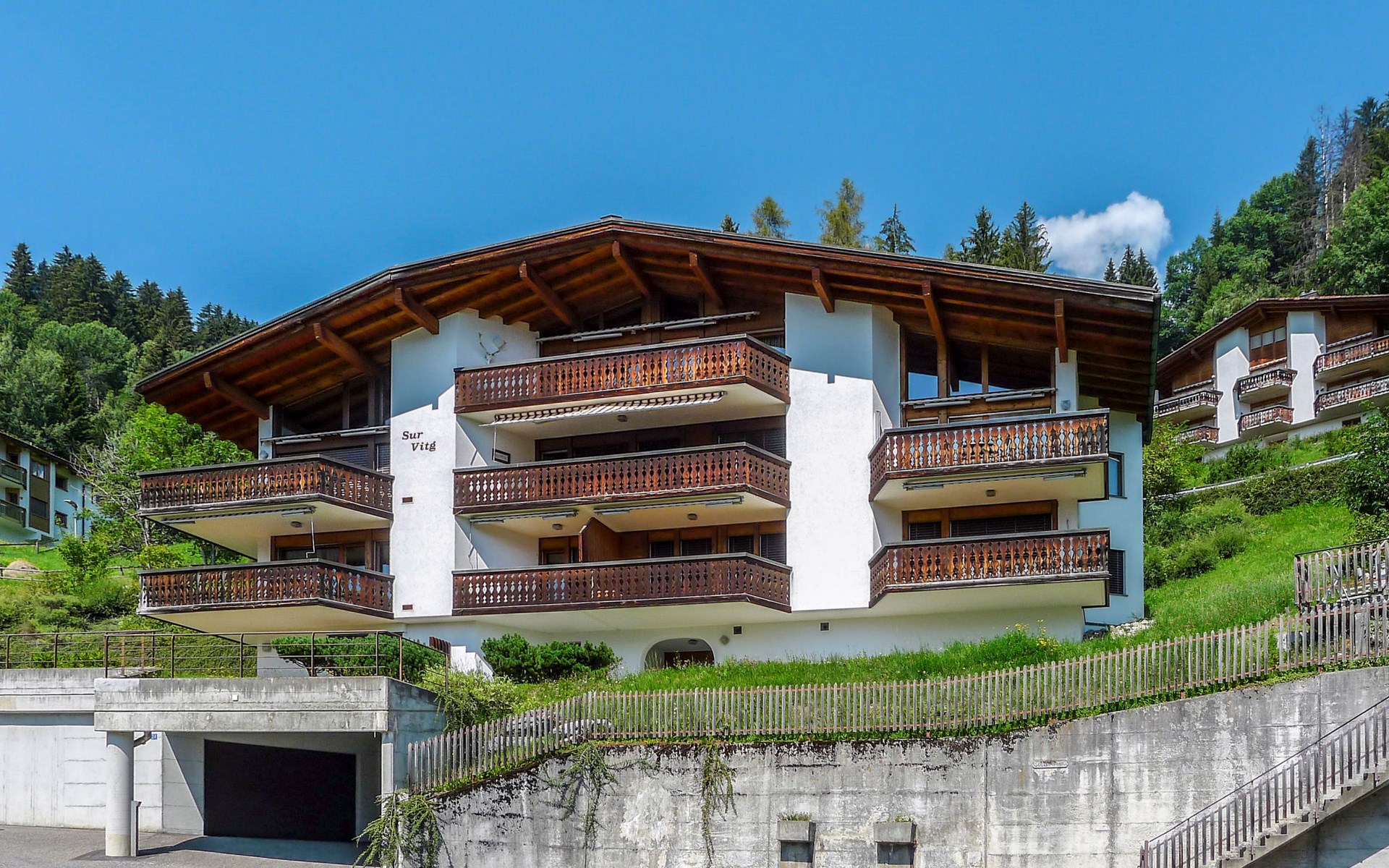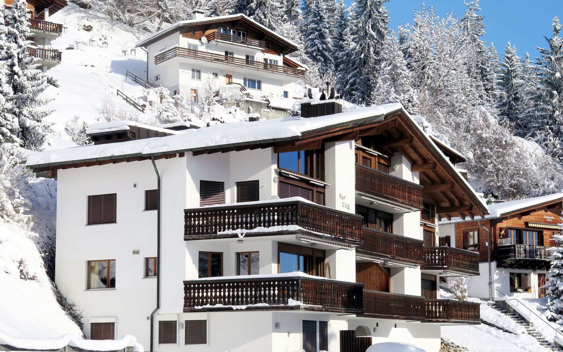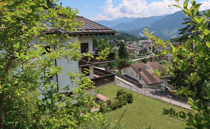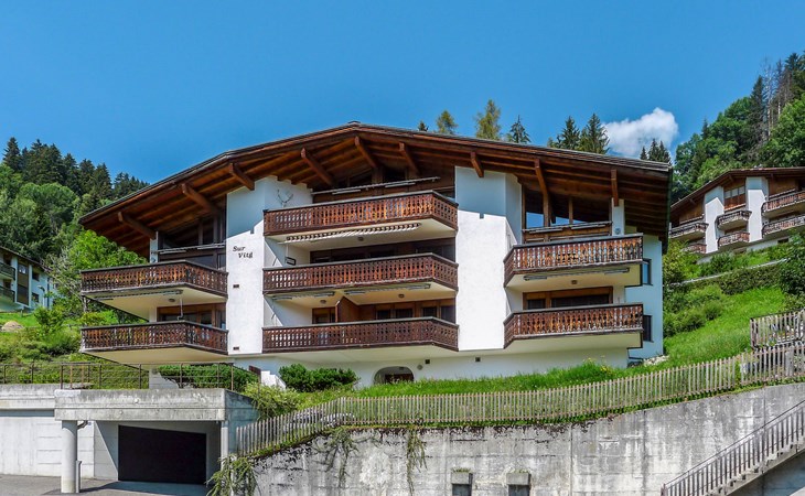 Cosy apartment house "Sur Vitg", 1'020 m a.s.l., 4 storeys. 500 m from the centre of Laax, on the outskirts, 6 km from the centre of Ilanz, in a quiet, sunny, elevated position on a slope, 500 m from the lake, 2 km from the skiing area. In the house: lift, storage room for skis, central heating system, washing machine, tumble dryer (for shared use). Motor access to the house. Communal covered parking at the house. Grocery, restaurant, bakery 500 m, bus stop "Laax GR, Fau" 100 m, railway station "Ilanz" 6 km, indoor swimming pool, bathing lake 500 m. Golf course (18 hole) 3 km, cable car 2 km, ski lift 2 km, chair lift 2 km, skisport facilities 2 km, slopes 2 km, ski bus stop 150 m, ski school 2 km, sled run 2 km, cross country ski track 2 km, ice rink, children's playground 500 m. Nearby attractions: Rheinschlucht 3 km. Well-known ski regions can easily be reached: Weisse Arena Flims/laax 2 km. Well-known lakes can easily be reached: Laaxersee 500 m, Caumasee 5 km. The house is on a side street towards Falera (dead end).