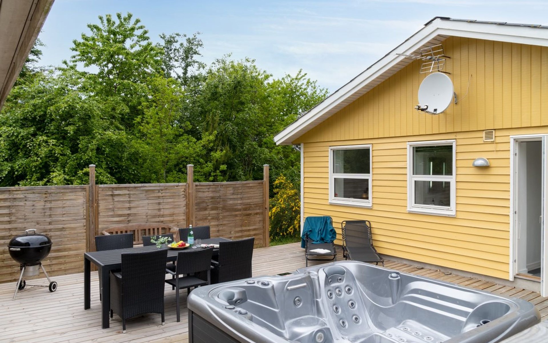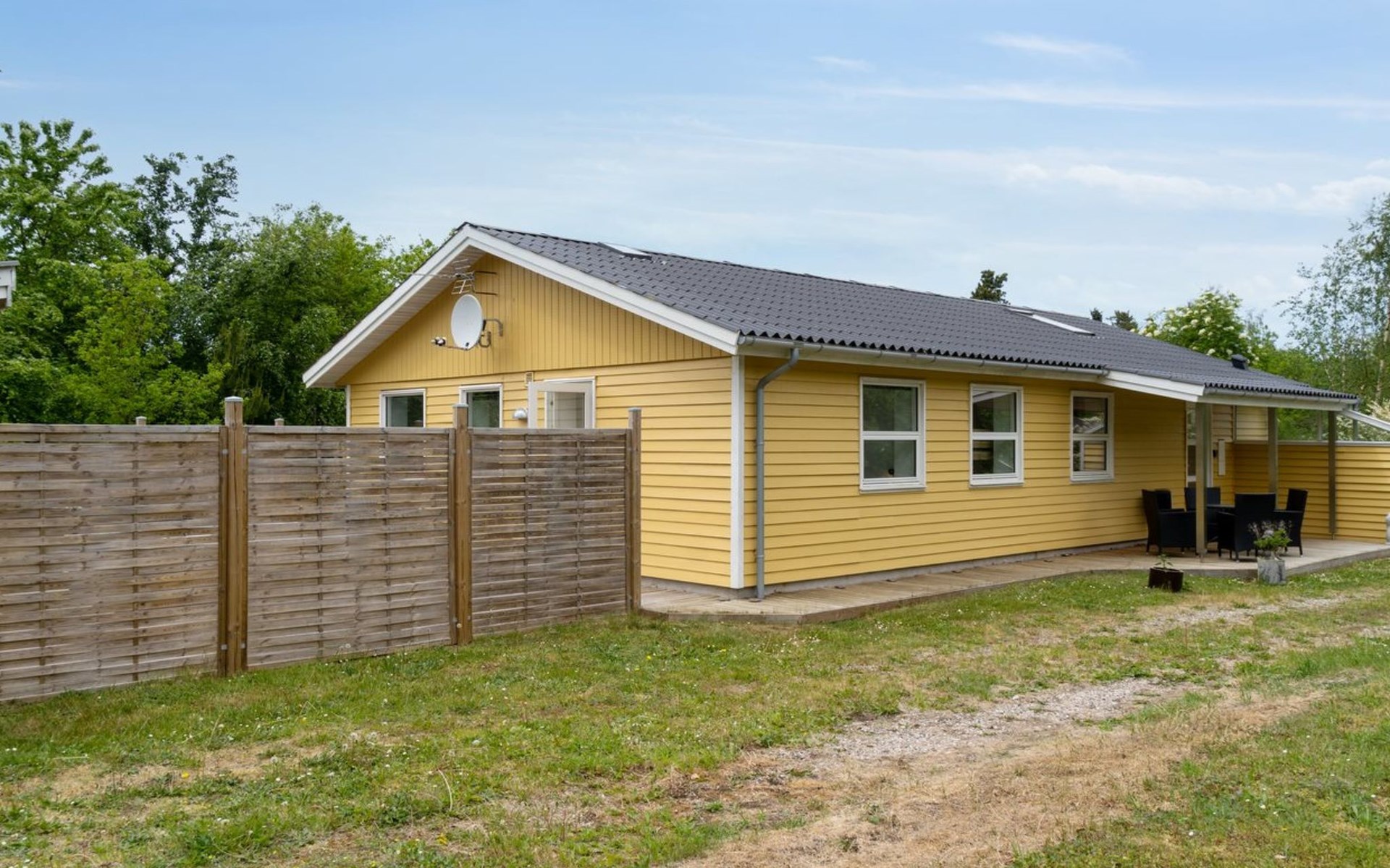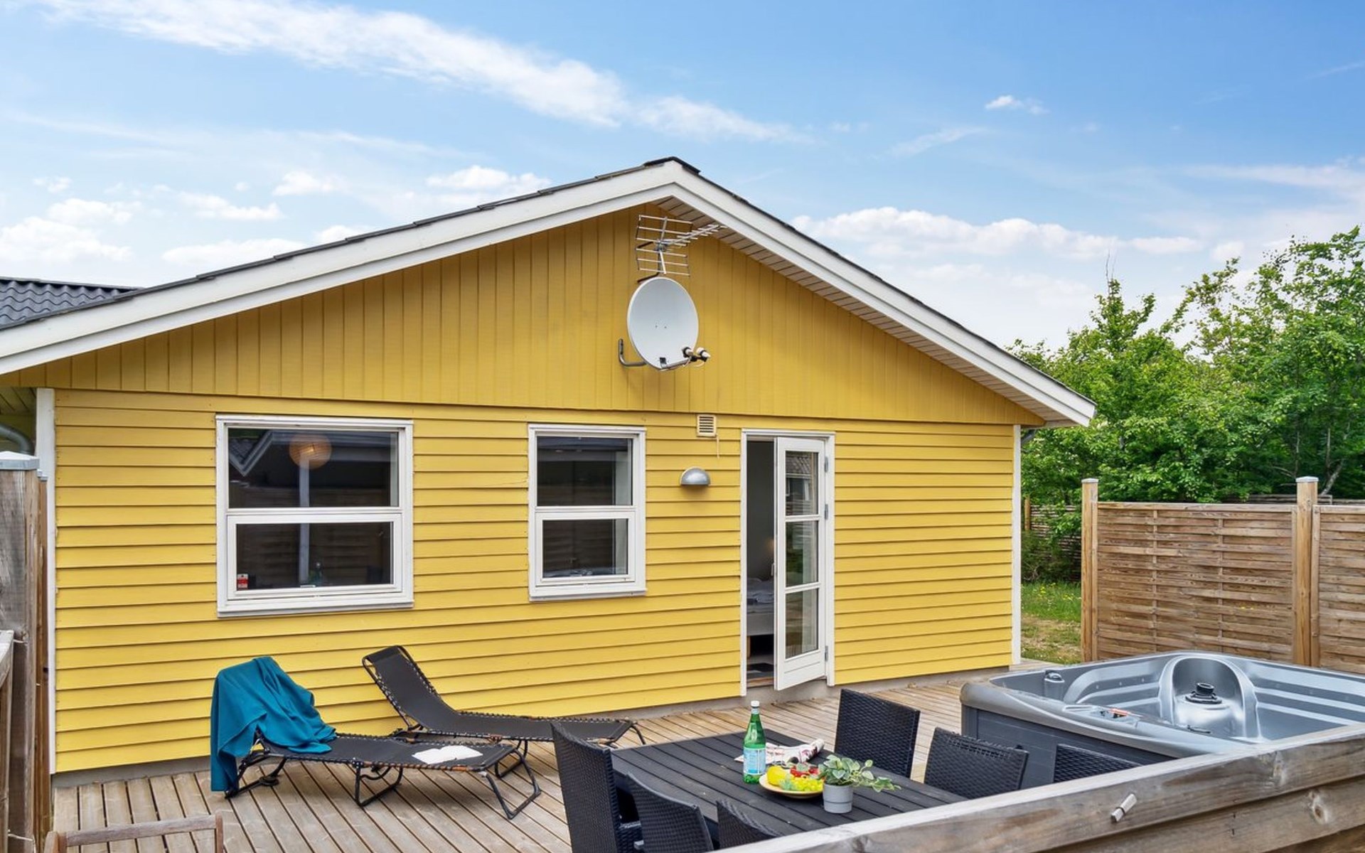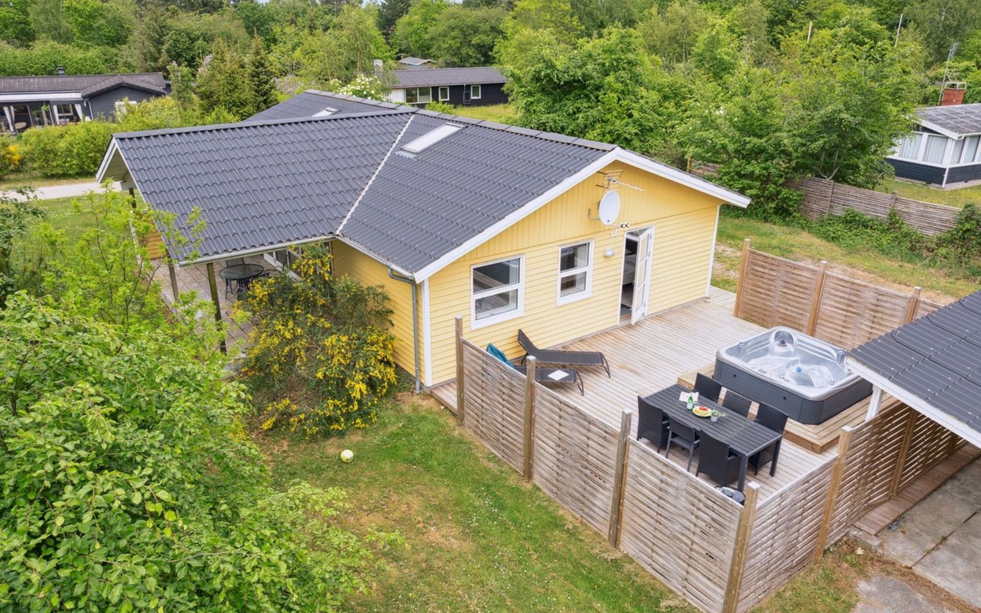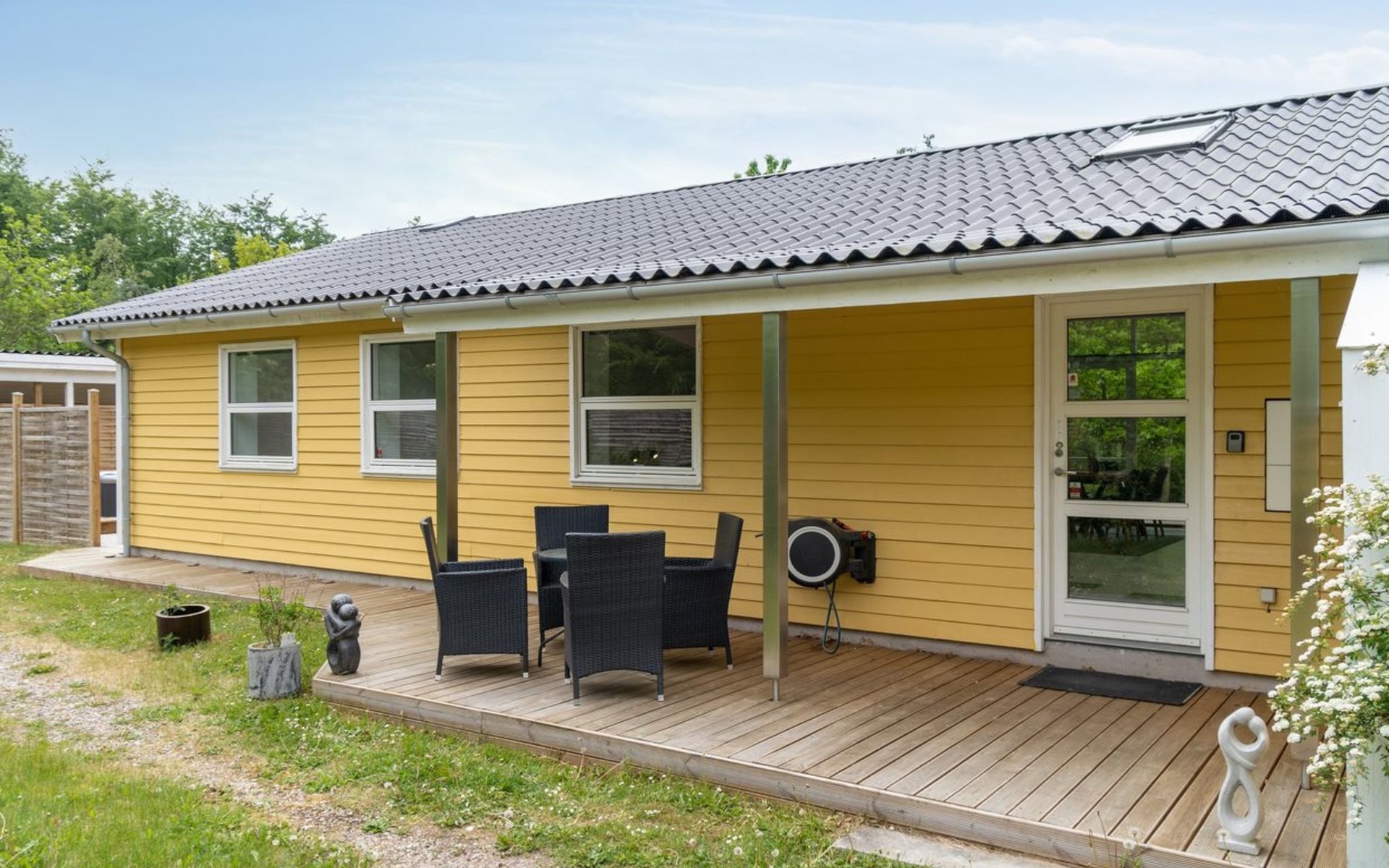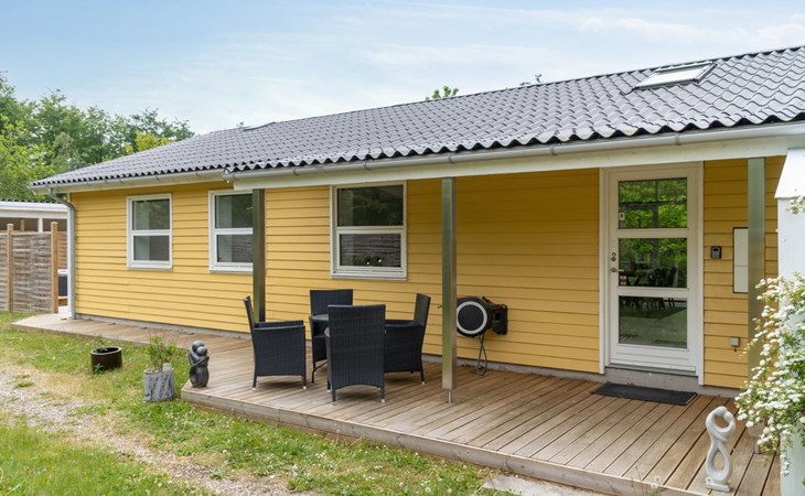 Single-family house, built in 1964. 950 m from the sea. Private: property 1'239 m2, well-kept garden. Terrace (40 m2), barbecue, children's playground (slide, swing). In the house: sauna, washing machine. Parking at the house. Grocery 800 m. Golf course 8.2 km. The owner does not accept any youth groups.