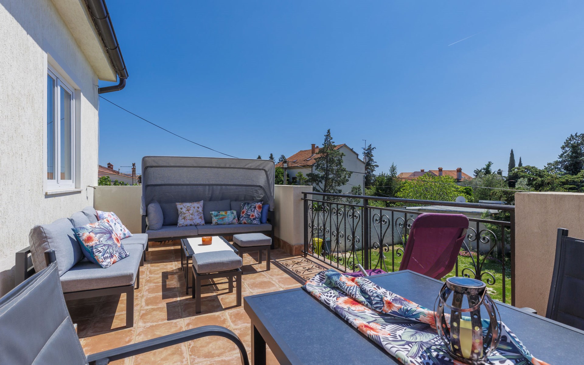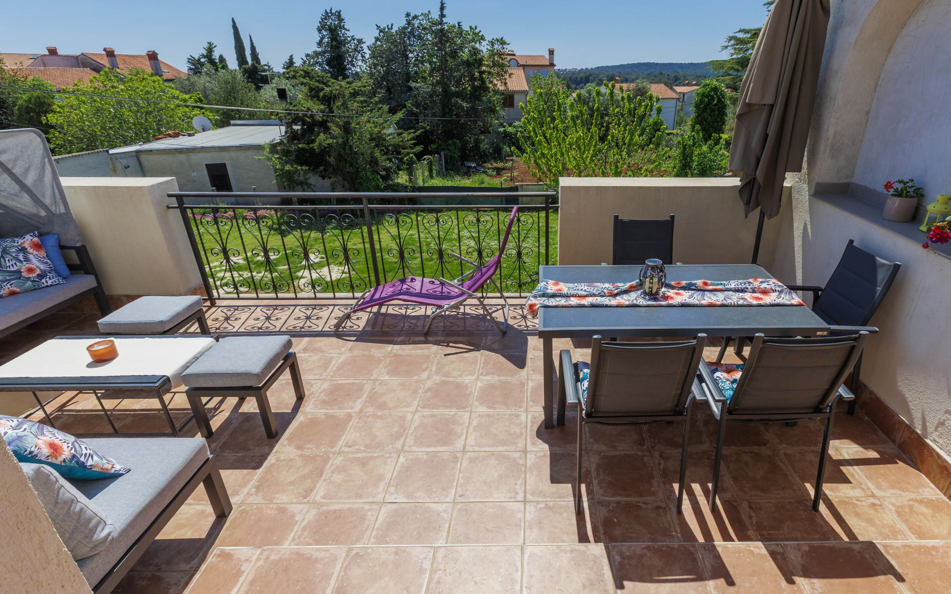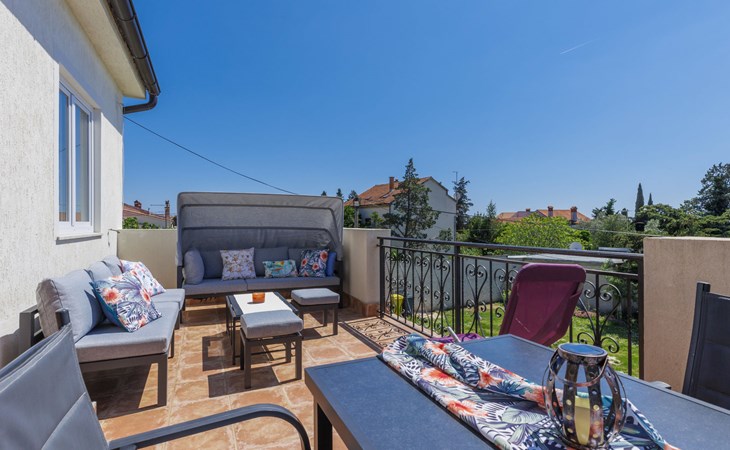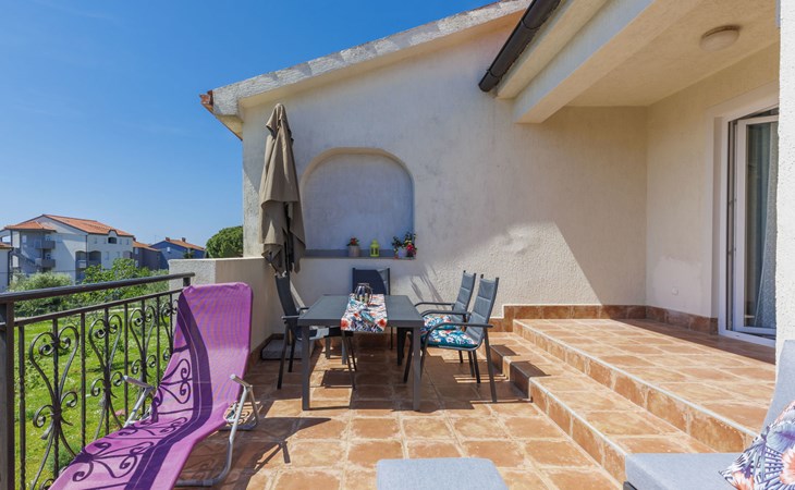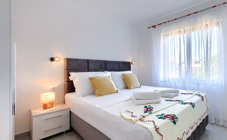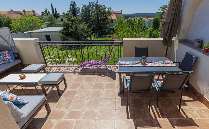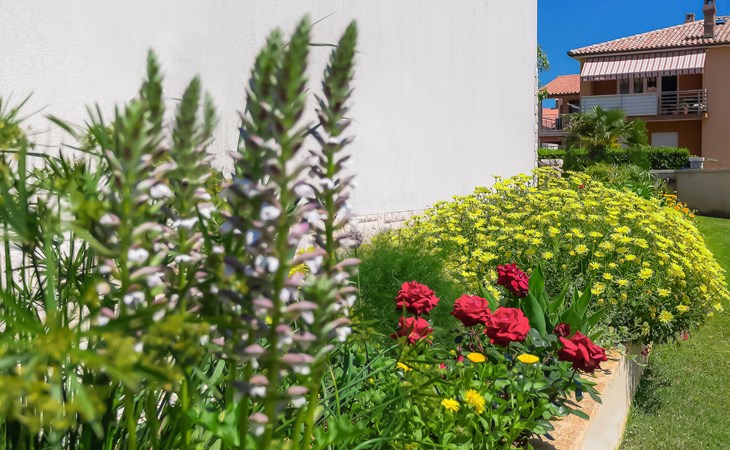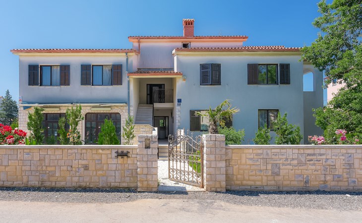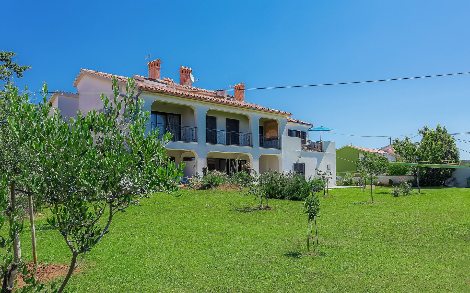 Beautiful apartment house "Muki". 600 m from the centre of Medulin, in a quiet, sunny position, 500 m from the sea, 700 m from the beach. For shared use: property 1'850 m2 (fenced), beautiful garden with lawn and trees. Garden furniture, barbecue. In the house: internet access, storage room for bicycles. Parking at the house on the premises. Shop 200 m, supermarket, restaurant 300 m, bar, bakery 100 m, bus stop 230 m, sandy beach 1 km pebble beach, rocky beach 700 m. Golf course (18 hole) 27 km, surf school 2.5 km, tennis 2.5 km, riding stable 2 km, walking paths from the house 200 m, cycle lane 250 m, children's playground 1 km. Parking for trailer (extra). Video surveillance of the property.