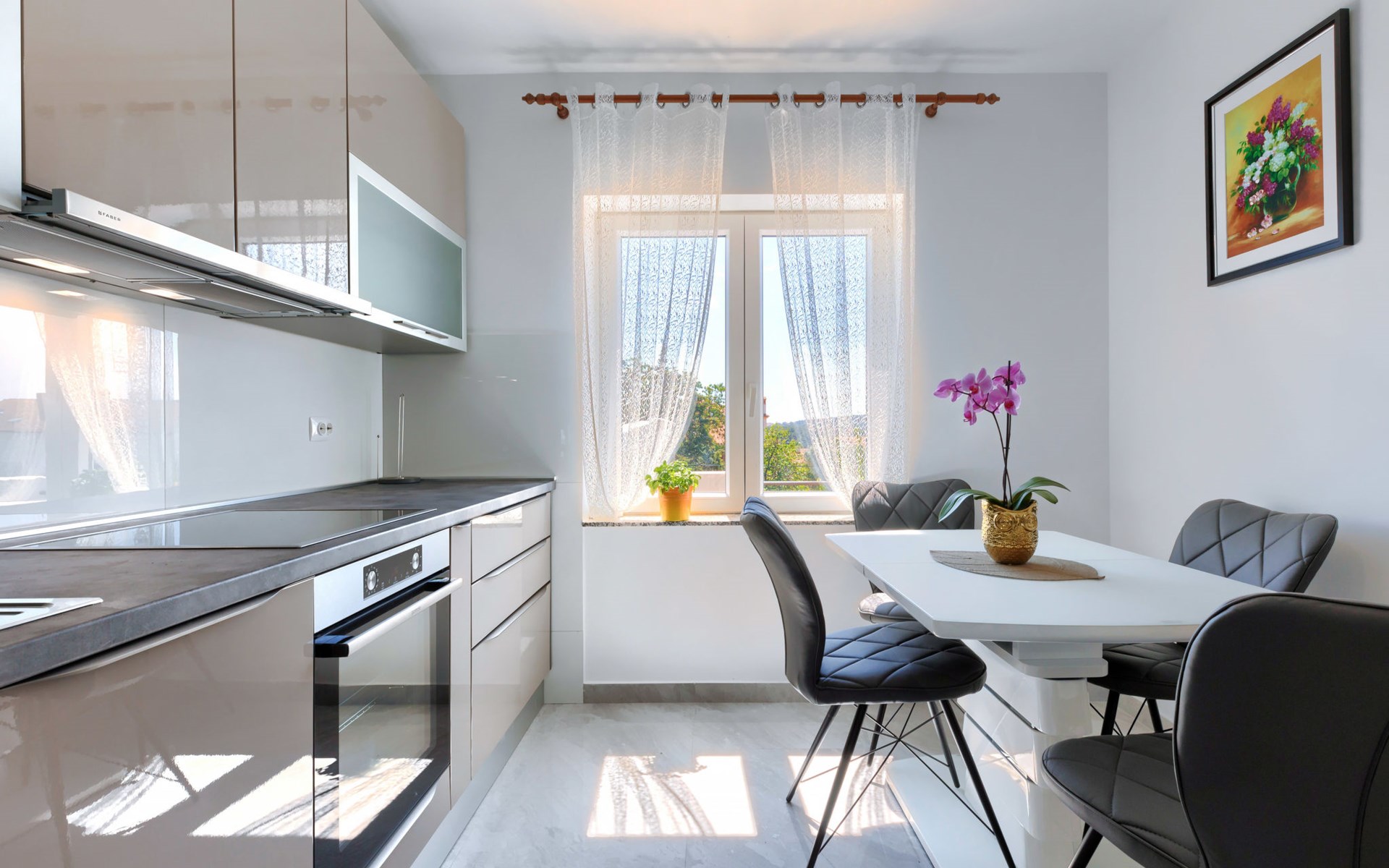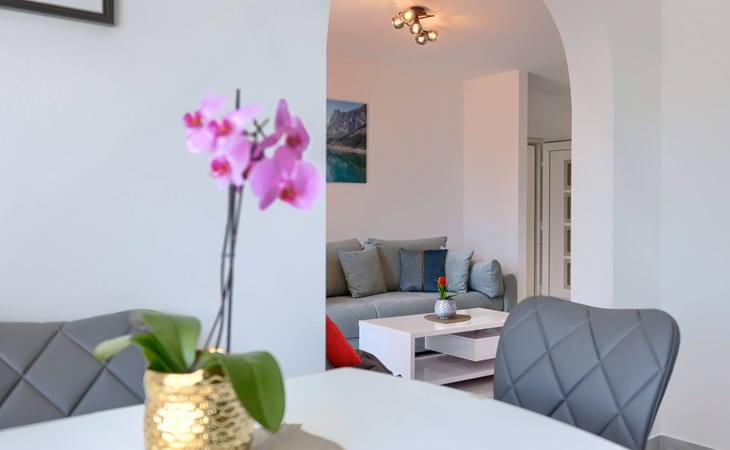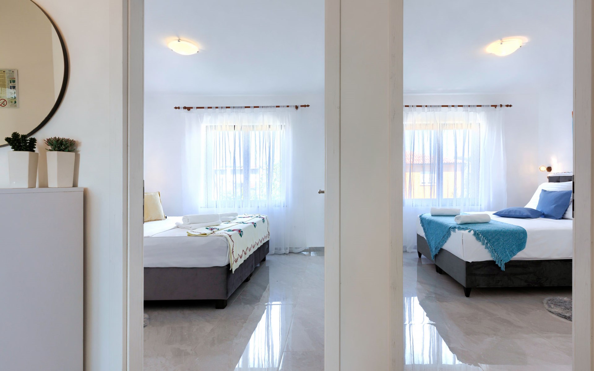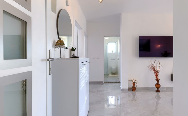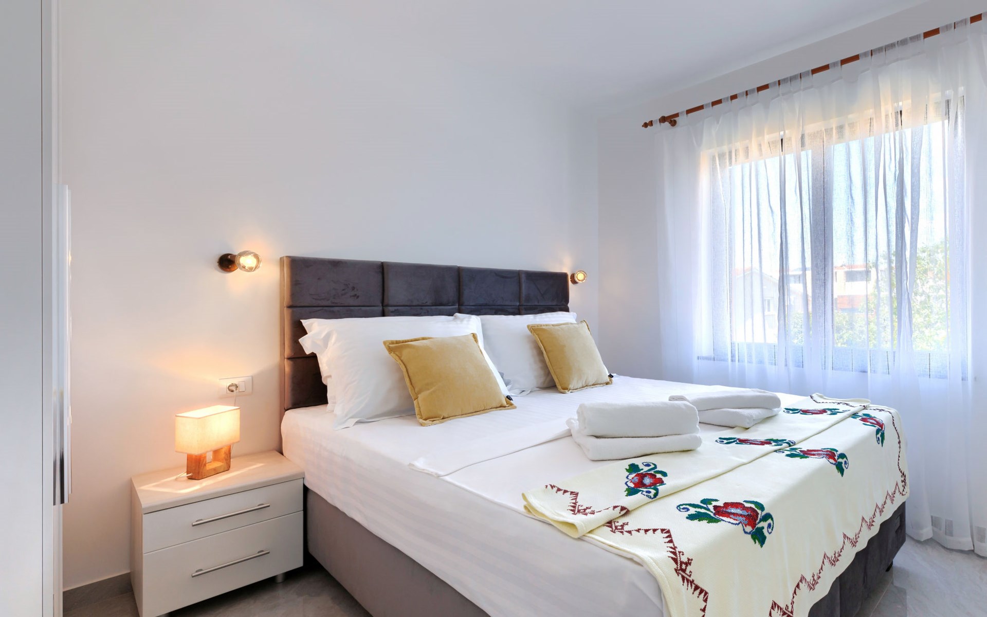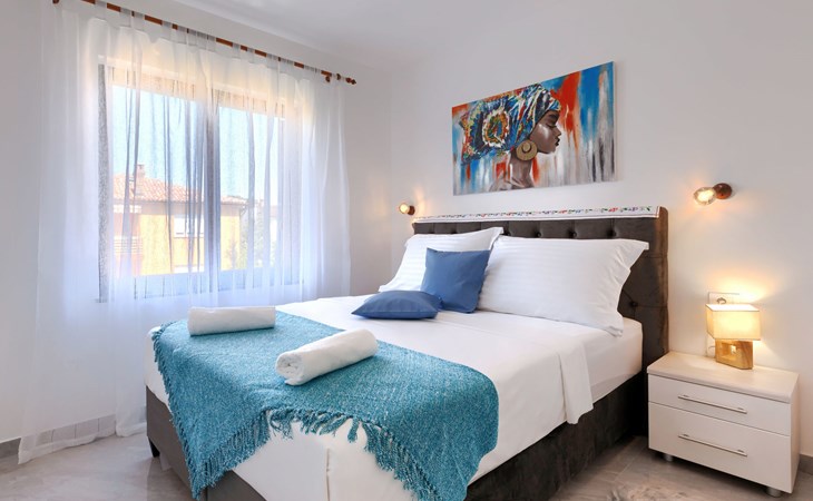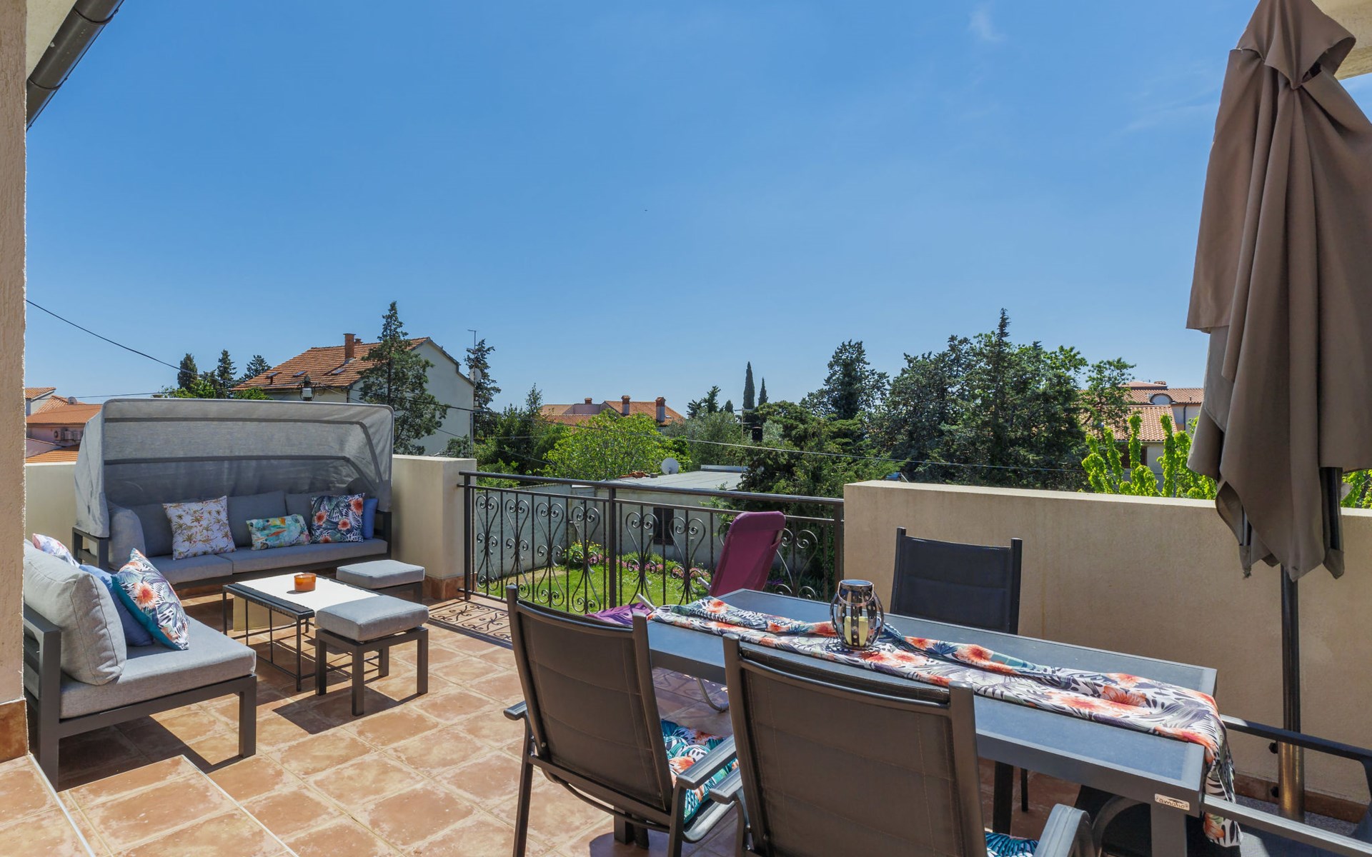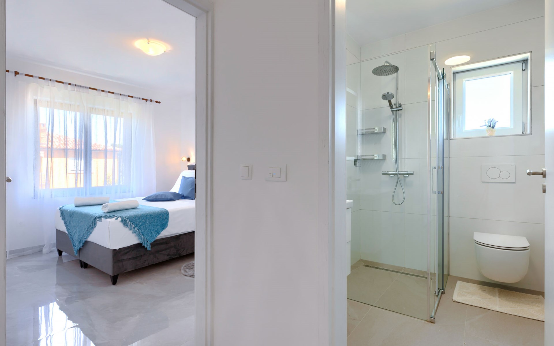 Beautiful apartment house "Muki". 600 m from the centre of Medulin, in a quiet, sunny position, 500 m from the sea, 700 m from the beach. For shared use: property 1'850 m2 (fenced), beautiful garden with lawn and trees. Garden furniture, barbecue. In the house: internet access, storage room for bicycles. Parking at the house on the premises. Shop 200 m, supermarket, restaurant 300 m, bar, bakery 100 m, bus stop 230 m, sandy beach 1 km pebble beach, rocky beach 700 m. Golf course (18 hole) 27 km, surf school 2.5 km, tennis 2.5 km, riding stable 2 km, walking paths from the house 200 m, cycle lane 250 m, children's playground 1 km. Parking for trailer (extra). Video surveillance of the property.