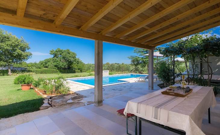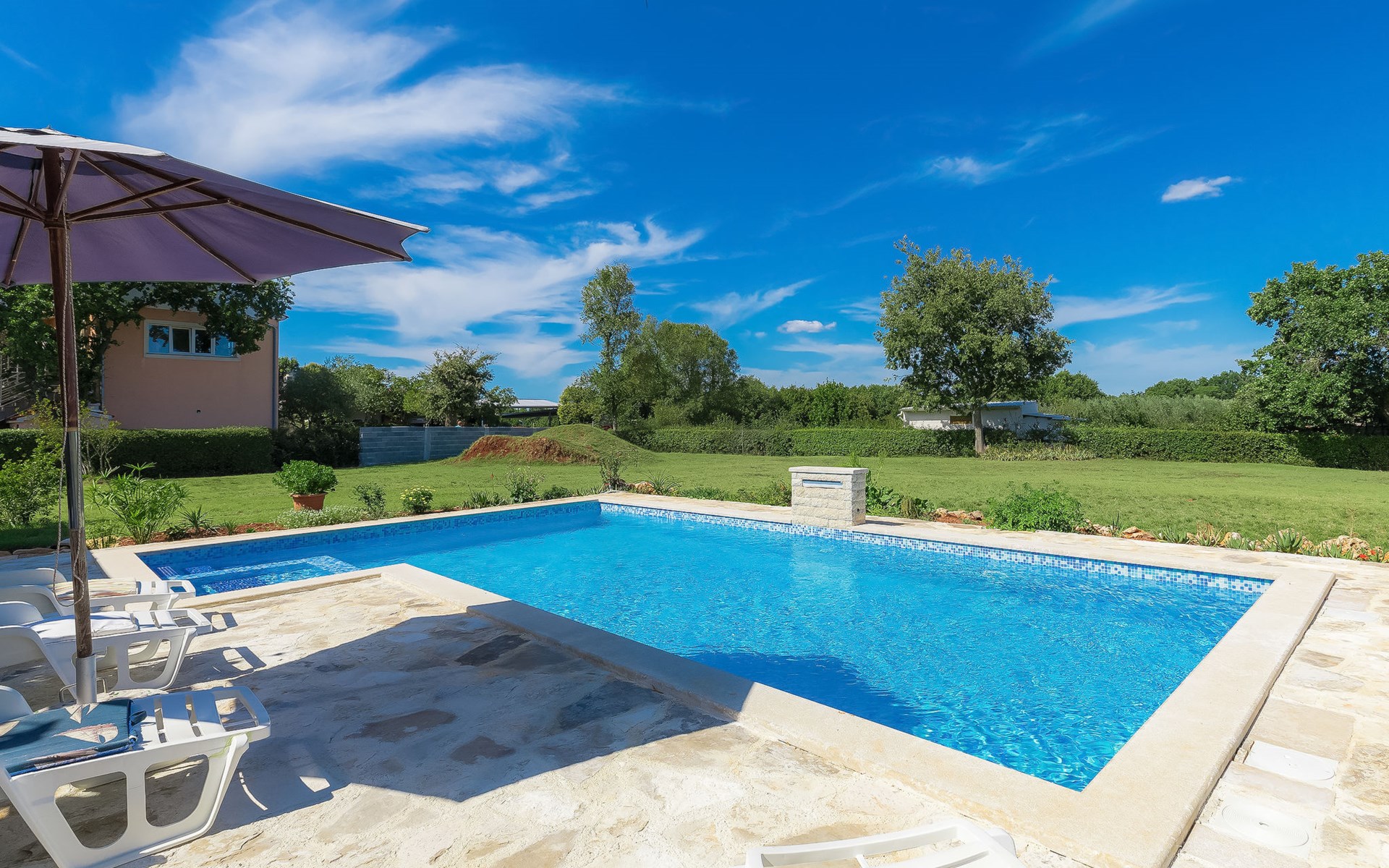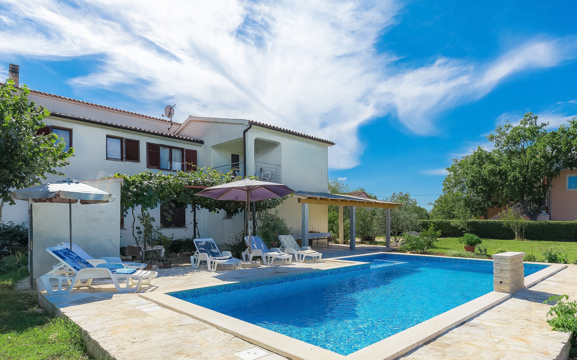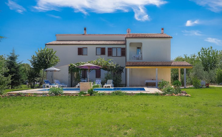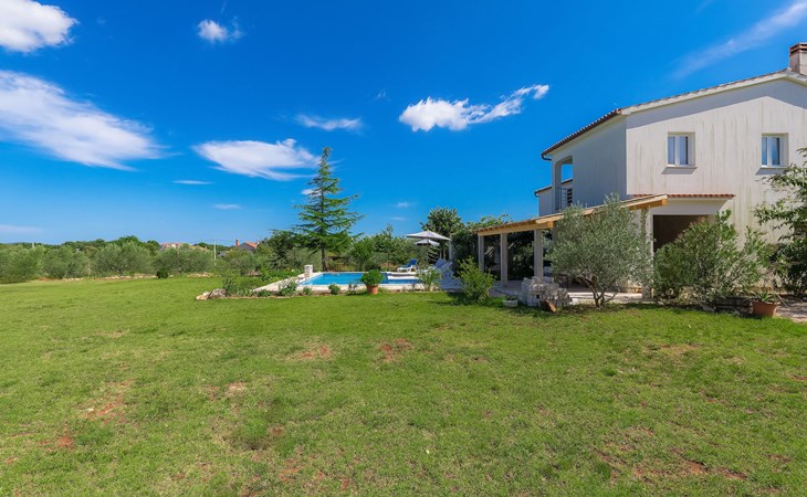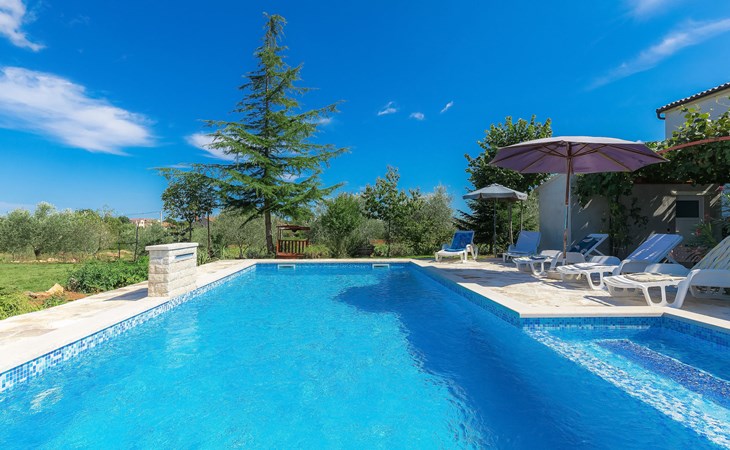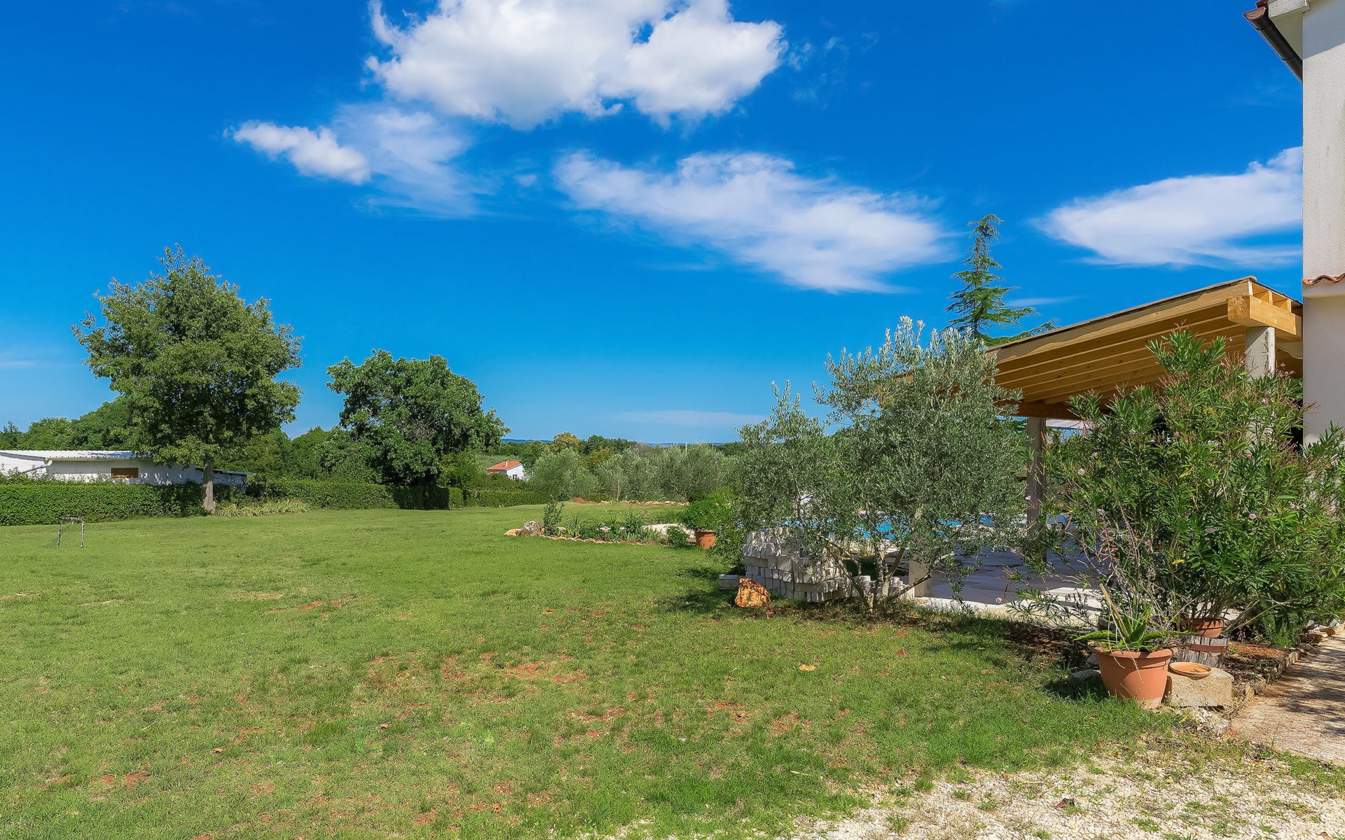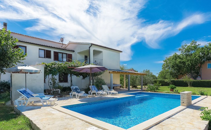 Single-family house "Ana Lucija". 500 m from the centre of Muntić, 10 km from the centre of Marčana, 10 km from the centre of Pula, 12 km from the sea, 12 km from the beach. Private: property 1'000 m2, wildlife garden, meadow, swimming pool (9 x 4 m, depth 135 cm, seasonal availability: 01.May. - 07.Oct.) with internal staircase. Paddling pool, table tennis, patio, barbecue. In the house: internet access, washing machine. Parking (for 3 cars) on the premises. Shop 500 m, supermarket 7 km, restaurant 6 km, bus stop 240 m, pebble beach 15 km, rocky beach 12 km. Marina 12 km. Please note: airfield 4 km from the property. Ground floor is closed and not occupied. The house consists of 2 apartments, rented as one unit.