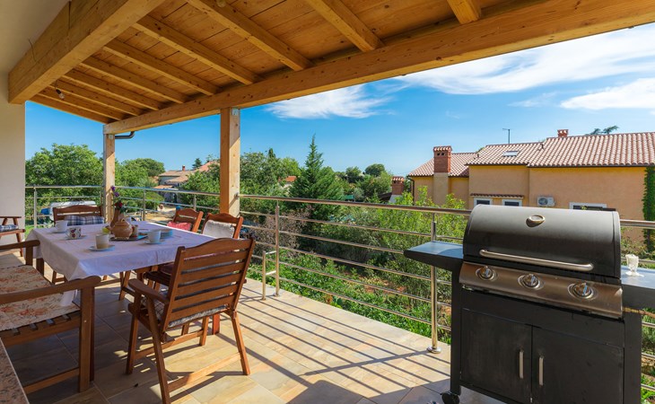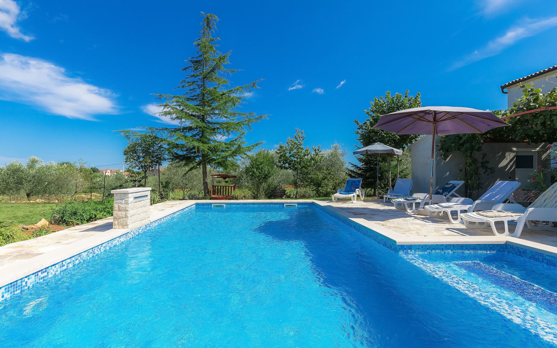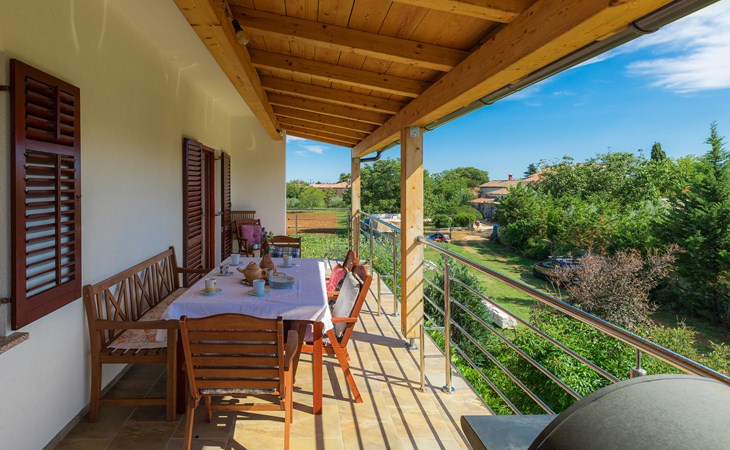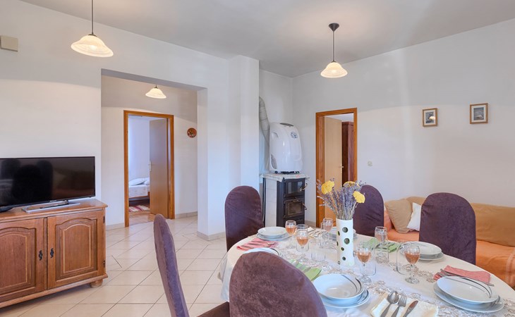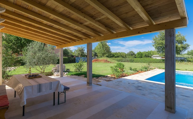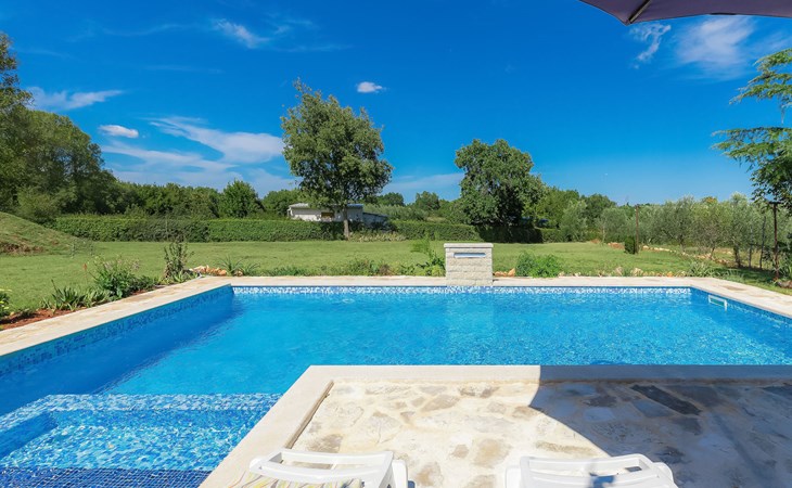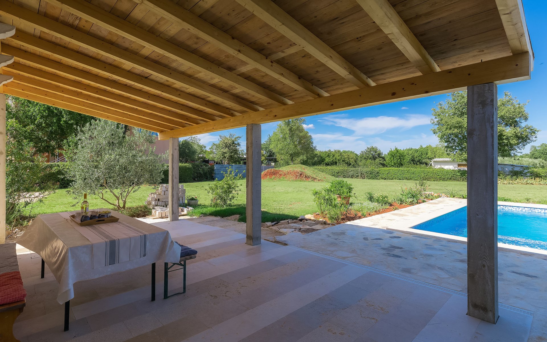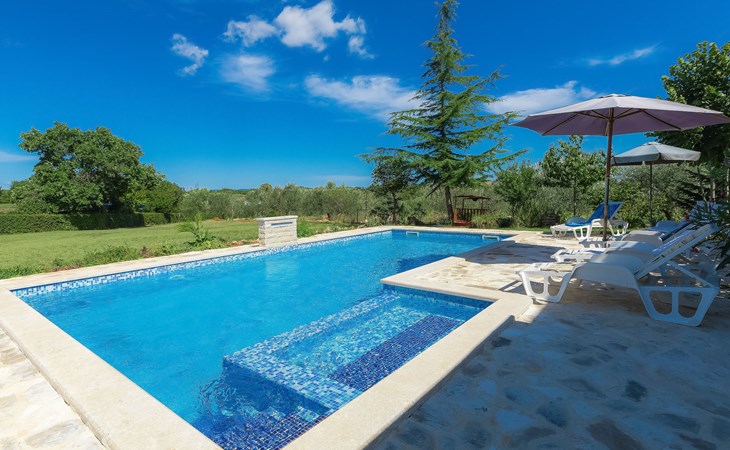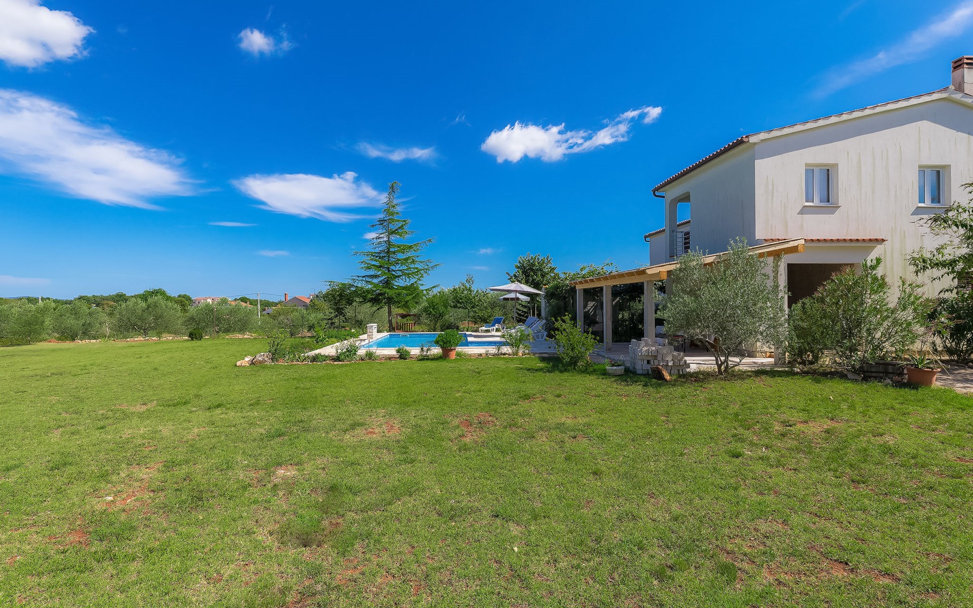 Single-family house "Ana Lucija". 500 m from the centre of Muntić, 10 km from the centre of Marčana, 10 km from the centre of Pula, 12 km from the sea, 12 km from the beach. Private: property 1'000 m2, wildlife garden, meadow, swimming pool (9 x 4 m, depth 135 cm, seasonal availability: 01.May. - 07.Oct.) with internal staircase. Paddling pool, table tennis, patio, barbecue. In the house: internet access, washing machine. Parking (for 3 cars) on the premises. Shop 500 m, supermarket 7 km, restaurant 6 km, bus stop 240 m, pebble beach 15 km, rocky beach 12 km. Marina 12 km. Please note: airfield 4 km from the property. Ground floor is closed and not occupied. The house consists of 2 apartments, rented as one unit.