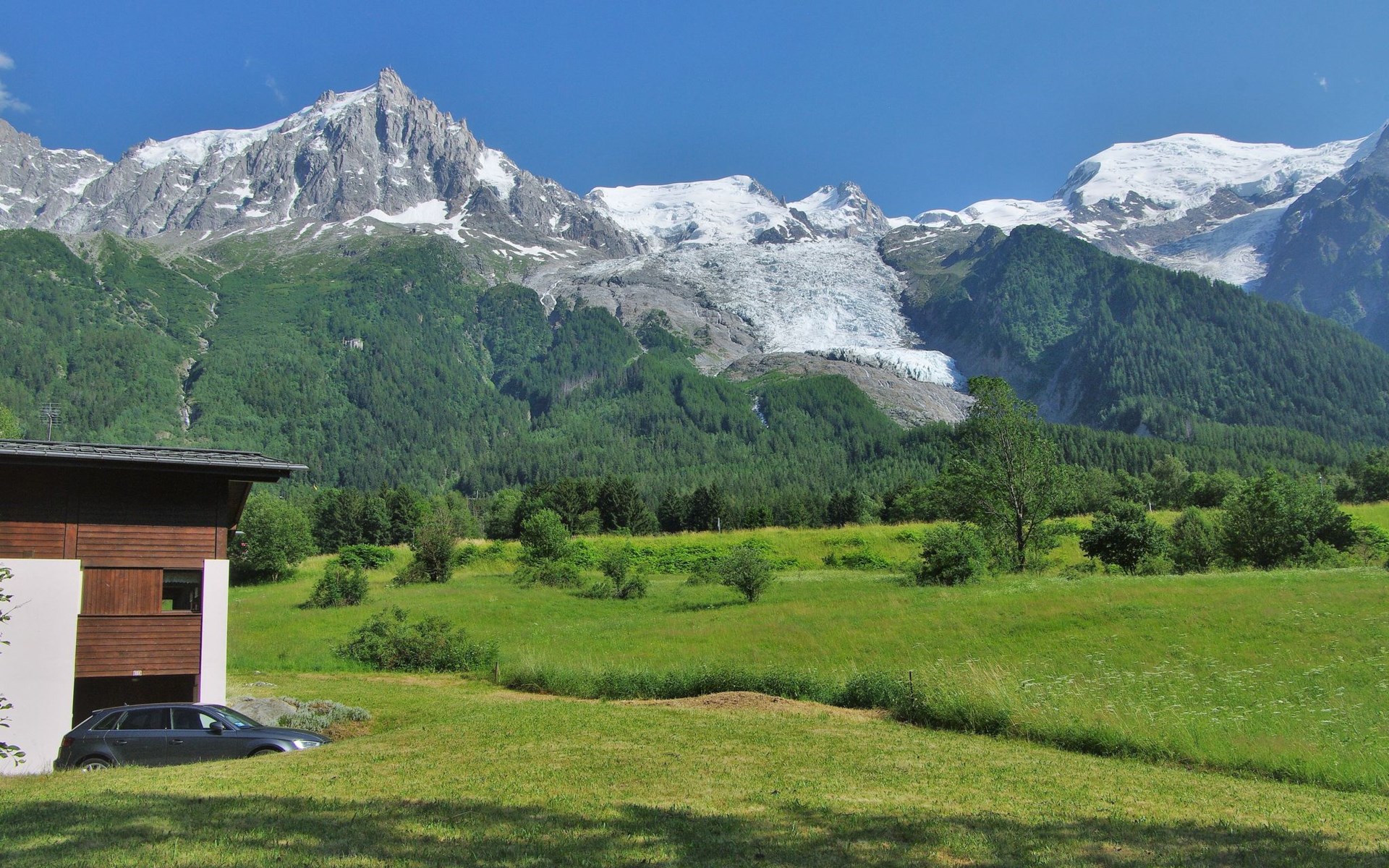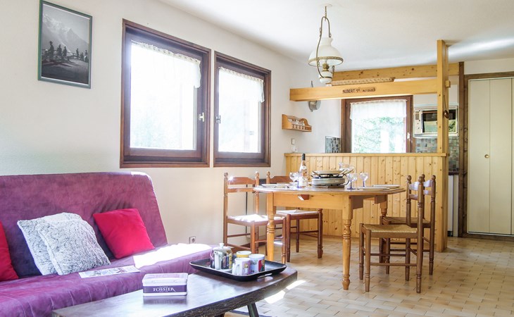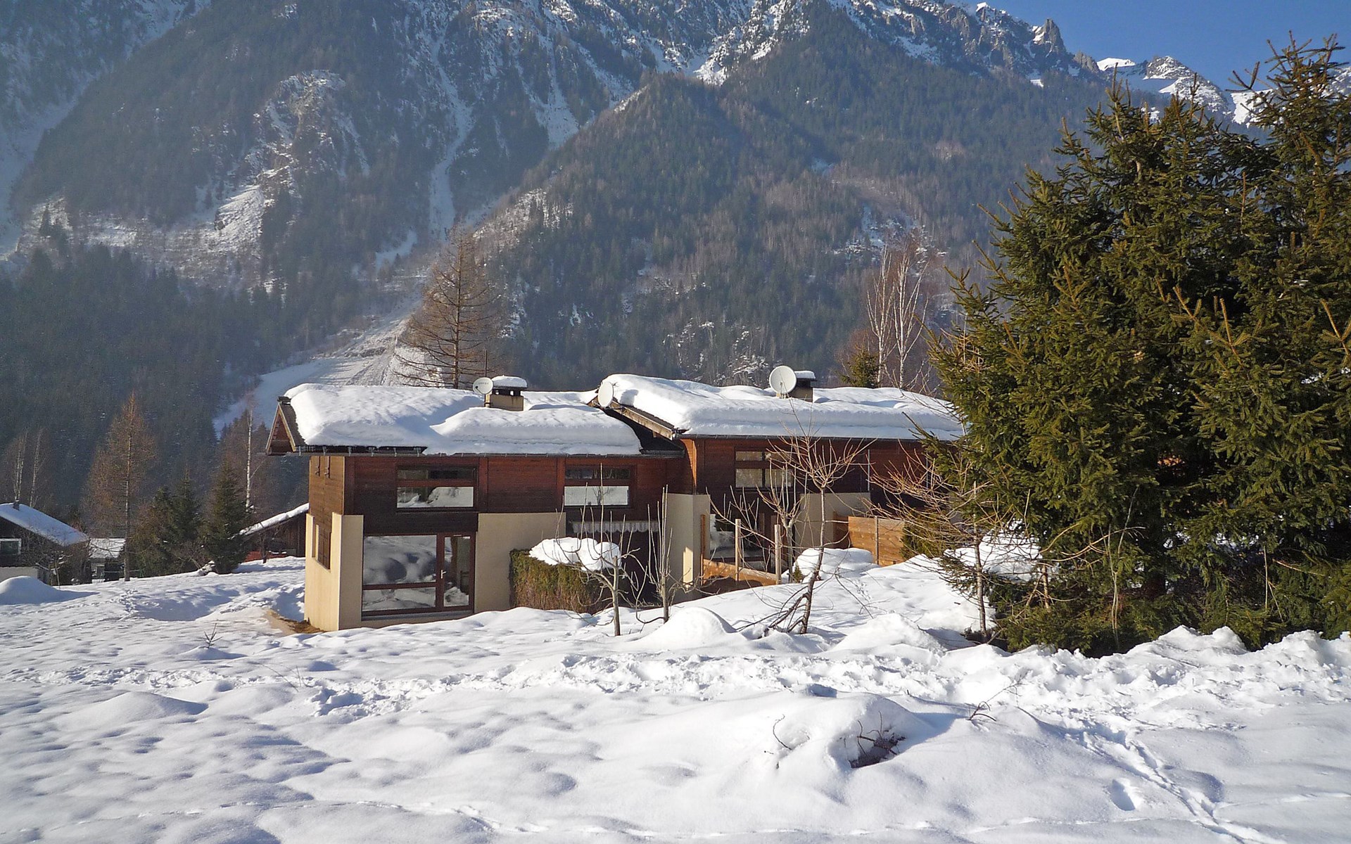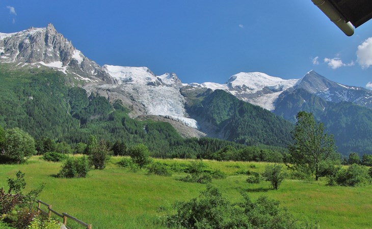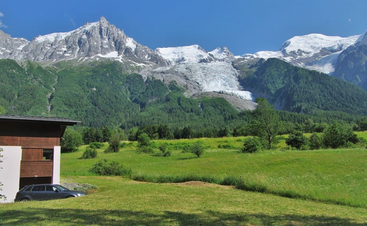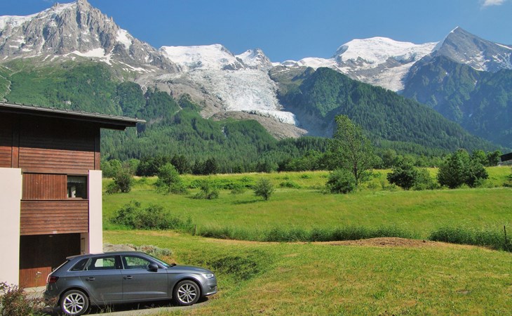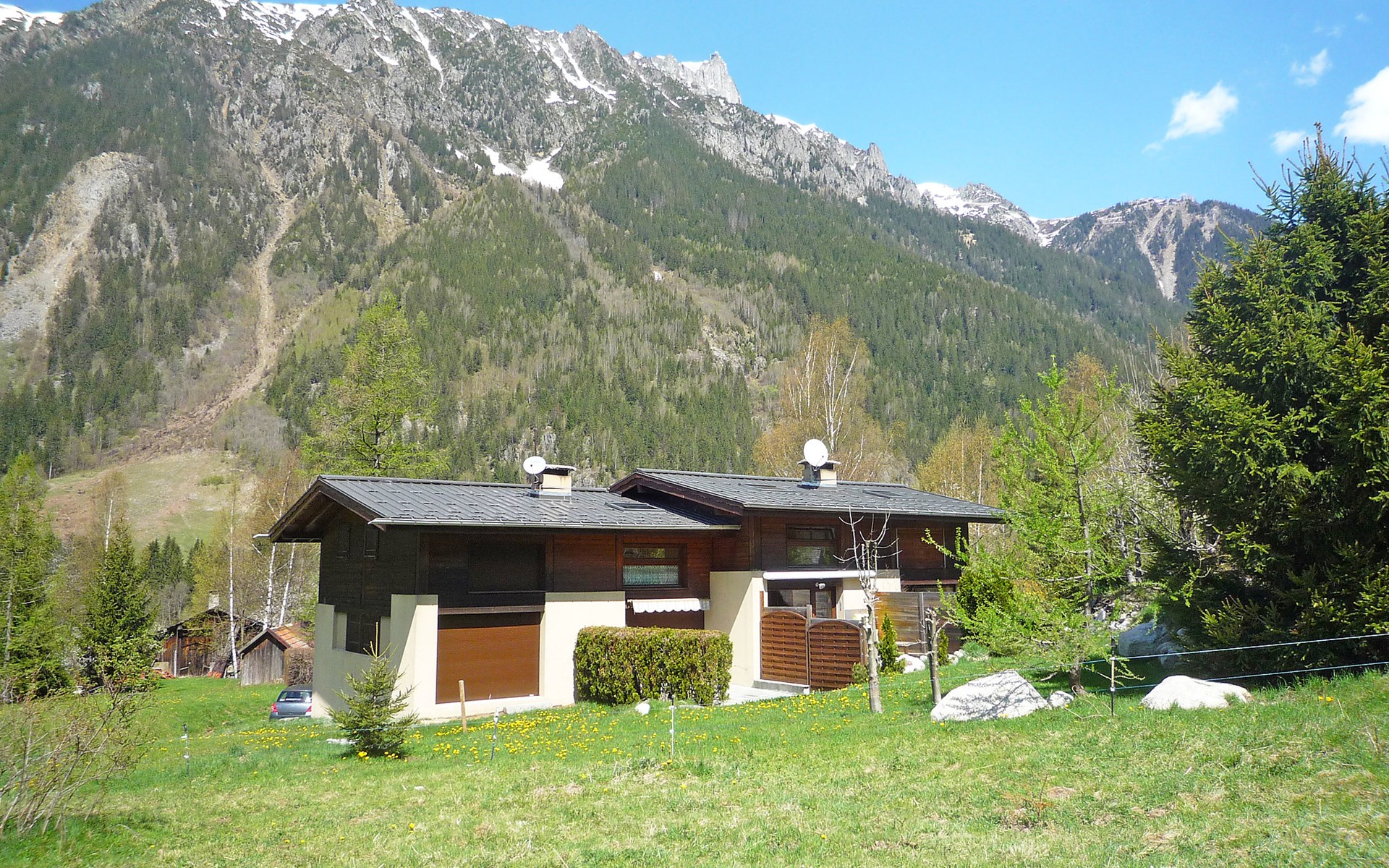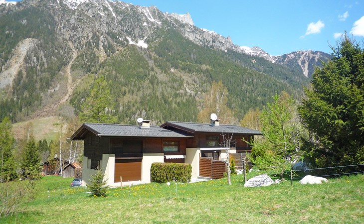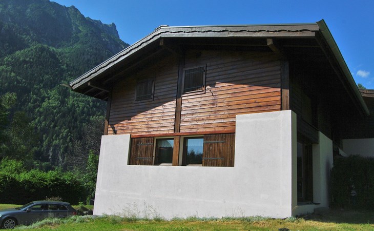 Semi-detached house "Les Pelarnys", 3 storeys, terraced, surrounded by meadows. In the district of Pélerins, 2.8 km from the centre. Parking. Shopping centre, restaurant 3 km, bus stop 600 m, railway station "Chamonix" 3 km. Golf course (18 hole) 6 km, sports centre 3 km, skisport facilities 2.7 km, ski school 3.1 km, cross country ski track 3 km. Please note: car recommended. Main road 300 m from the property.