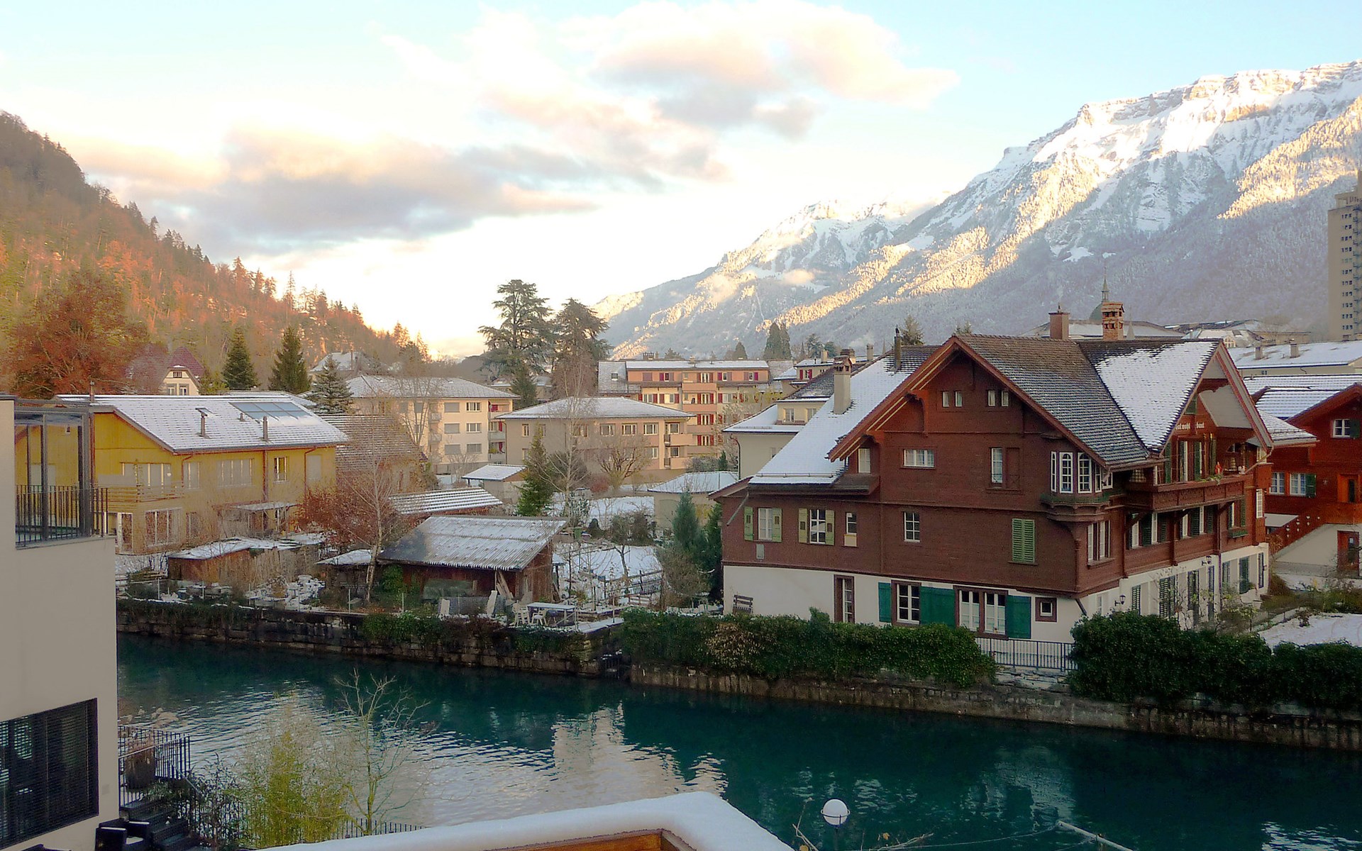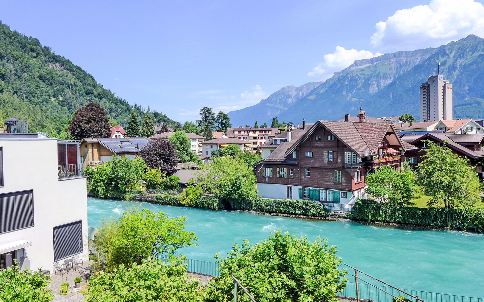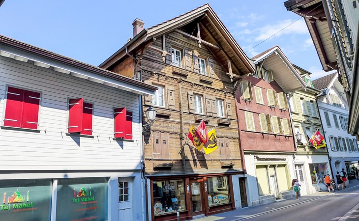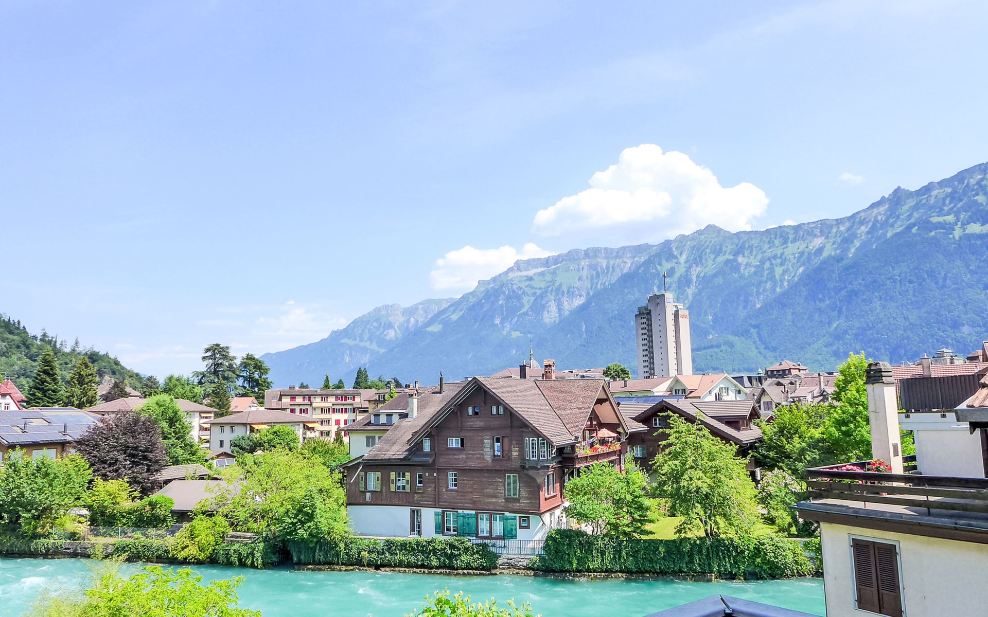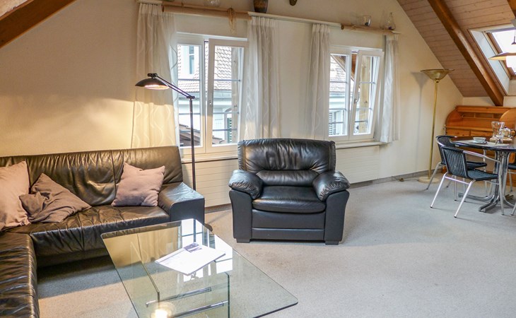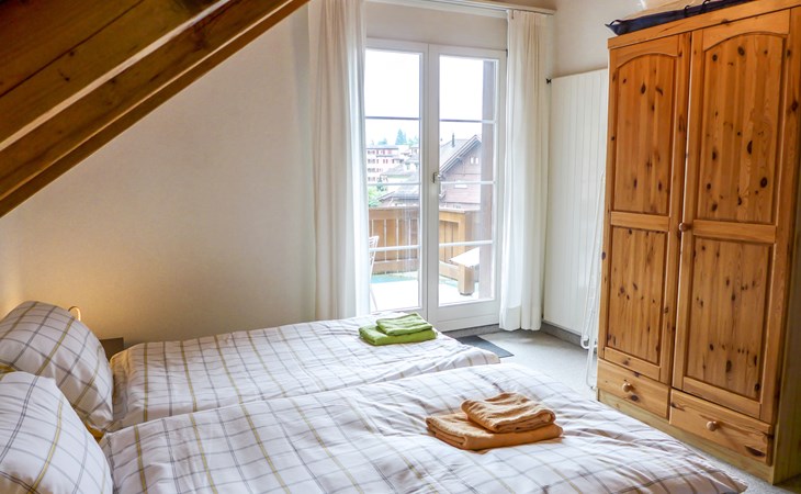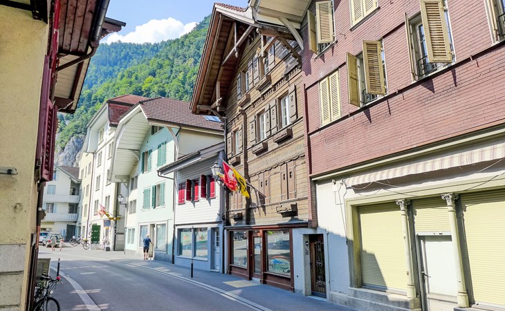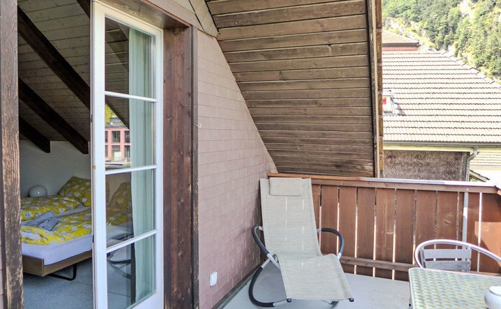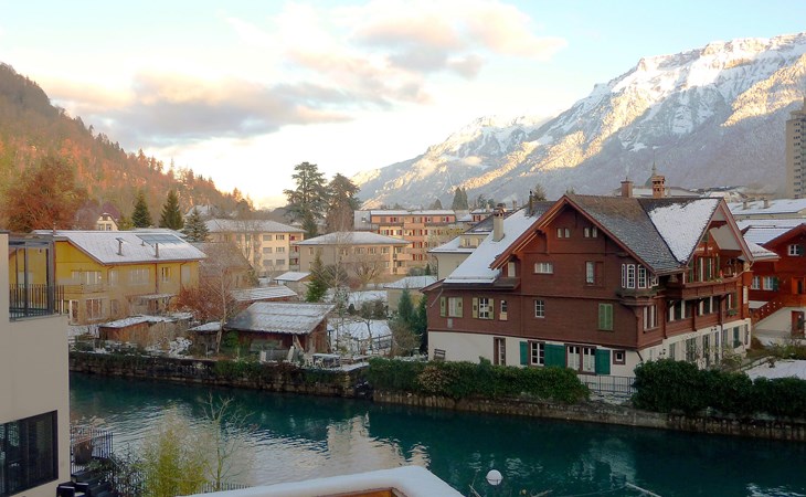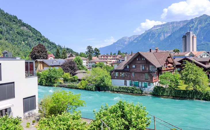 Interlaken: Historical apartment house, 3 storeys. In the resort 250 m from the centre of Interlaken, in a central position, in the heart of the city, 300 m from the edge of the forest, 100 m from the river. Public parking 100 m extra. Shop 100 m, supermarket, shopping centre 300 m, restaurant 50 m, bar, bakery 100 m, café 200 m, bus stop "Stadthaus" 180 m, railway station "Interlaken West" 400 m, outdoor swimming pool, indoor swimming pool 300 m. Golf course (18 hole) 1.5 km, surf school 1.5 km, tennis, indoor tennis centre, minigolf, riding stable 600 m, walking paths from the house 50 m, skisport facilities 25 km, ski bus stop 400 m. Nearby attractions: Jungfraujoch Top of Europe, Schilthorn Piz Gloria, Ballenberg Freilichtumuseum. Well-known ski regions can easily be reached: Grindelwald Kleine Scheidegg, Wengen Männlichen, Mürren Schilthorn. Well-known lakes can easily be reached: Thuner- und Brienzersee 2 km. Hiking paths: Jungfrau Region. Please note: no lift. Ski bus (free of charge).
