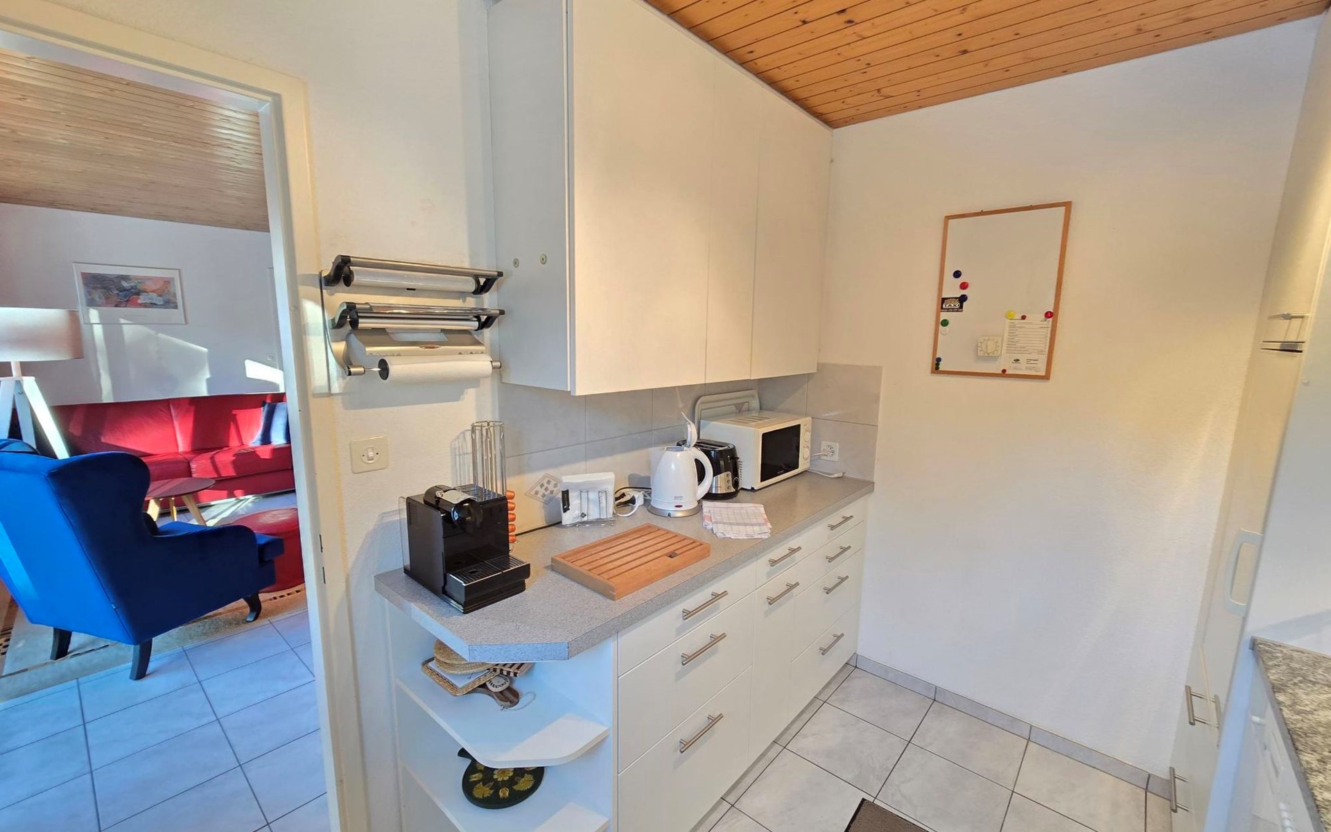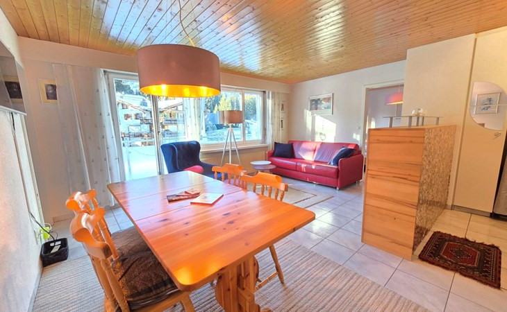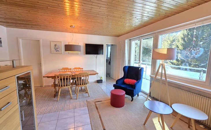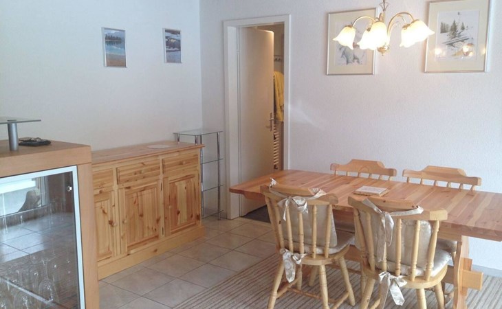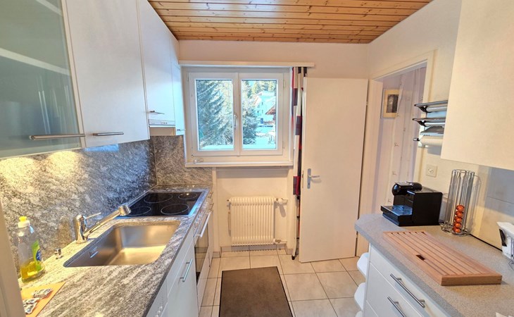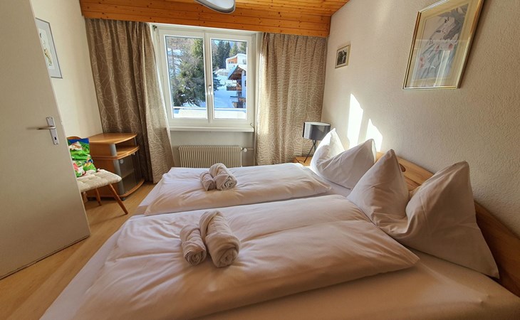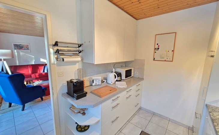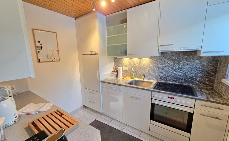 2.5-room apartment on the 3rd floor for 4 people, consisting of a living room, kitchen, 1 bedroom, bathroom/toilet and a spacious and sunny balcony. The kitchen is equipped with everything you need for a cozy holiday (Nespresso machine, kettle, dishwasher, oven, refrigerator with freezer, raclette oven, fondue set, etc.)