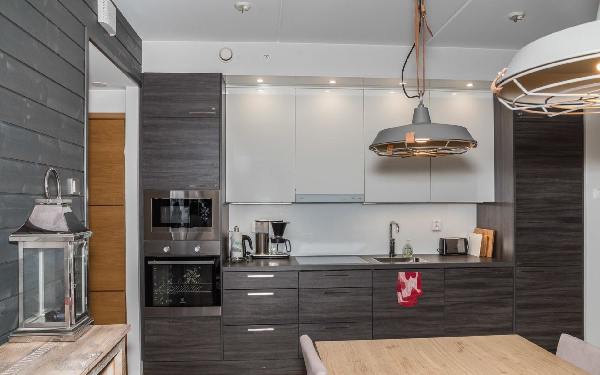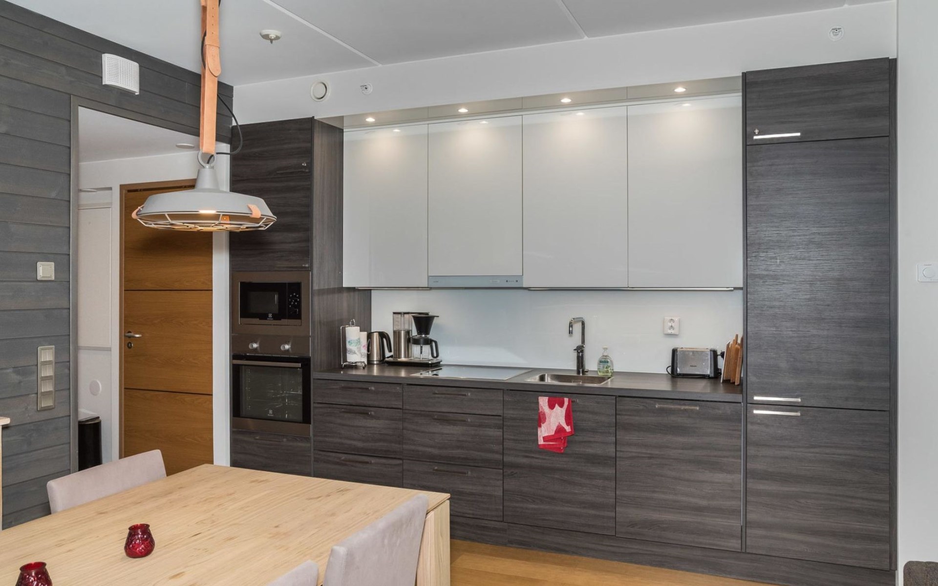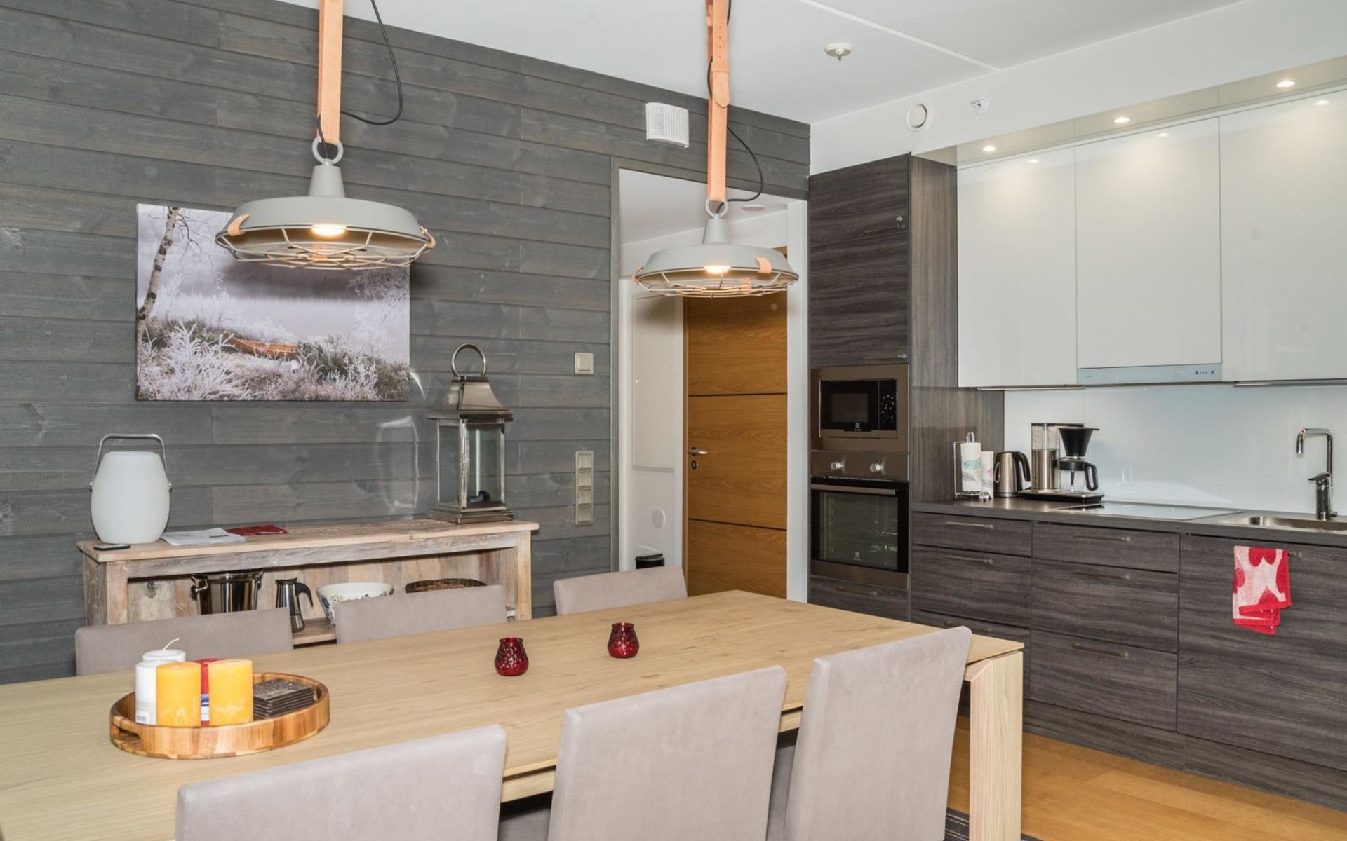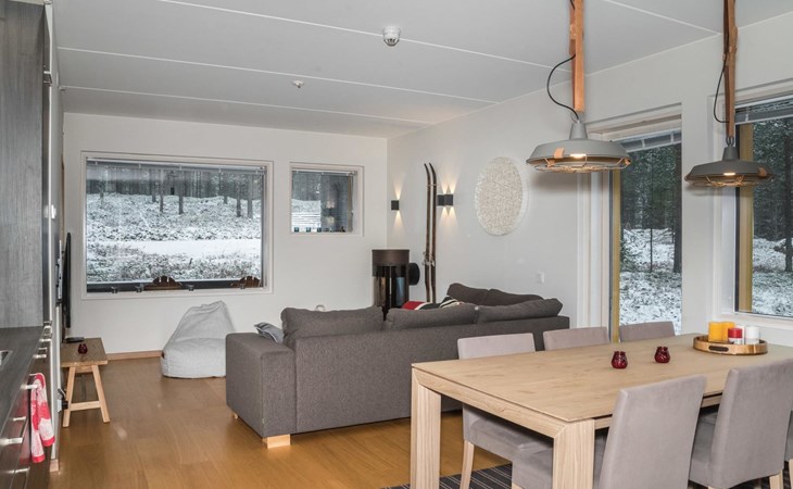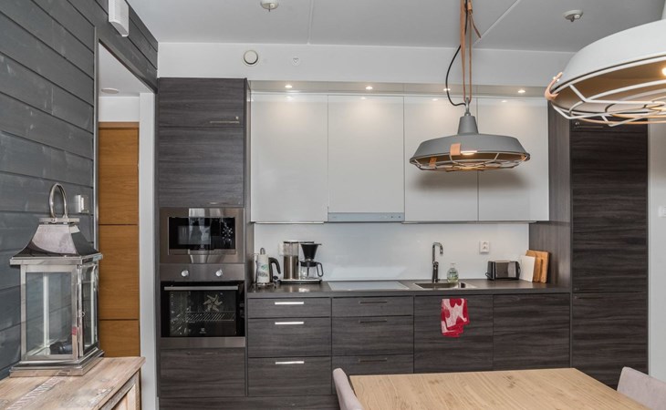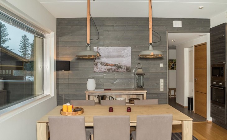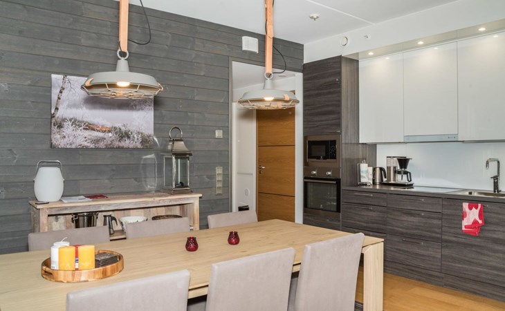 The living room and dining area are spacious, cohesive spaces. You can enjoy the atmosphere by the fireplace in the living room, and you can easily admire the views from the terrace, where's access from the dining area. The modern bathroom with sauna offers gentle steam and you can relax in the bathtub after a day outdoors. The apartment also has a separate toilet with shower which adds practicality when there are more people.