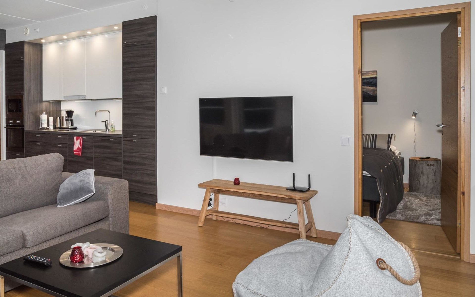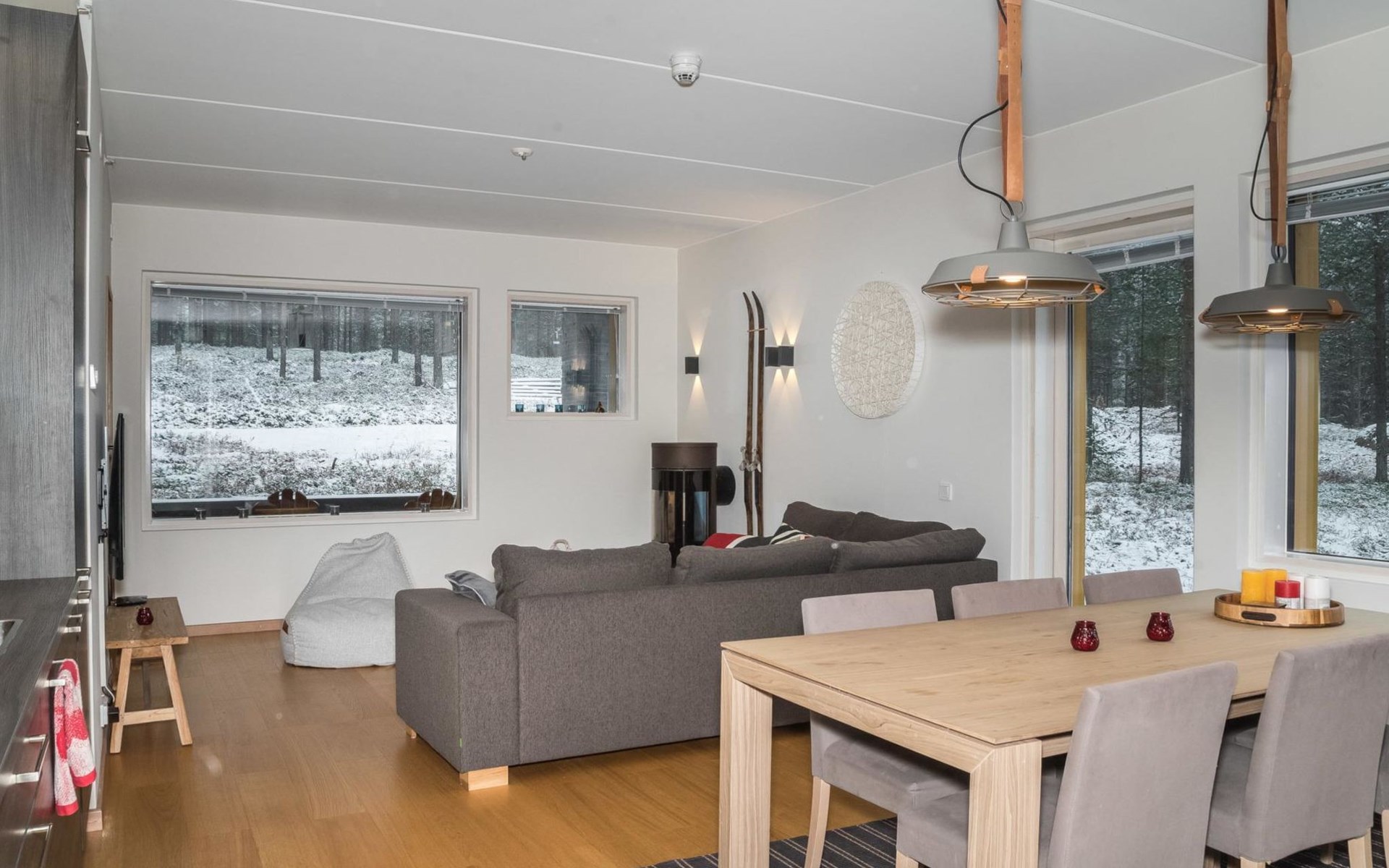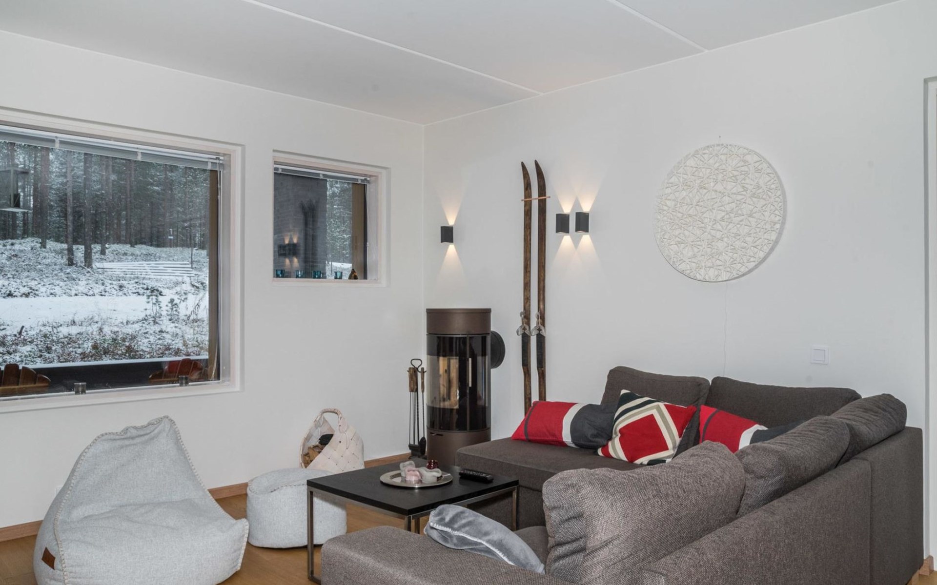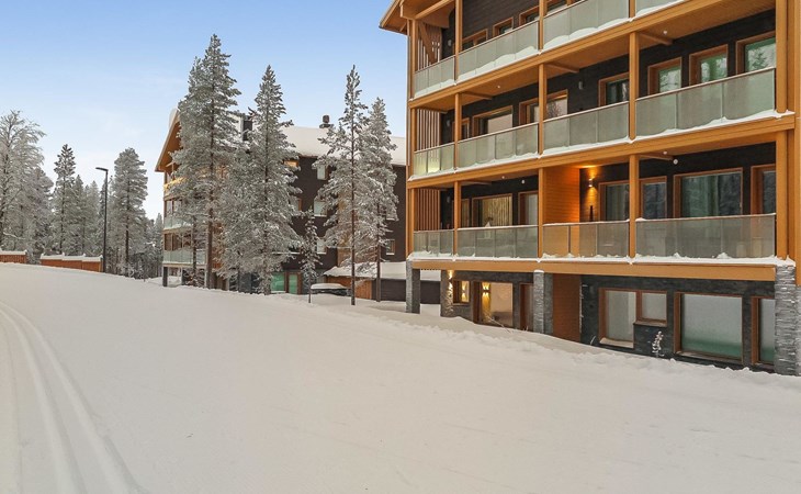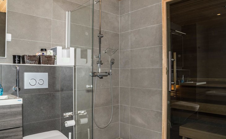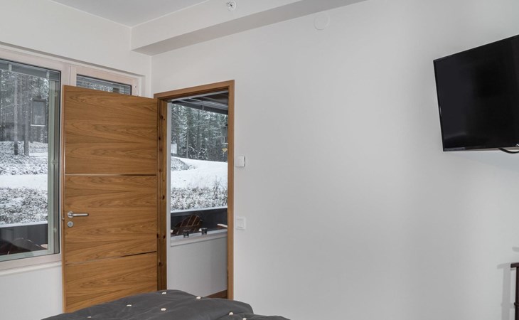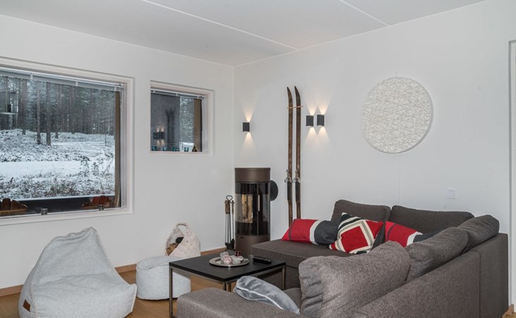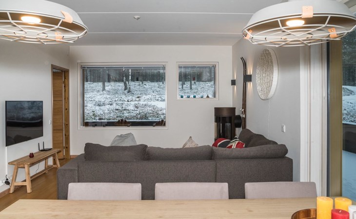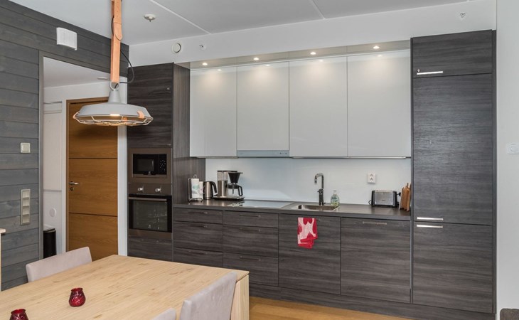 The living room and dining area are spacious, cohesive spaces. You can enjoy the atmosphere by the fireplace in the living room, and you can easily admire the views from the terrace, where's access from the dining area. The modern bathroom with sauna offers gentle steam and you can relax in the bathtub after a day outdoors. The apartment also has a separate toilet with shower which adds practicality when there are more people.
