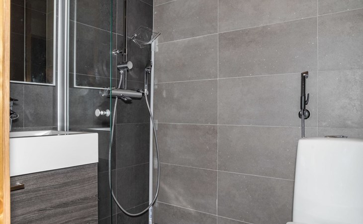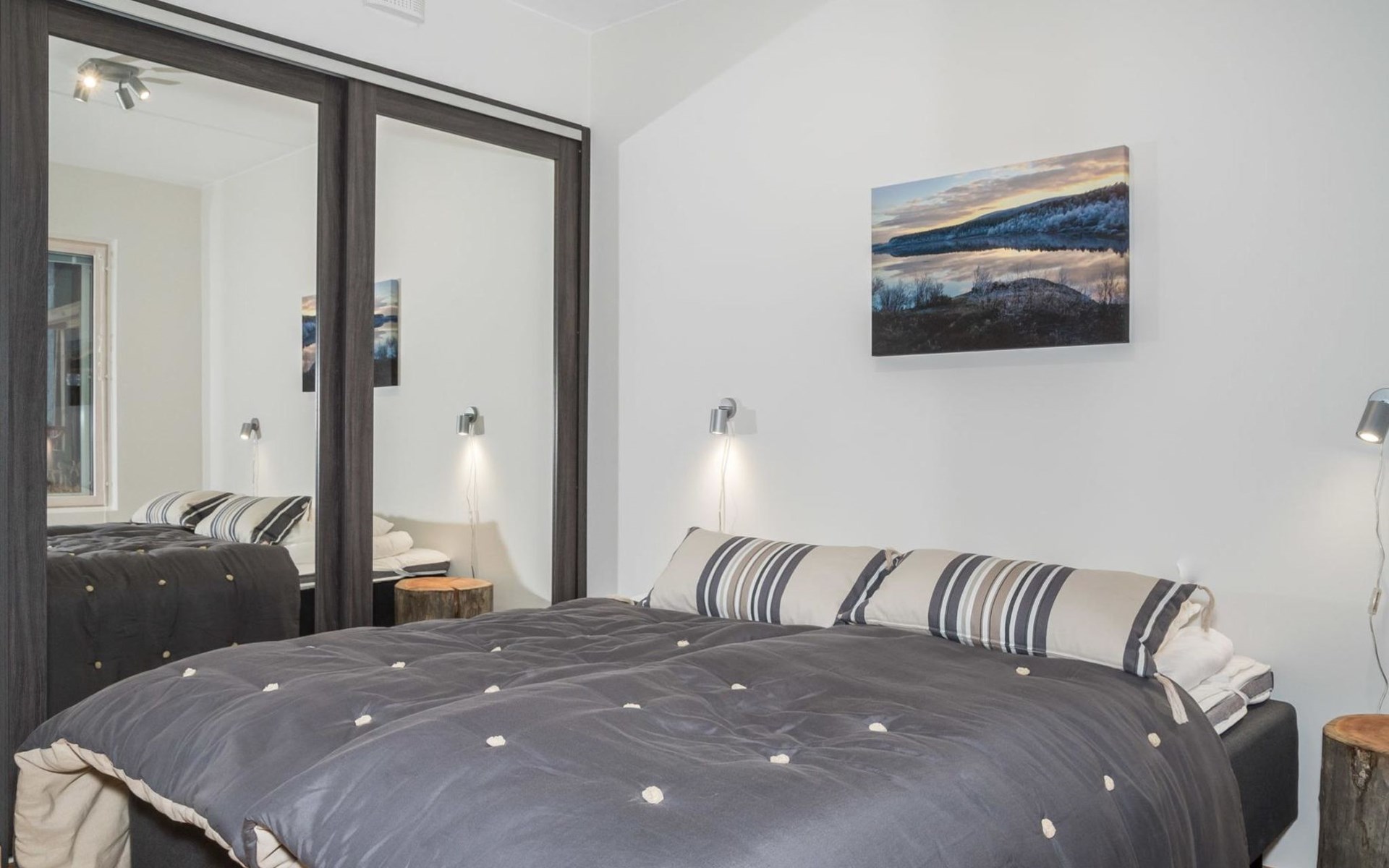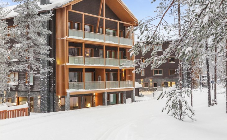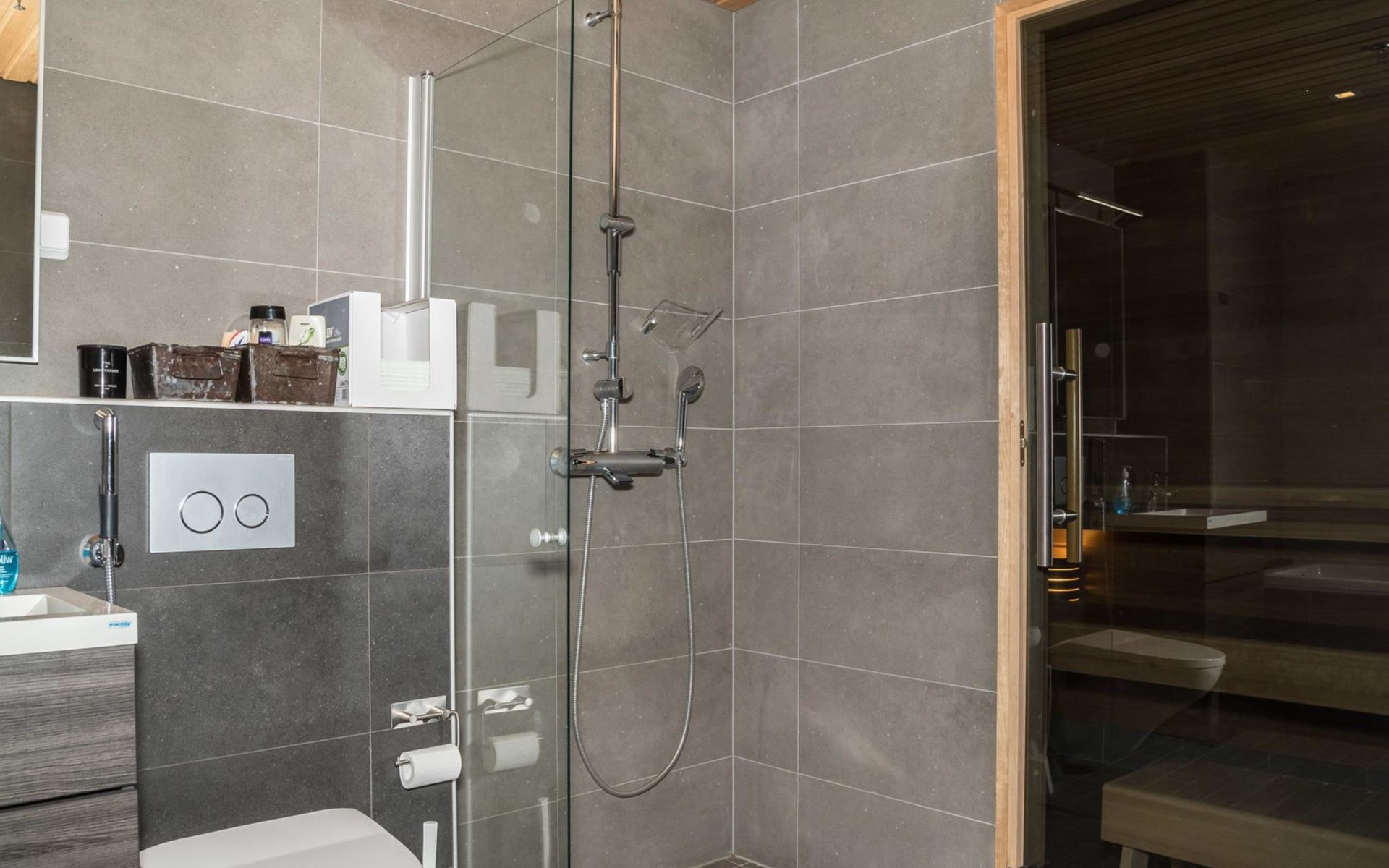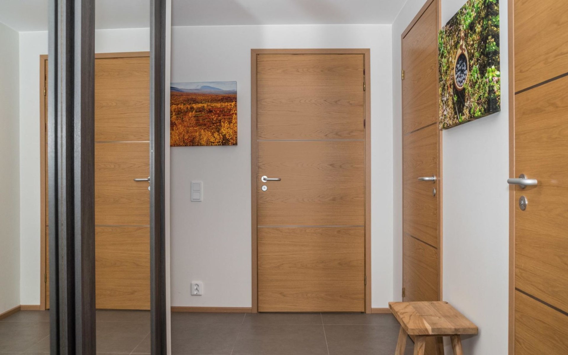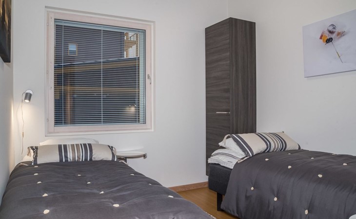 The living room and dining area are spacious, cohesive spaces. You can enjoy the atmosphere by the fireplace in the living room, and you can easily admire the views from the terrace, where's access from the dining area. The modern bathroom with sauna offers gentle steam and you can relax in the bathtub after a day outdoors. The apartment also has a separate toilet with shower which adds practicality when there are more people.