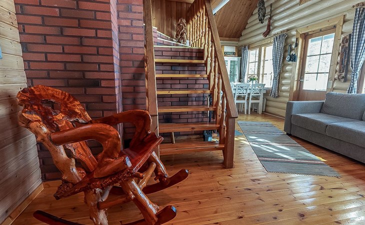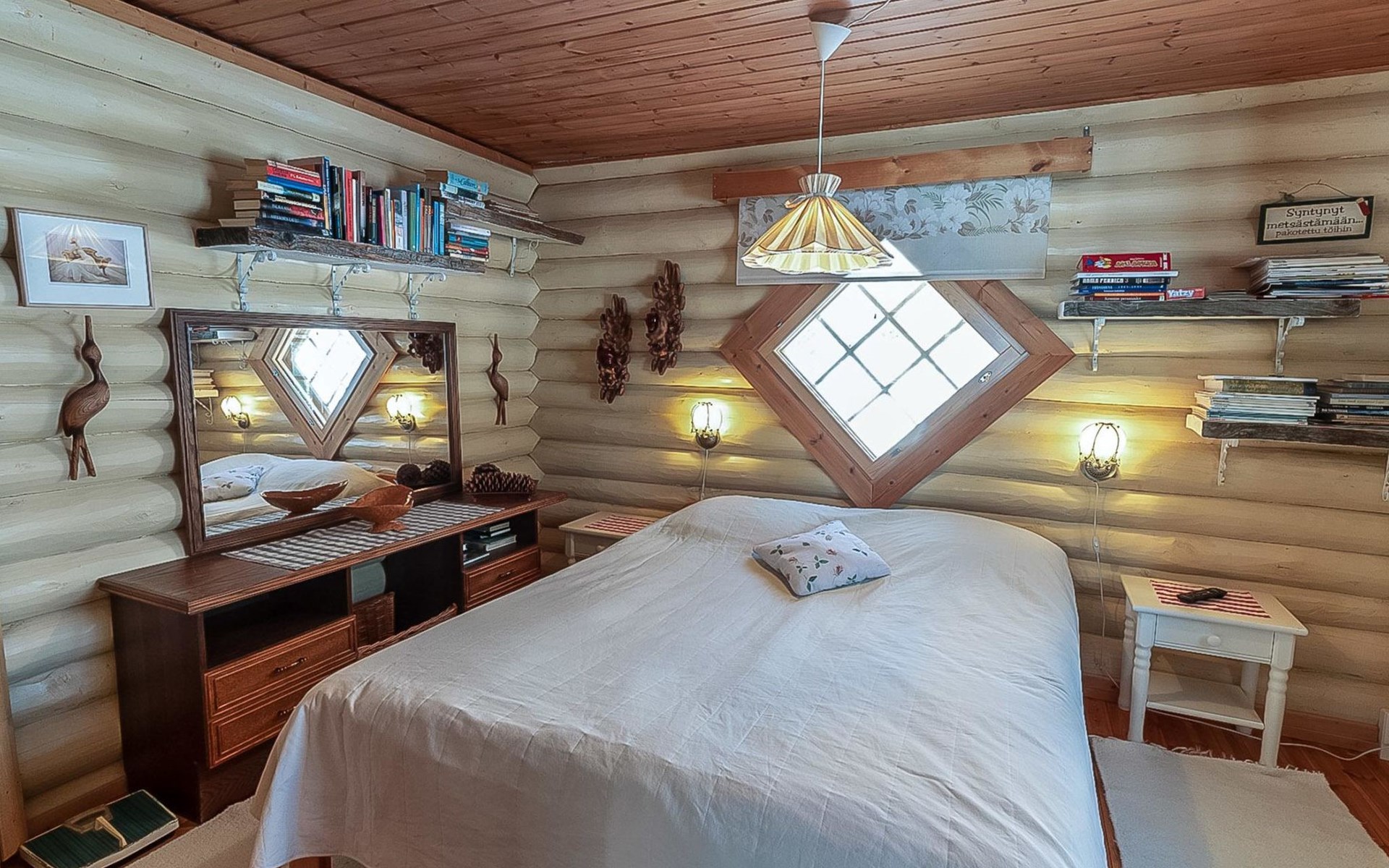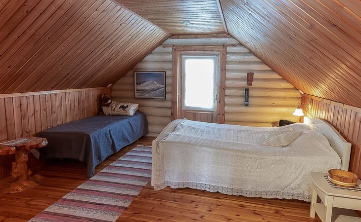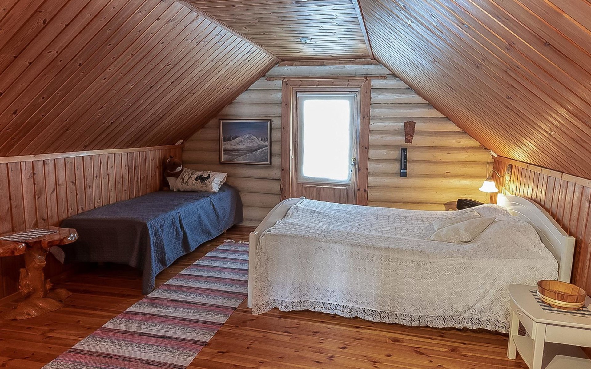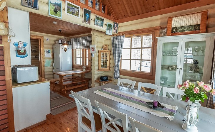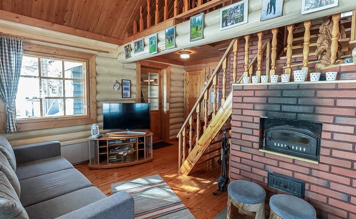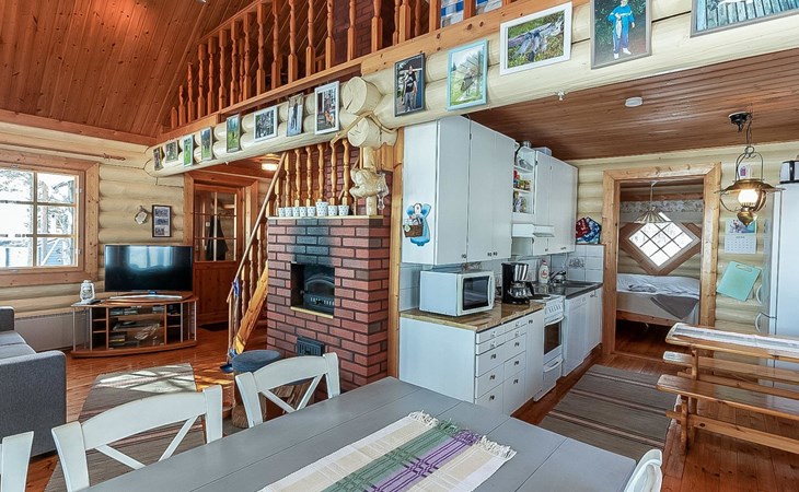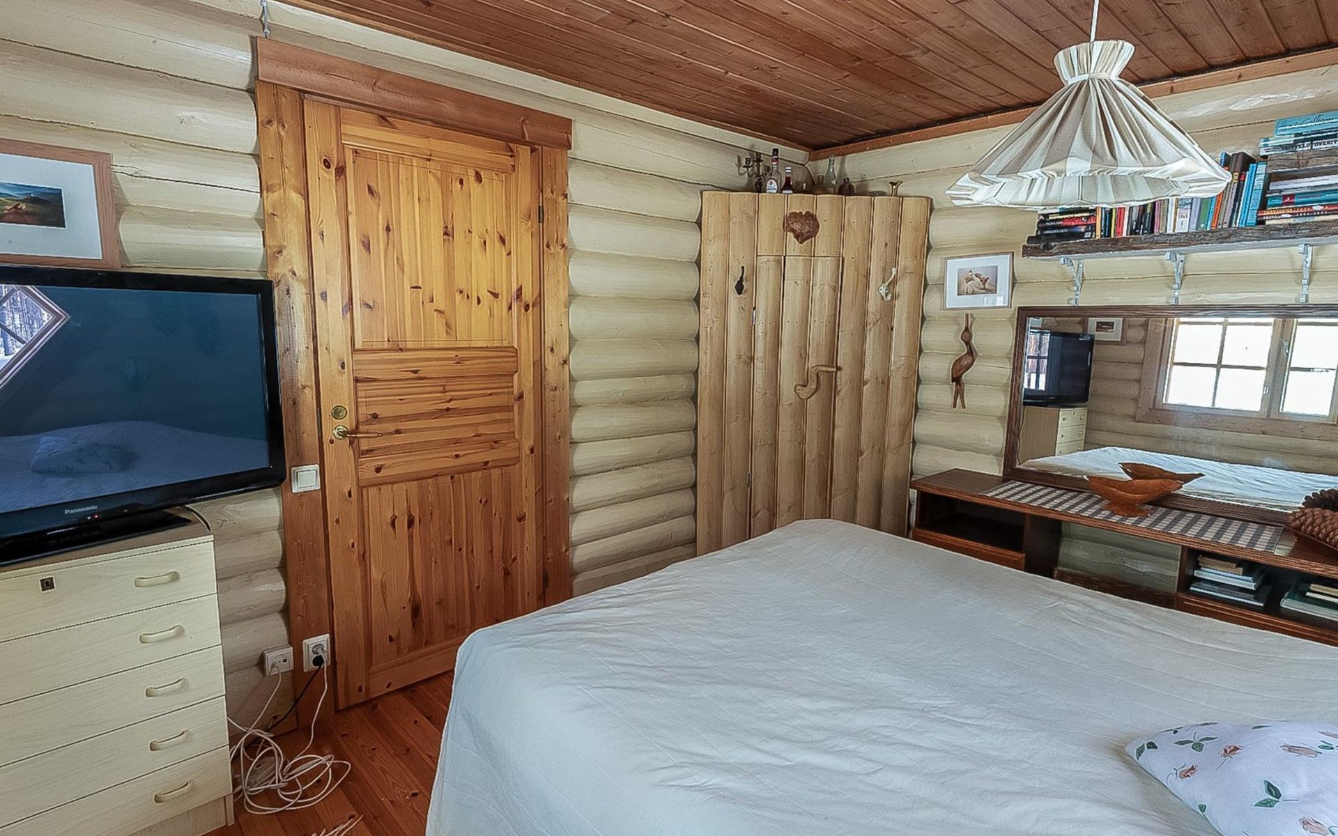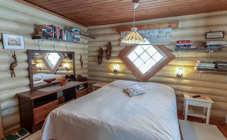 Log cottage 1998, living room/kitchen, bedroom double bed, sleeping loft double bed, sauna (wood-burning stove), washroom, separate WC, open porch, balcony. Additionally, 2 moveable extra beds which can be sited as required.