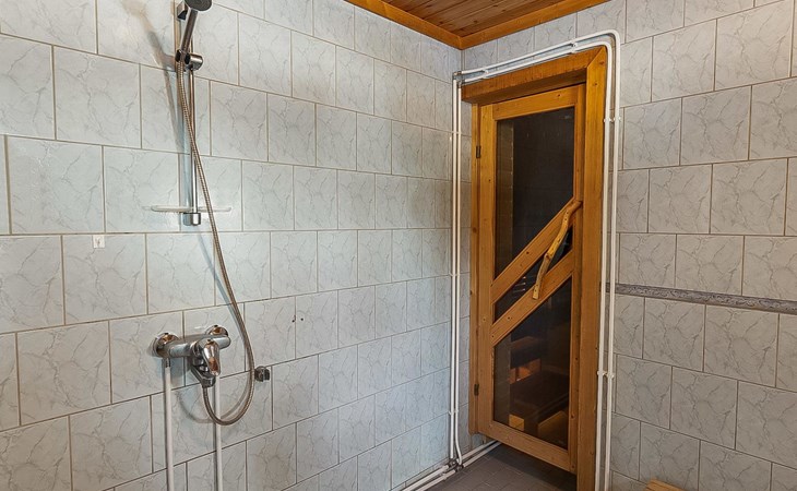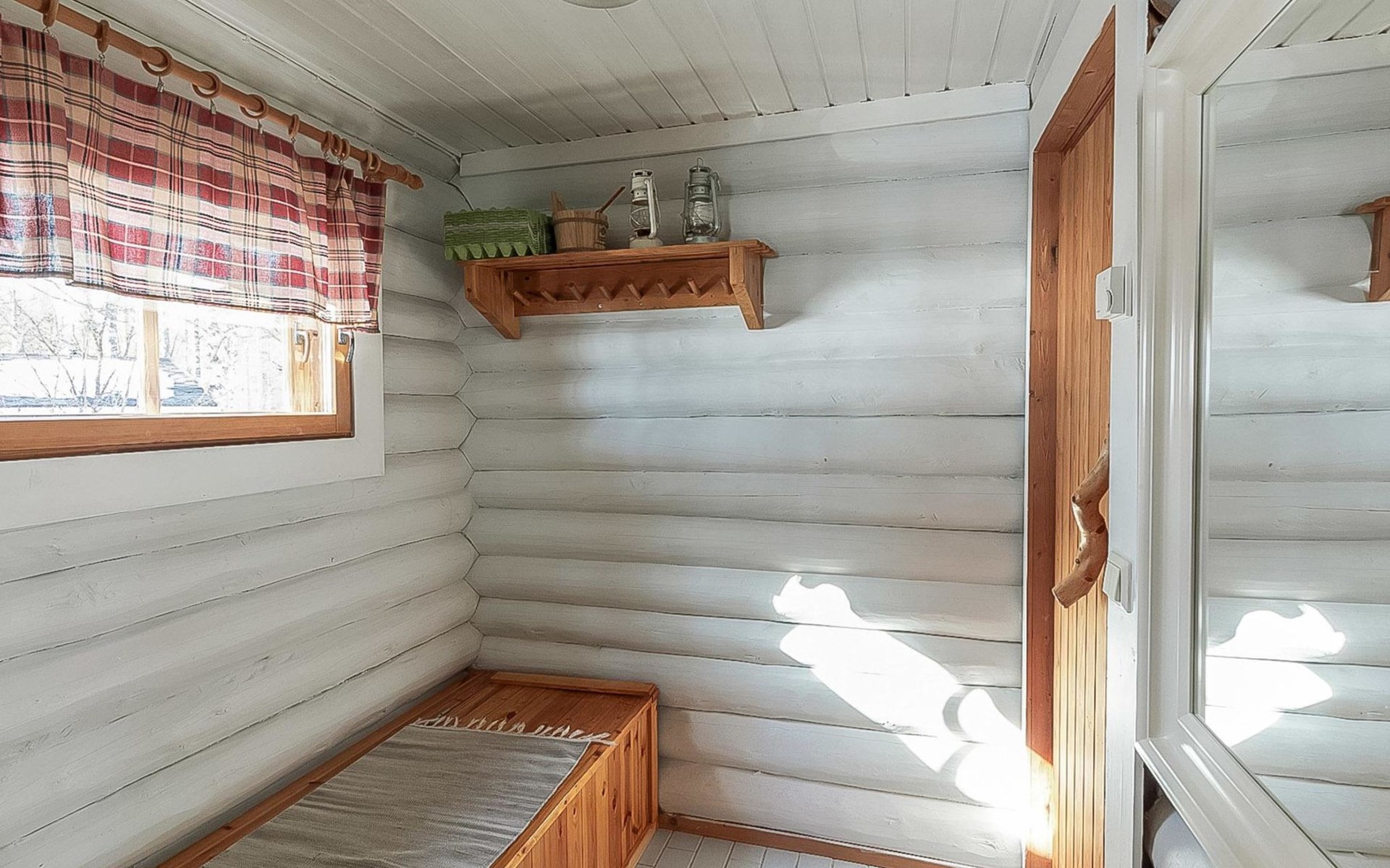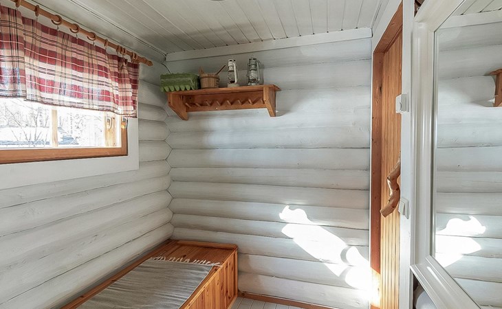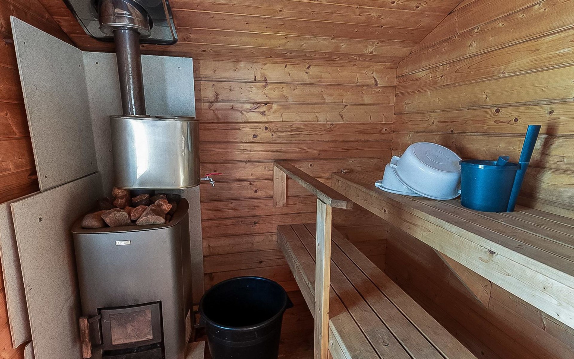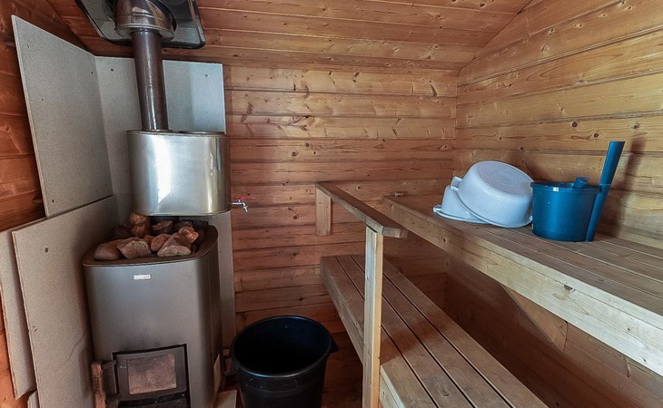 Separate lakeshore sauna 10 m, with ‘steam room’ (wood-burning stove and hot water tank on stove) and open porch. Jetty next to sauna. Lakeshore sauna has neither water pipe nor electricity.