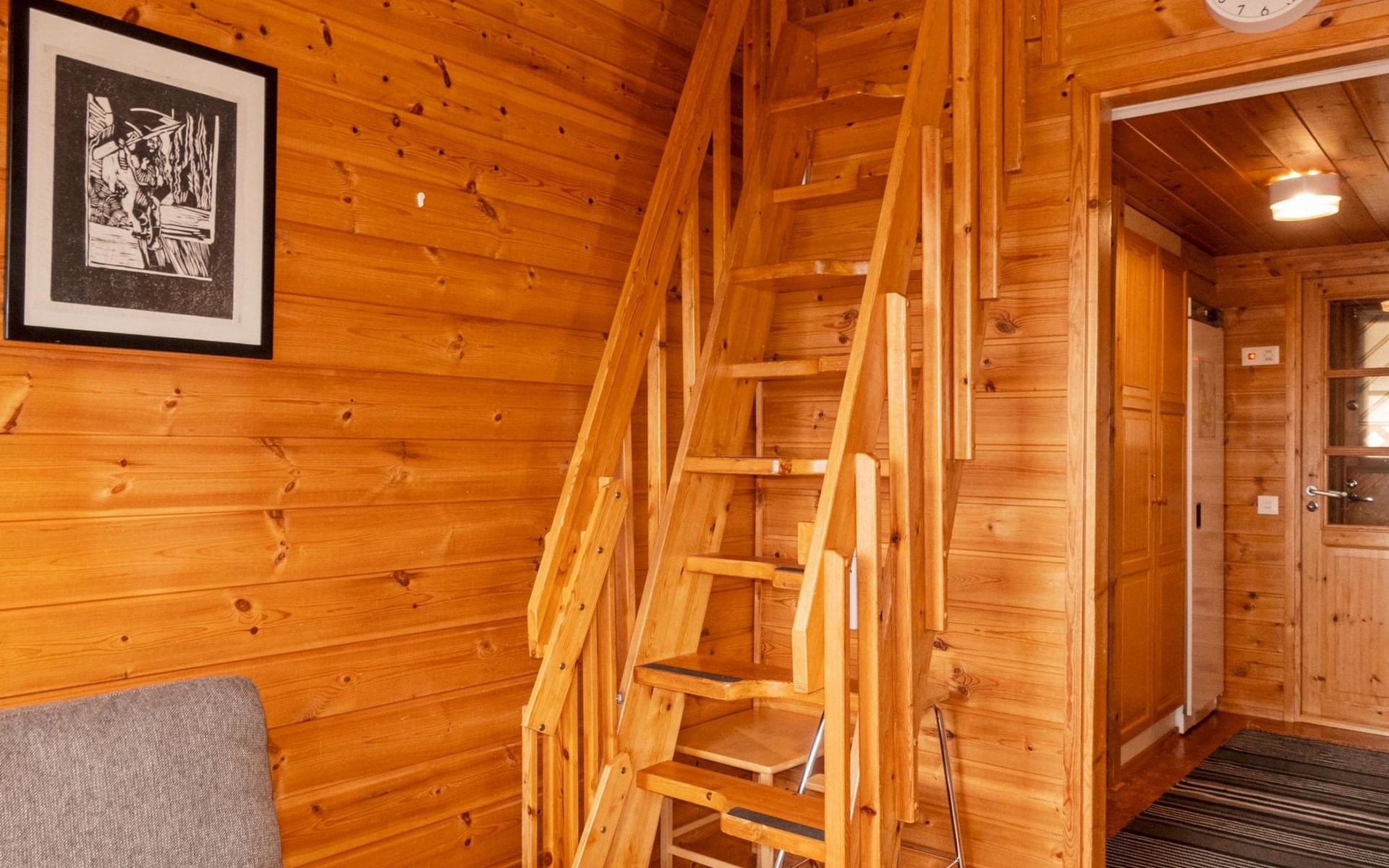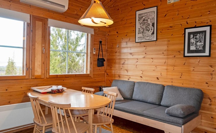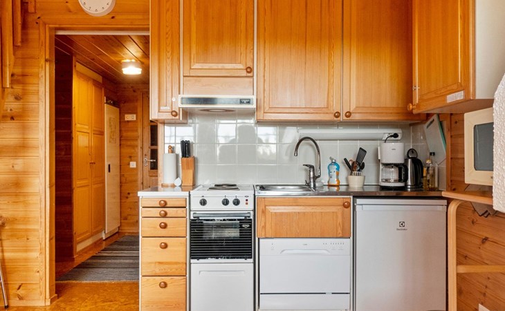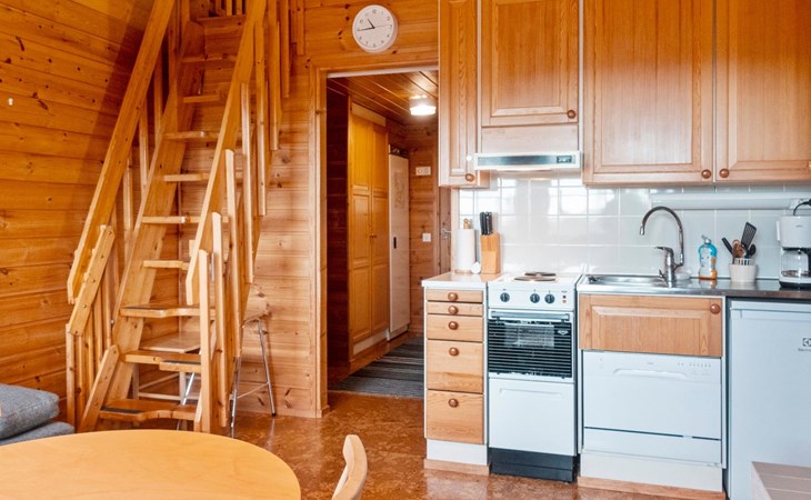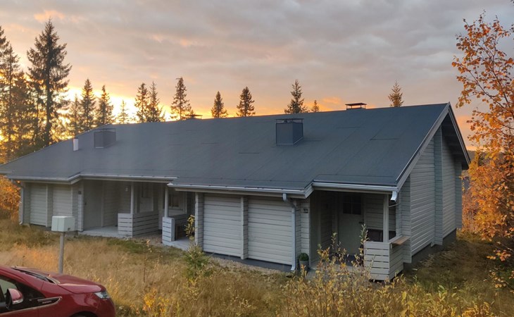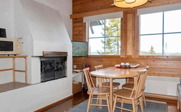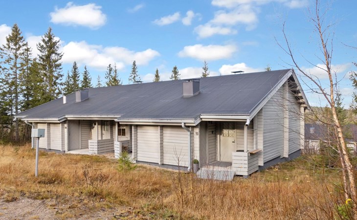 140 km northeast of Oulu, in the Pikku-Syöte ski resort in the Syötekeskus area. End apartment in a planed log terraced house, paneled inside, built in 1985. Sofa bed in the living room and kitchen, double bed and 2 single beds in the loft, steep stairs to the loft, the loft is low and has a sloping ceiling, the maximum height of the loft is 2 m, sauna and washroom/toilet and storage.