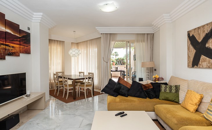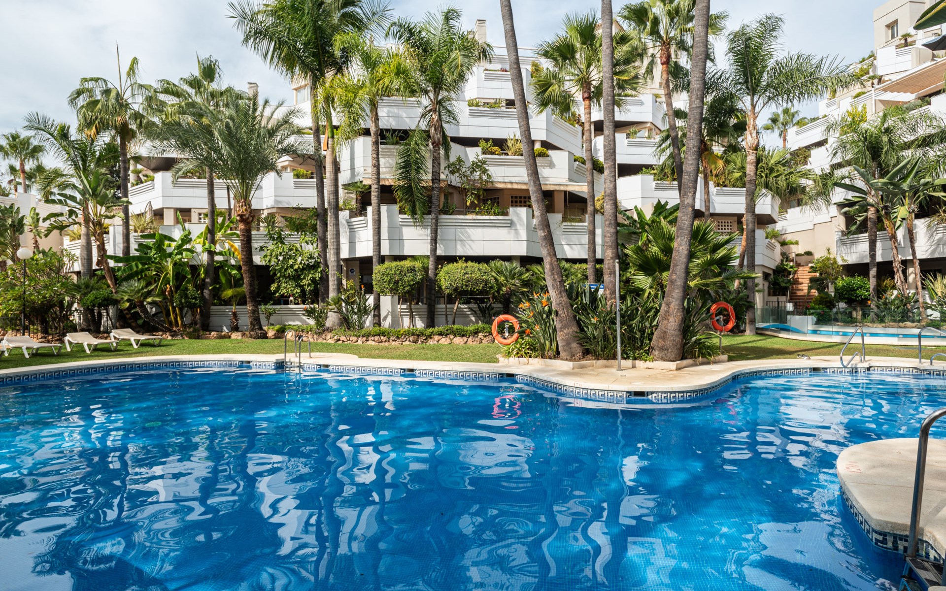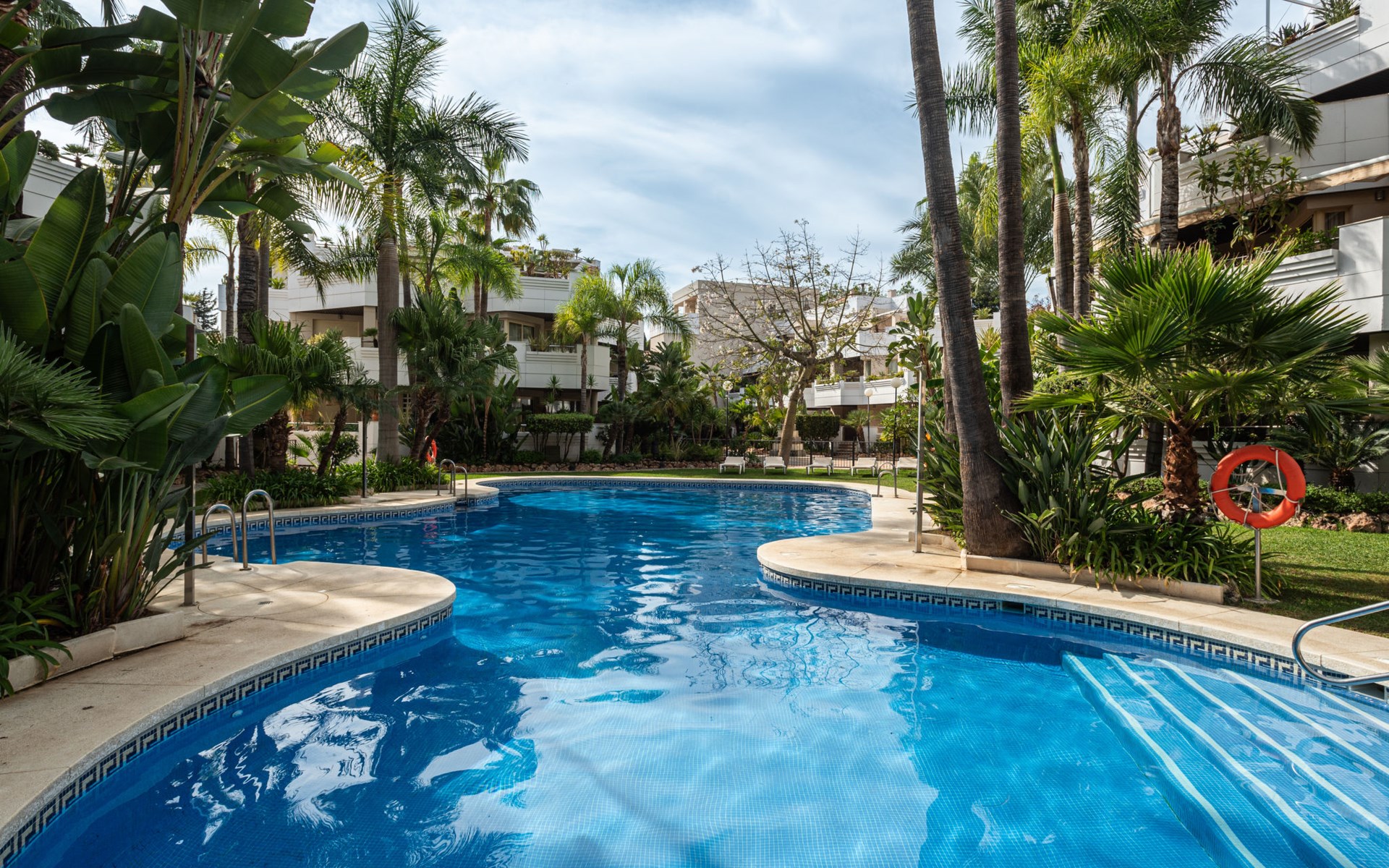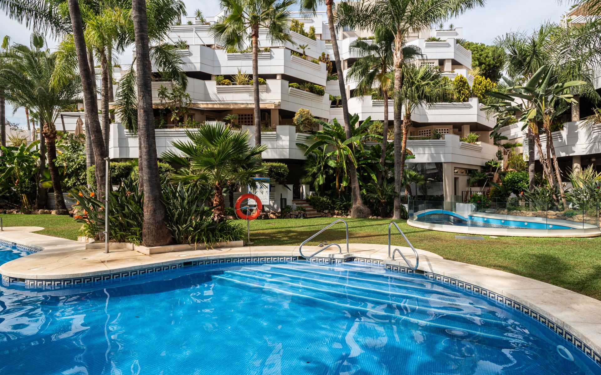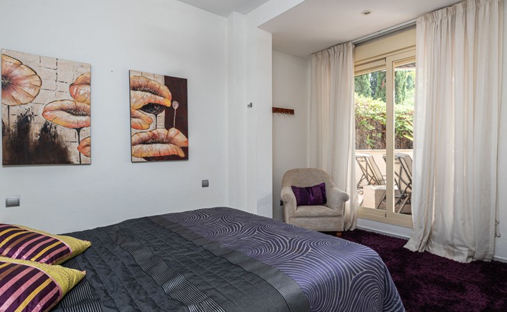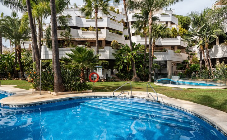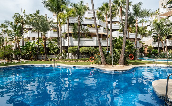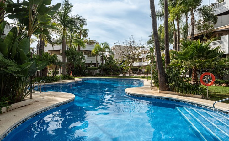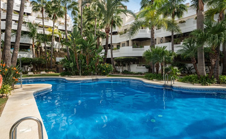 Nueva Andalucia: Cosy, comfortable apartment block "Fuente Aloha". In the resort Nueva Andalucía, 2 km from the centre of Puerto Banús, 7 km from the centre of Marbella, in a quiet, sunny position, 2.3 km from the sea, 2.3 km from the beach. For shared use: property (fenced), garden, 2 swimming pools heated (24 x 10 m, depth 130 - 210 cm, seasonal availability: 01.Jan. - 31.Dec.) with internal staircase. Outdoor shower. In the complex: sauna, fitness room, steam room, relaxation room, lift. Roofed, parking space n 81. Supermarket 500 m, restaurant 100 m, bus stop "Los Dragos" 650 m, sandy beach 1.2 km. Golf course (18 hole) 1.8 km. The owner does not accept any youth groups. There is a heated indoor pool size 8x4 m. depth: 0,8-1,5m.